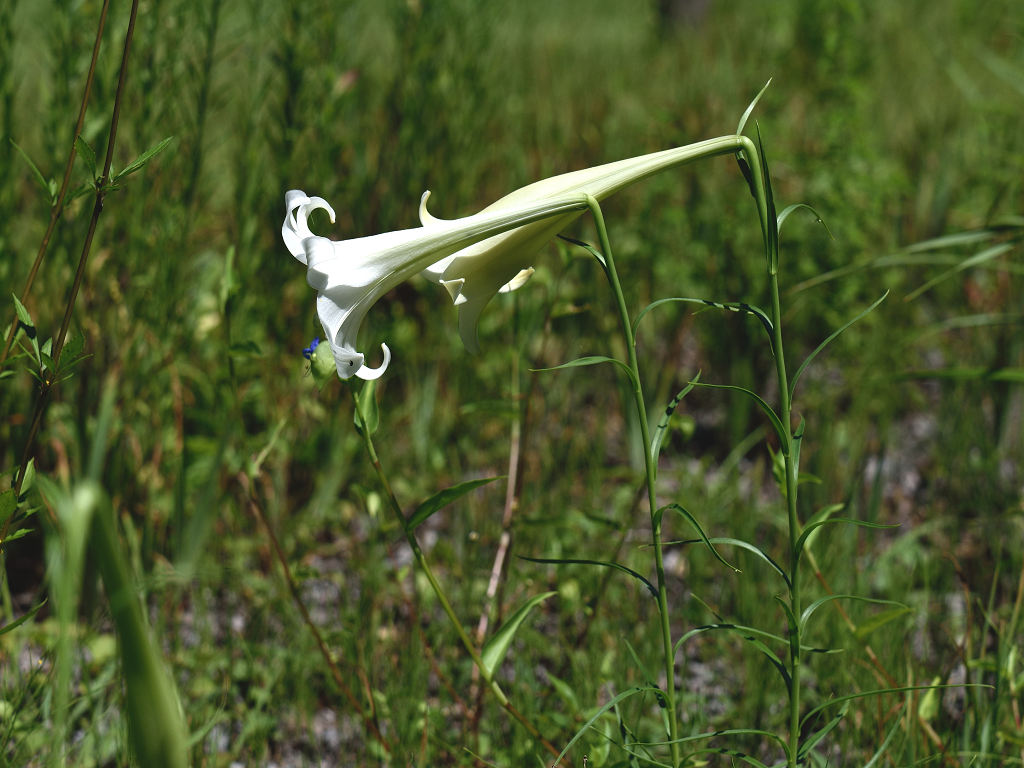 テッポウユリ」に比べ葉が細い 、「シンテッポウユリは種子でも増える(テッポウユリは球根)