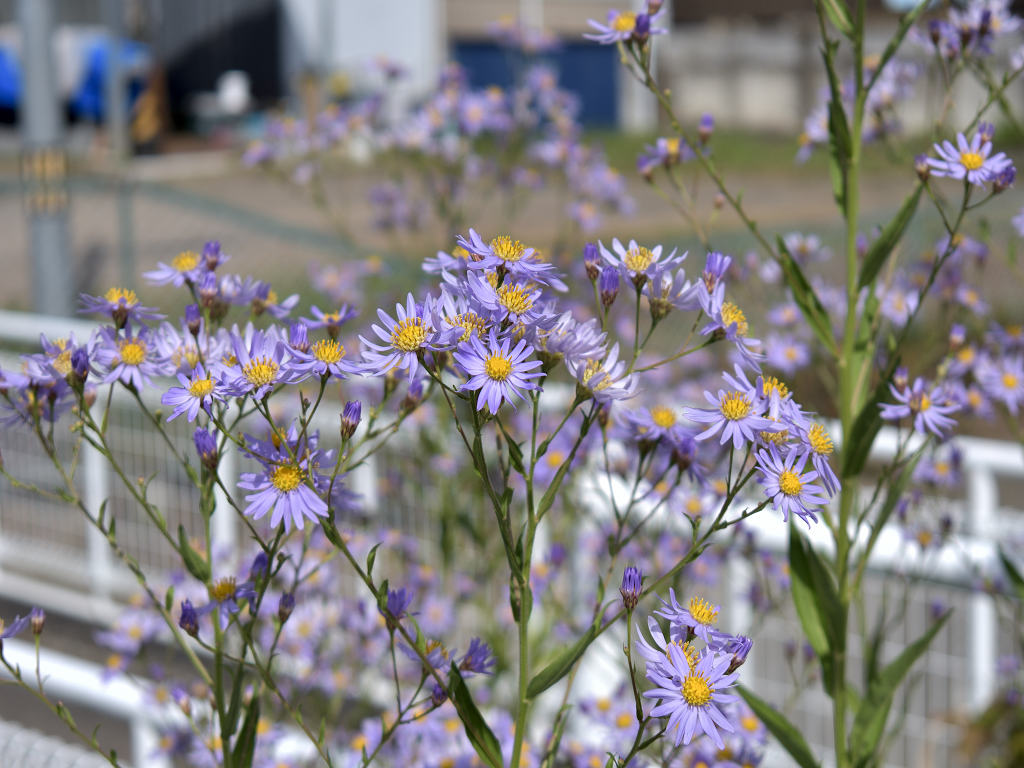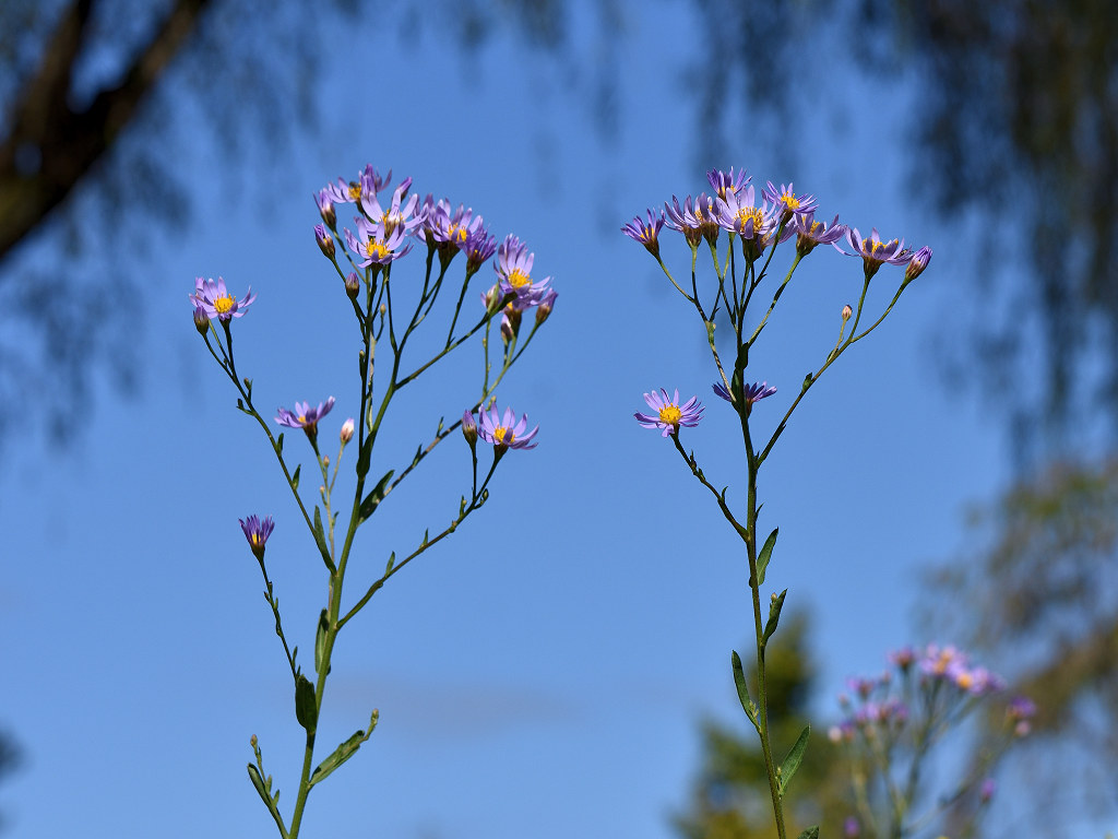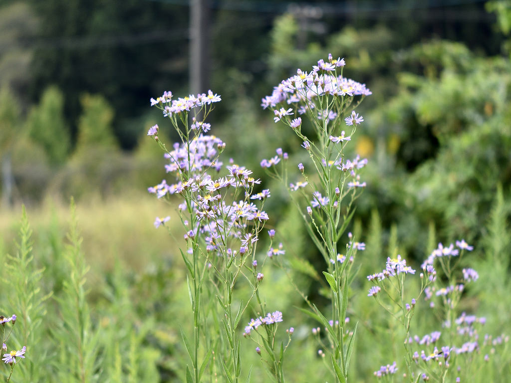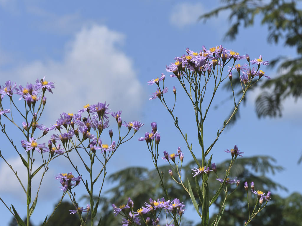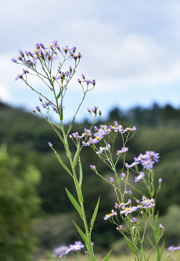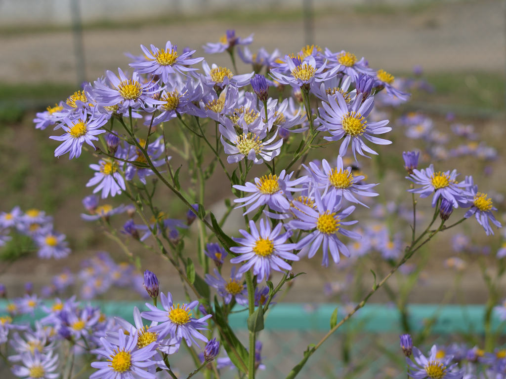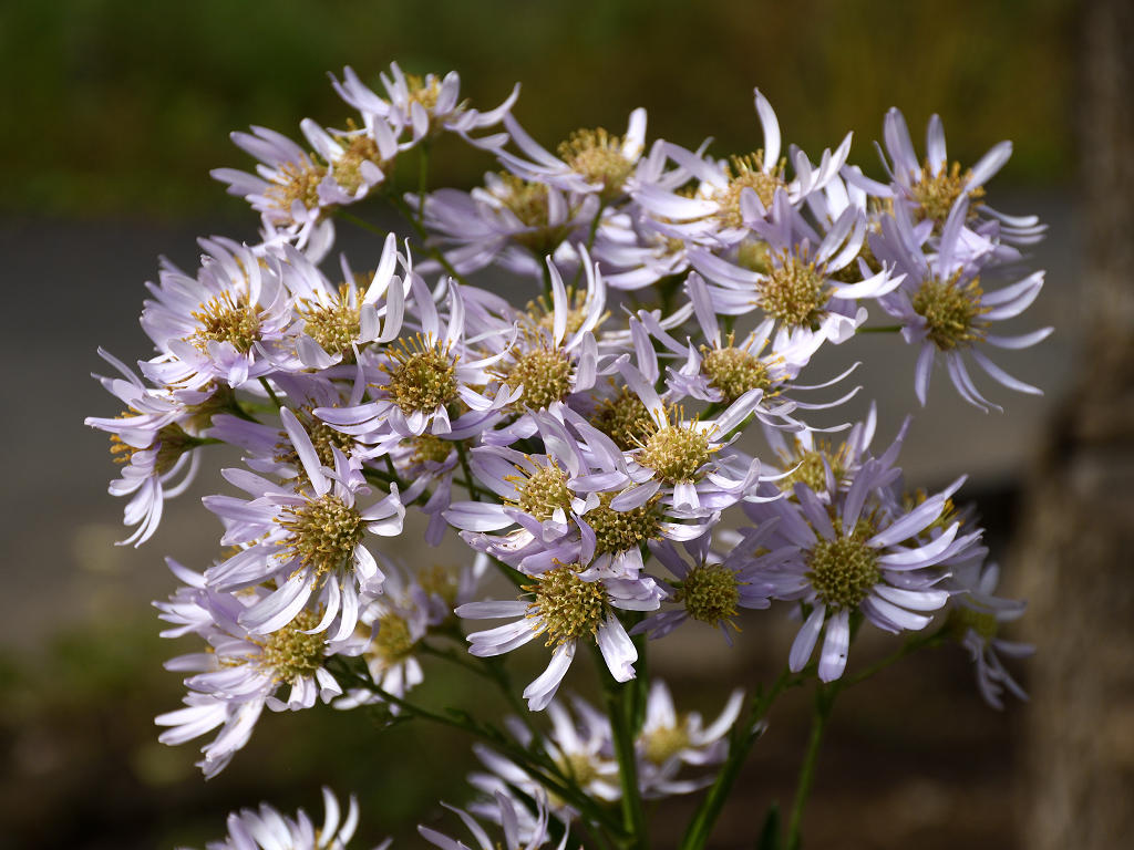 茎の上部に、花径2.5〜3.5p程度の頭花を、散房状に多数咲かせる 花は、薄紫の舌状花と、中心部分の黄色い筒状花から成る集合花