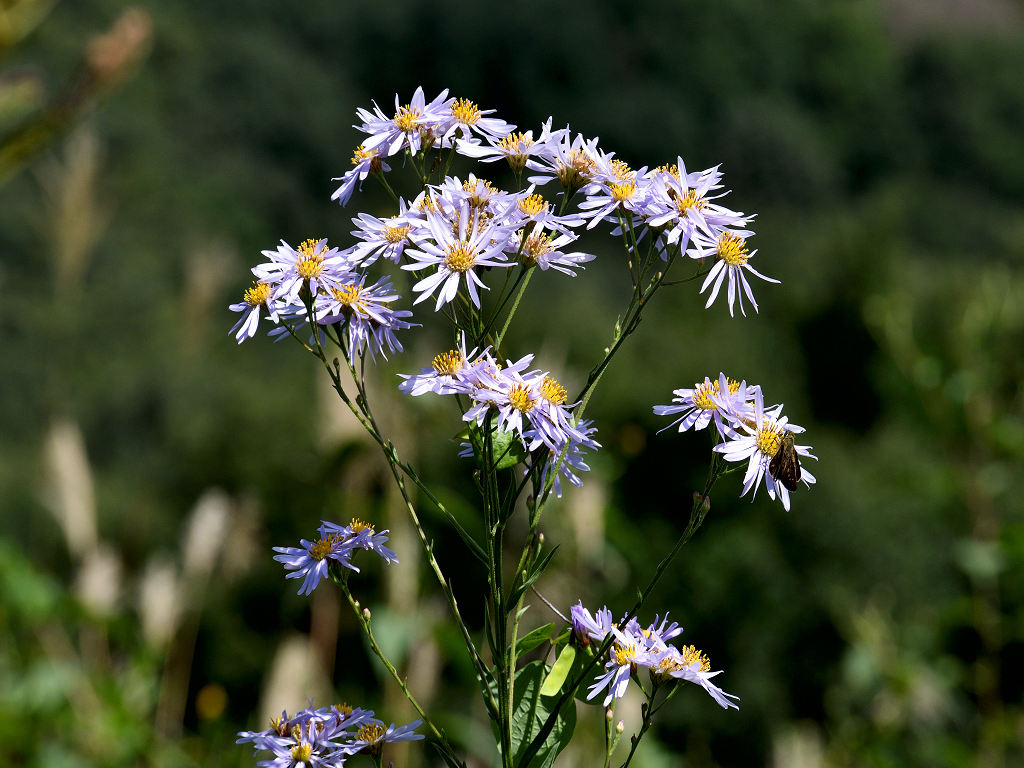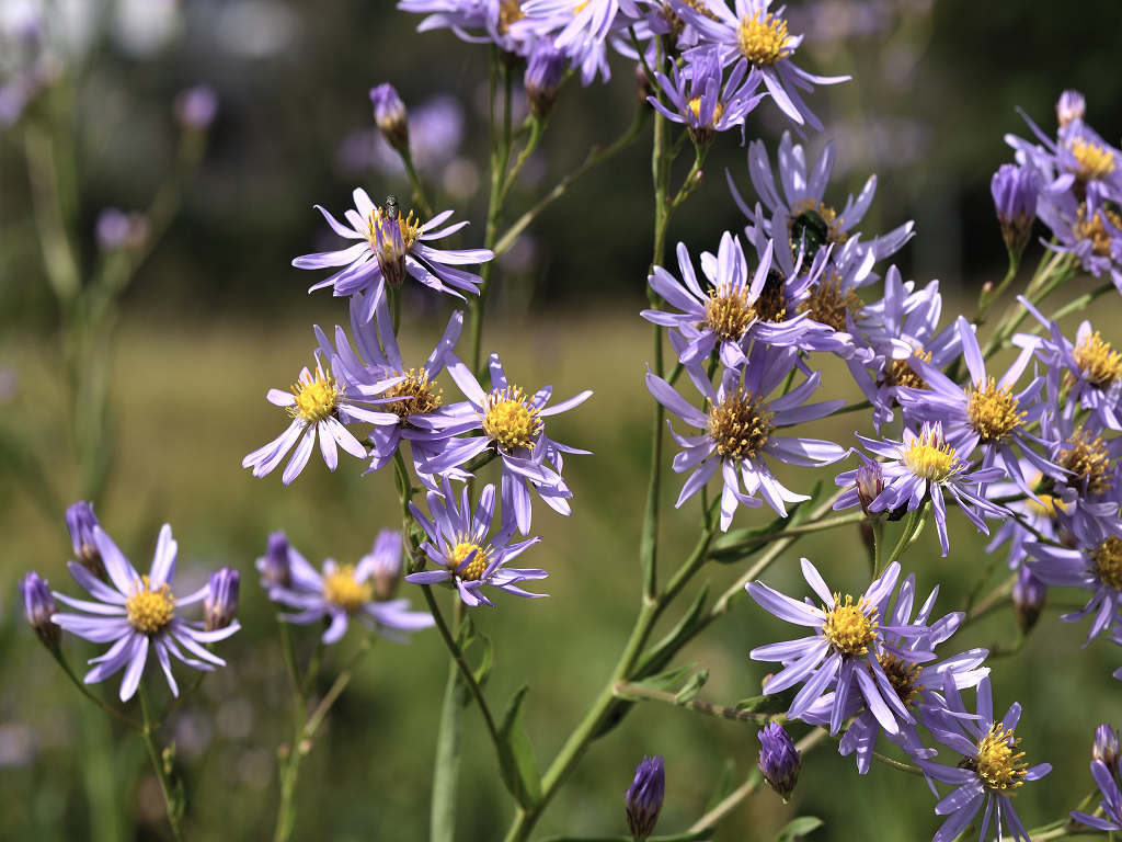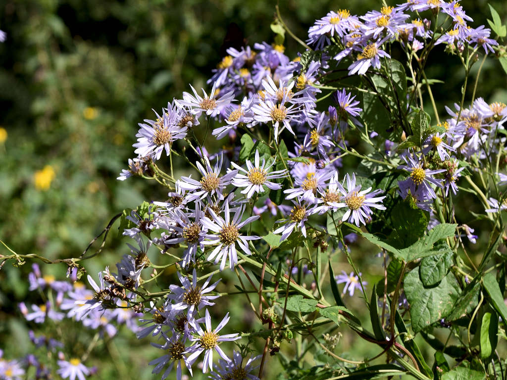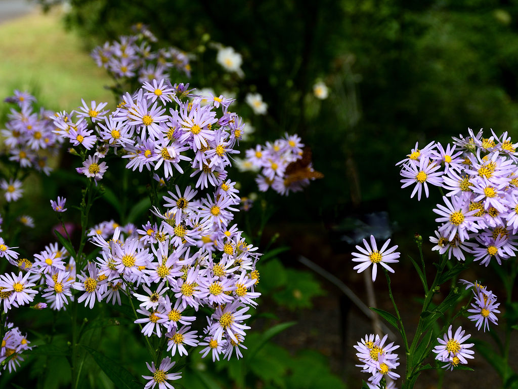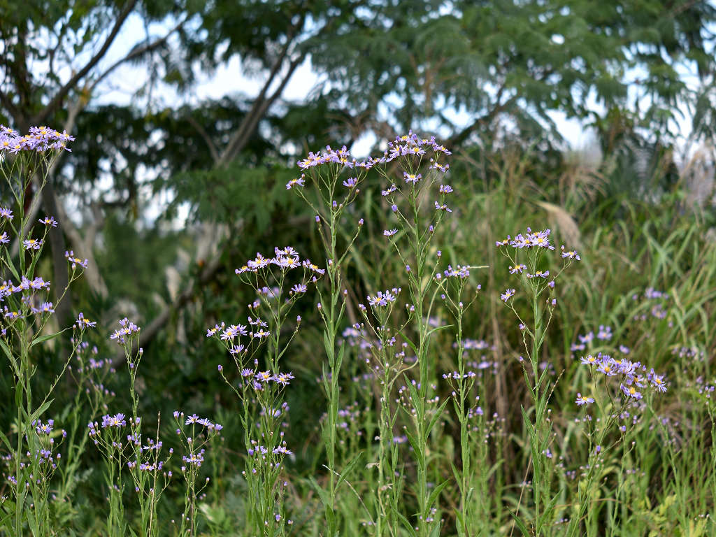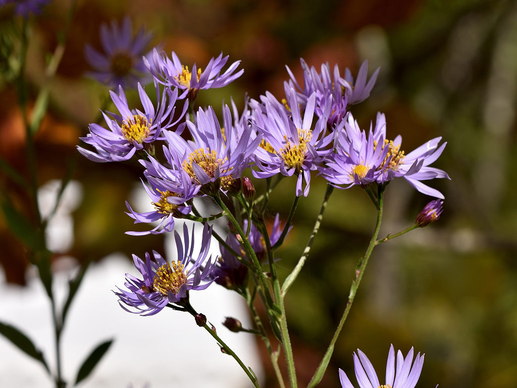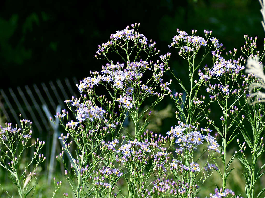 茎の上部に、花径2.5〜3.5p程度の頭花を、散房状に多数咲かせる 花は、薄紫の舌状花と、中心部分の黄色い筒状花から成る集合花