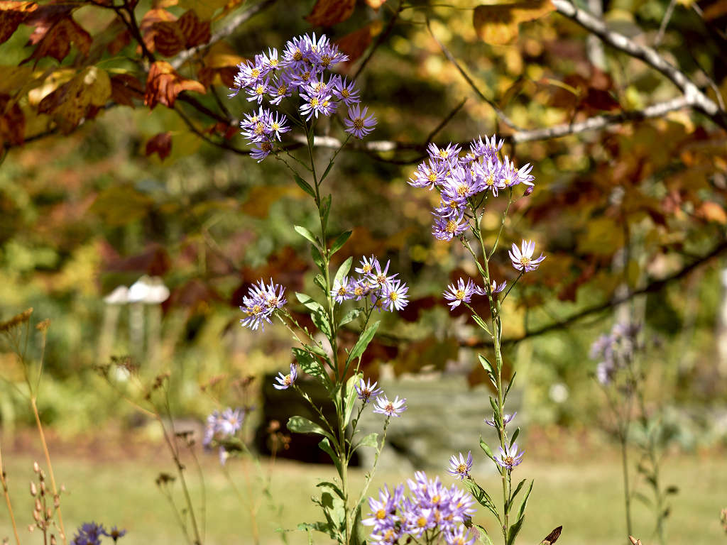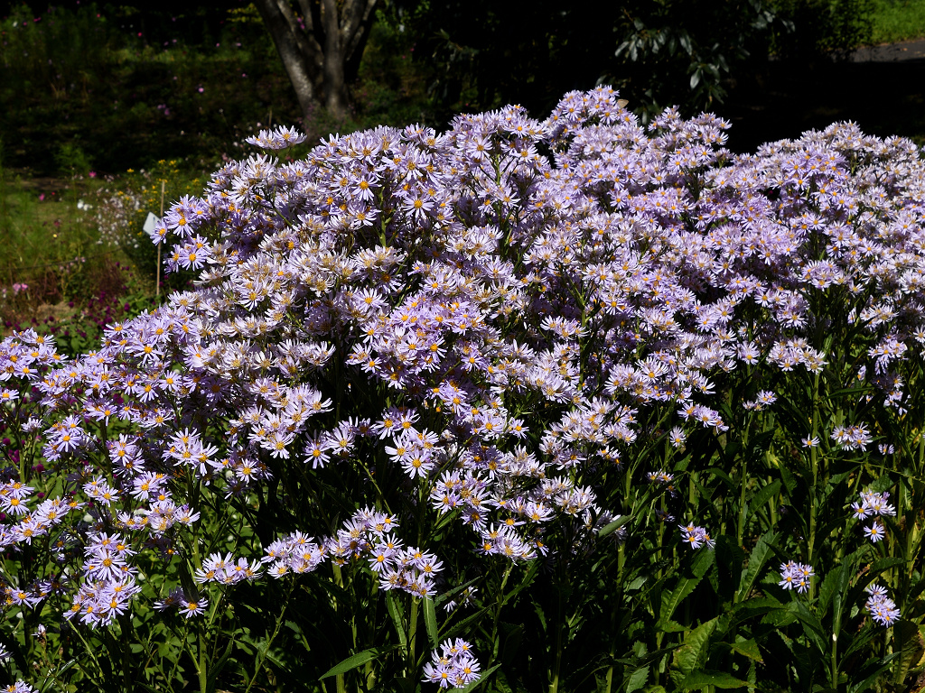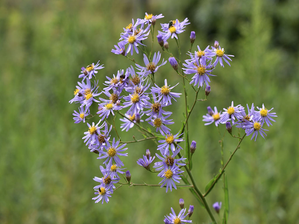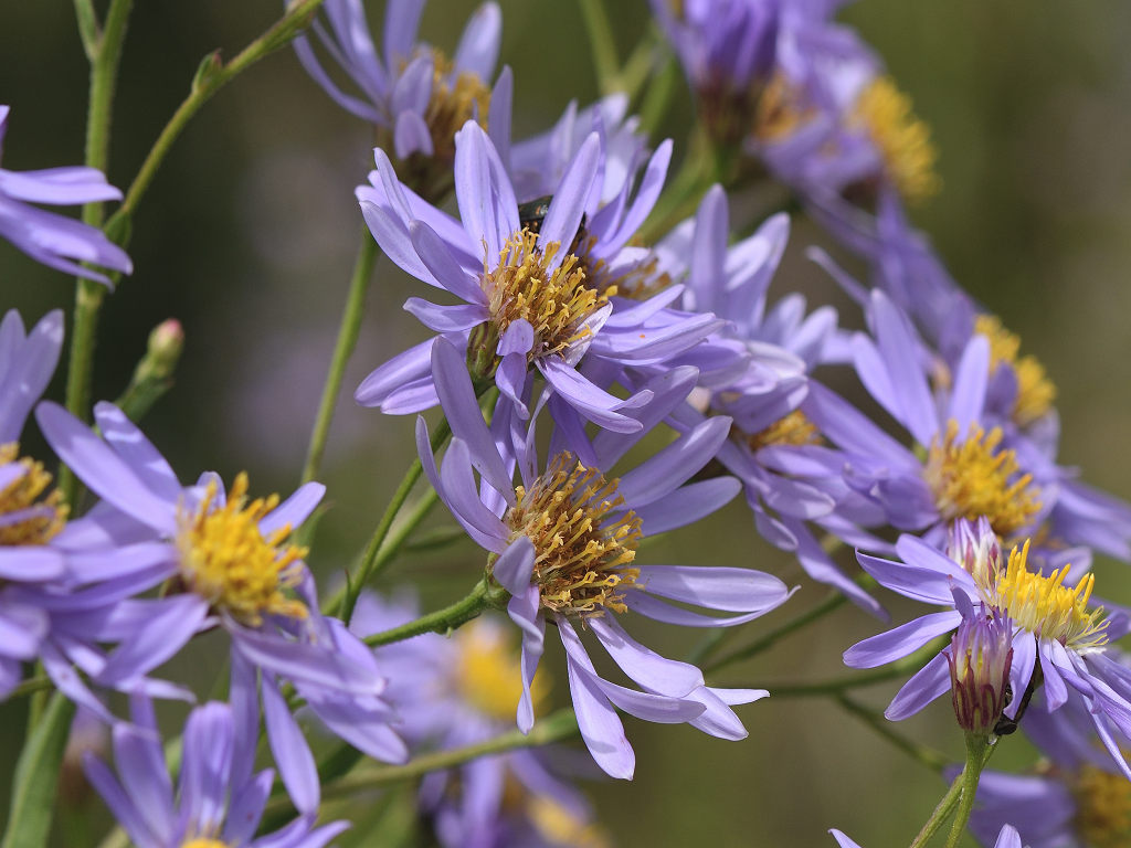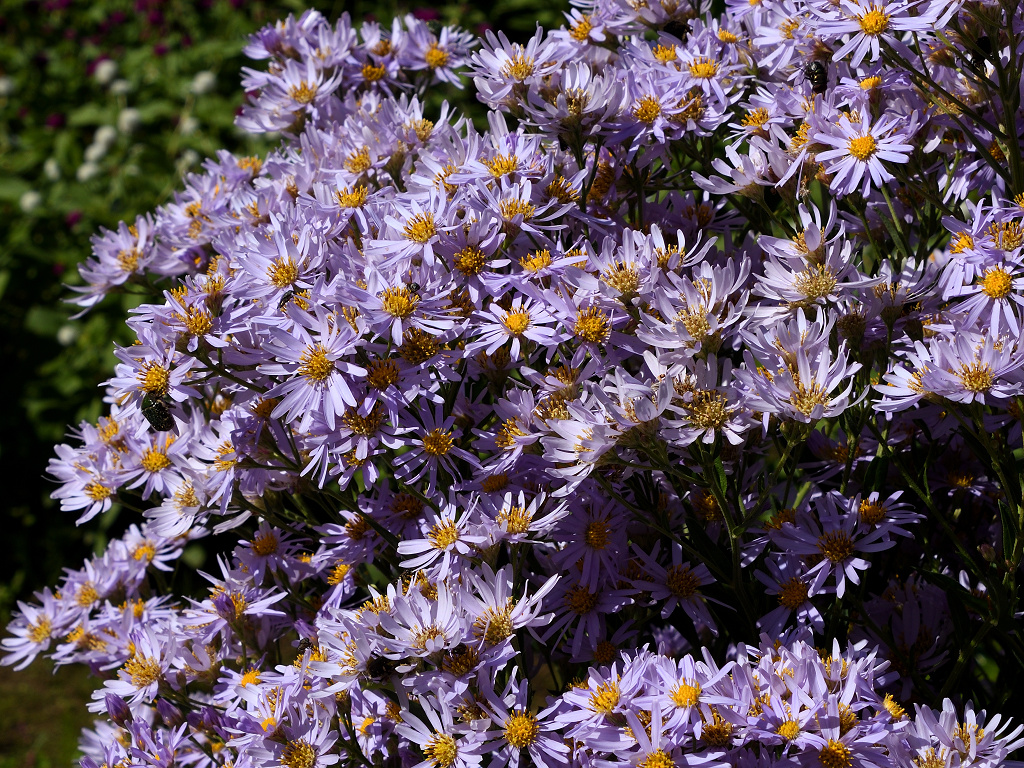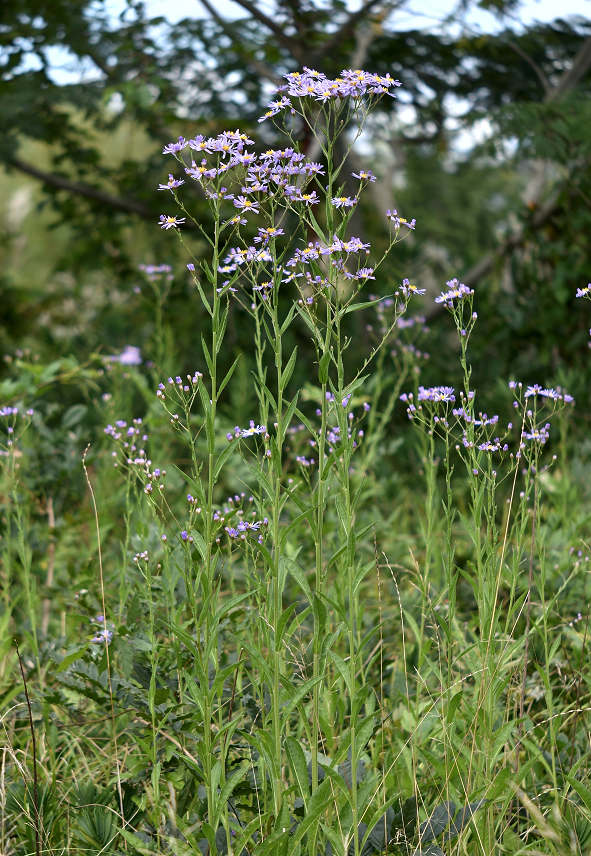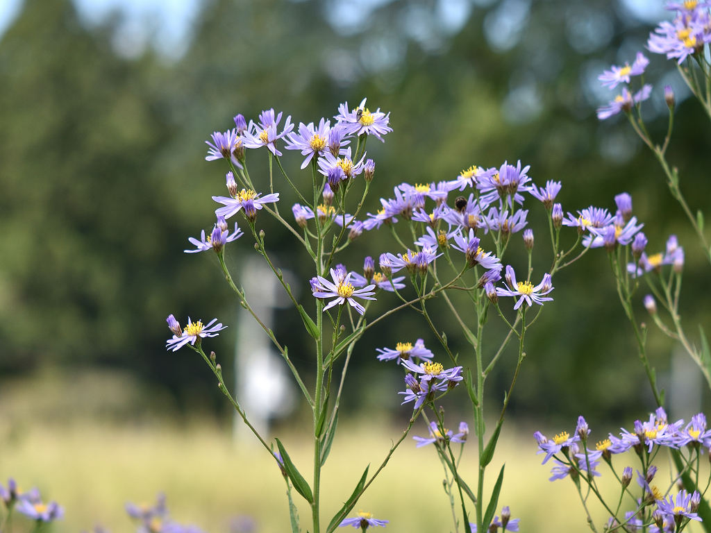 茎の上部に、花径2.5〜3.5p程度の頭花を、散房状に多数咲かせる 花は、薄紫の舌状花と、中心部分の黄色い筒状花から成る集合花