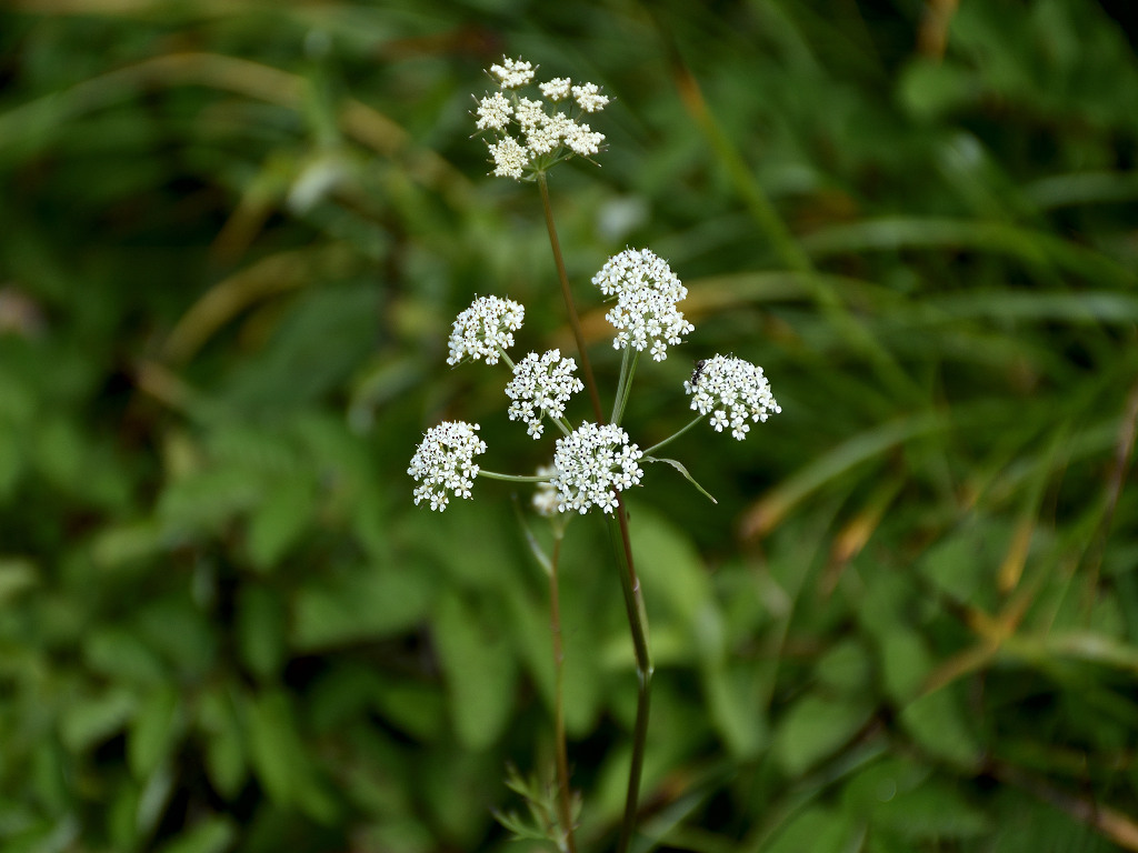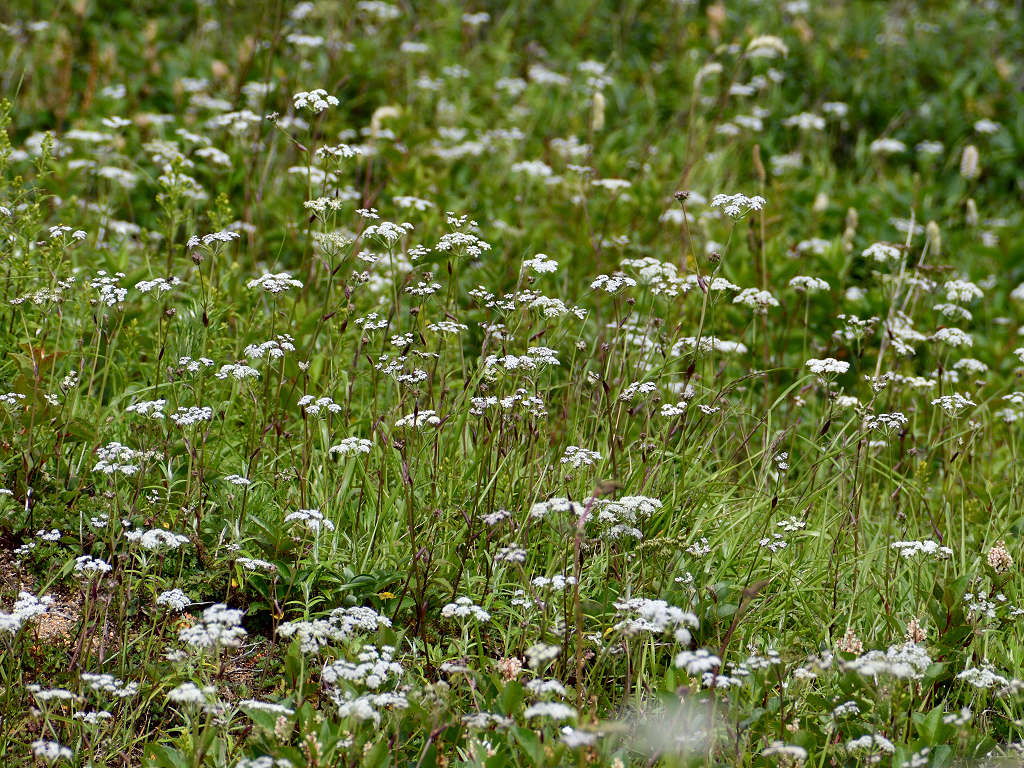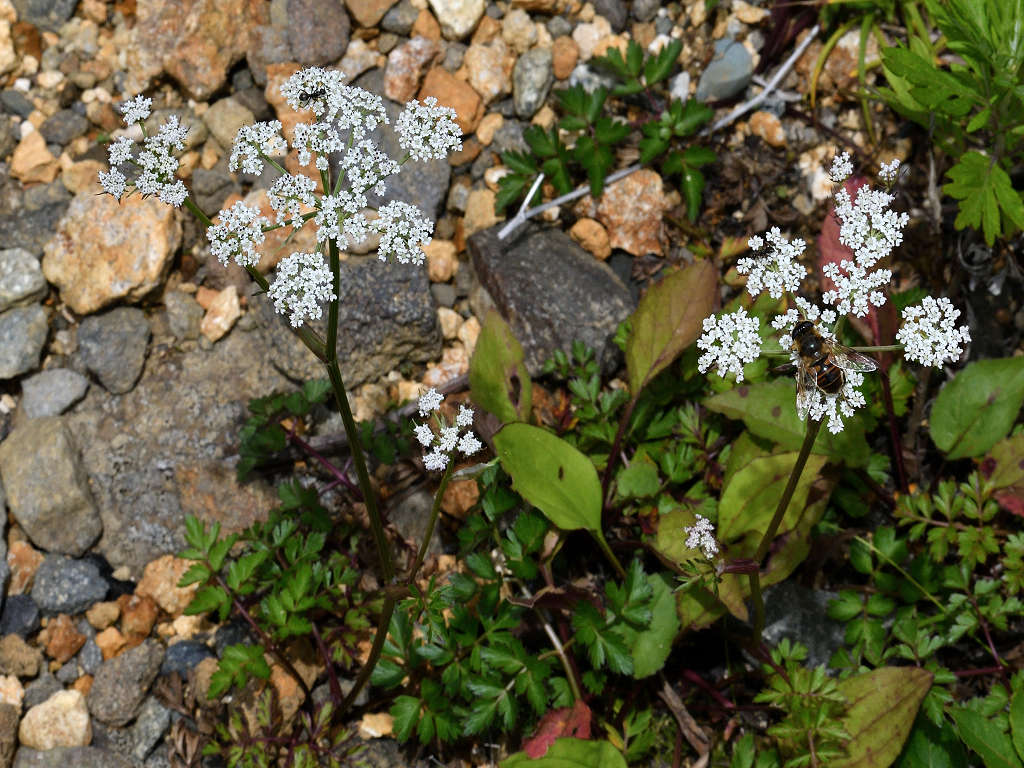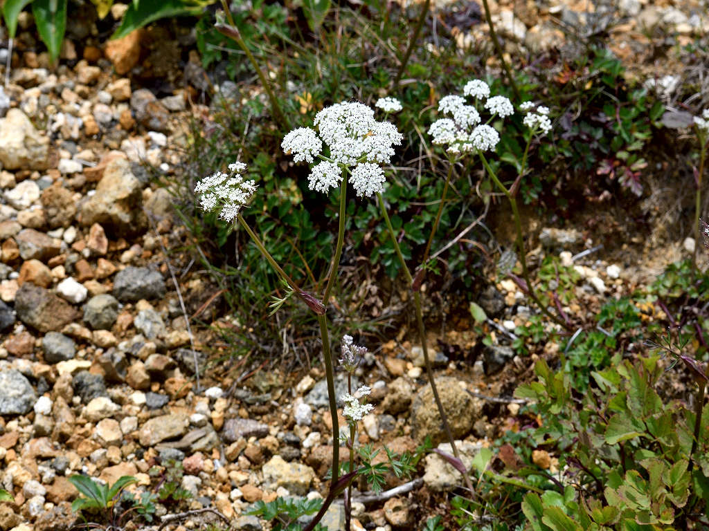 白色の花を多数 「ミヤマセンキュウ」との違いは小葉の終裂片の先が尾状に伸びず、葉が根際にまとまってつくことで区別