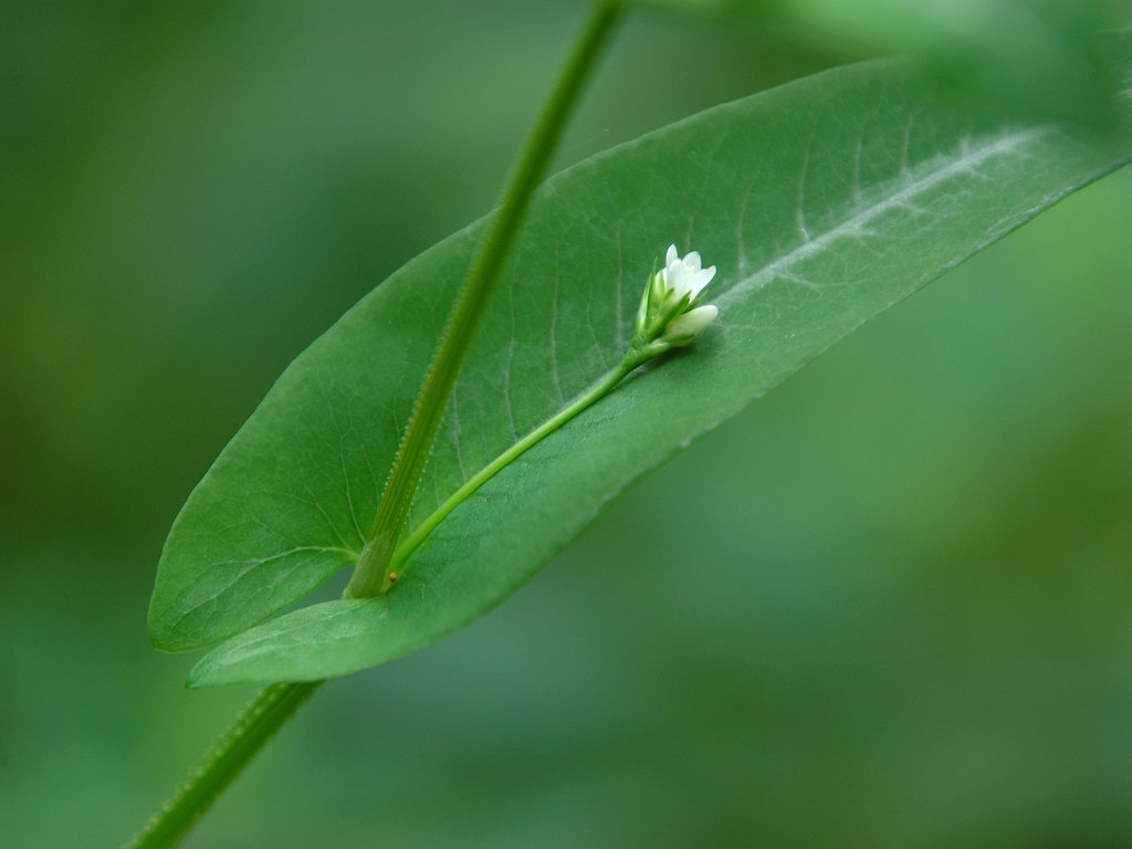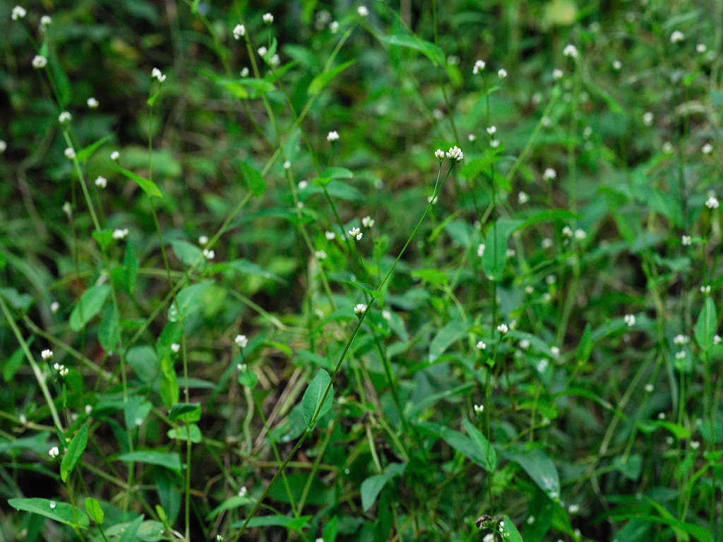 茎は四角形で稜に逆刺がある 枝先に花を球状につける 葉は互生 基部が矢じり形で茎を抱く