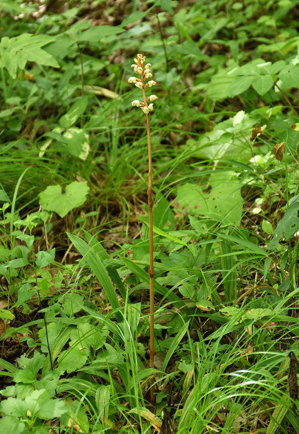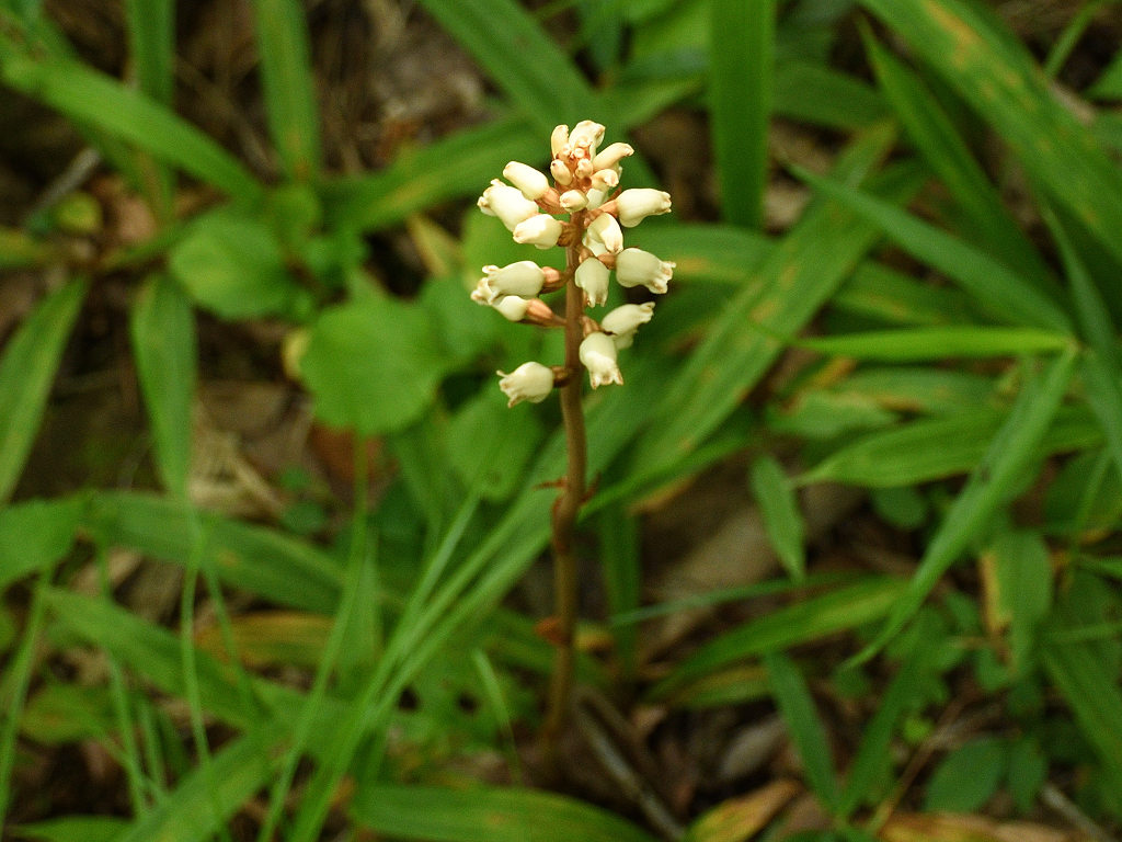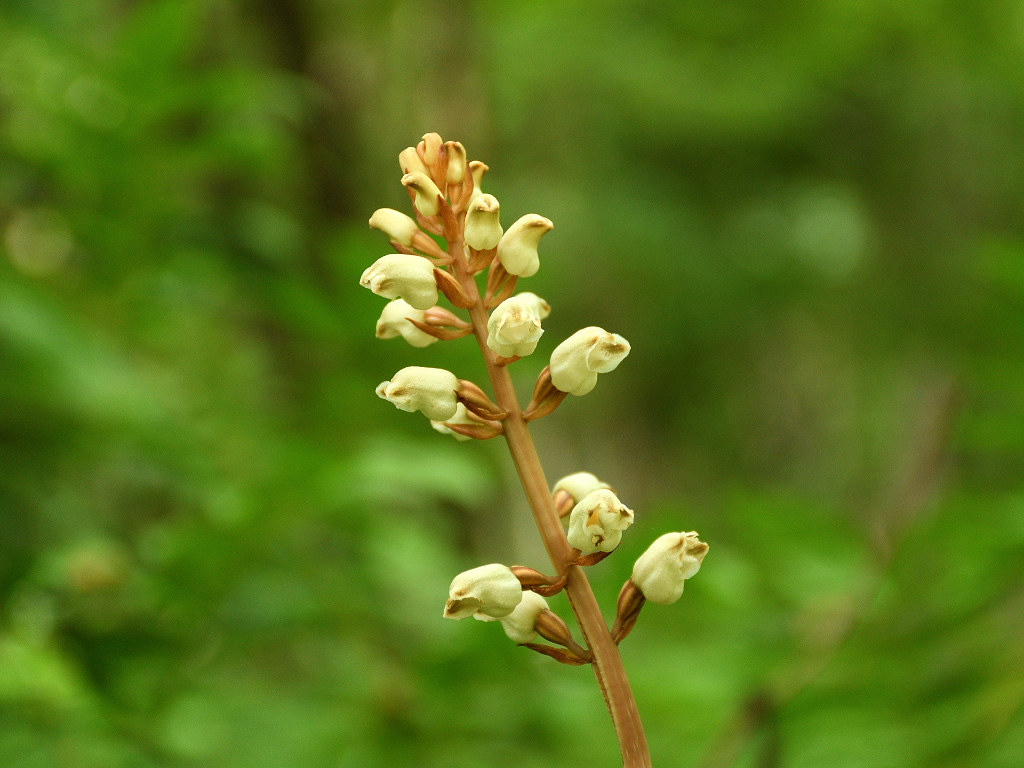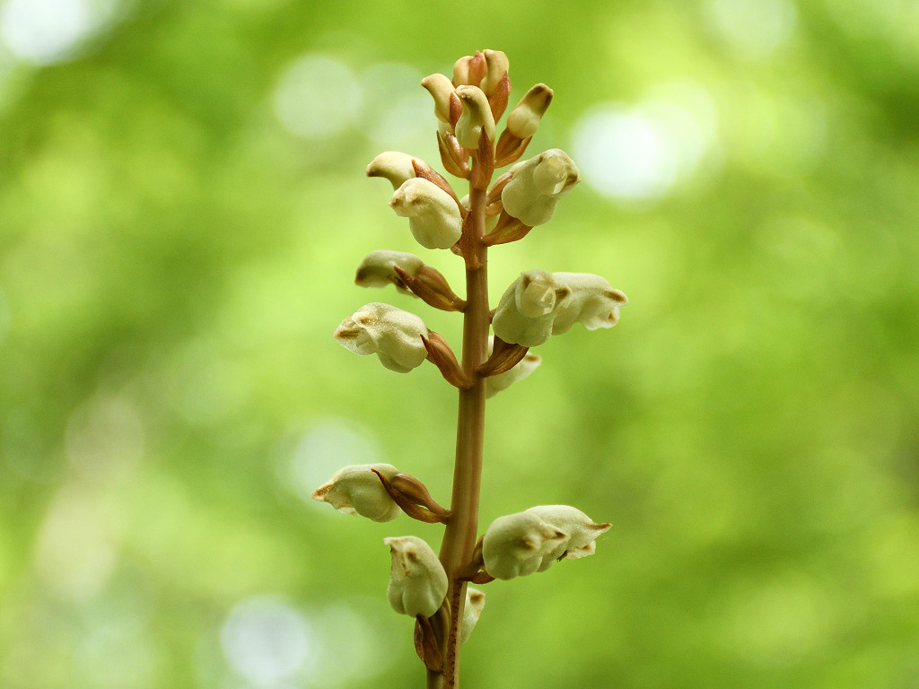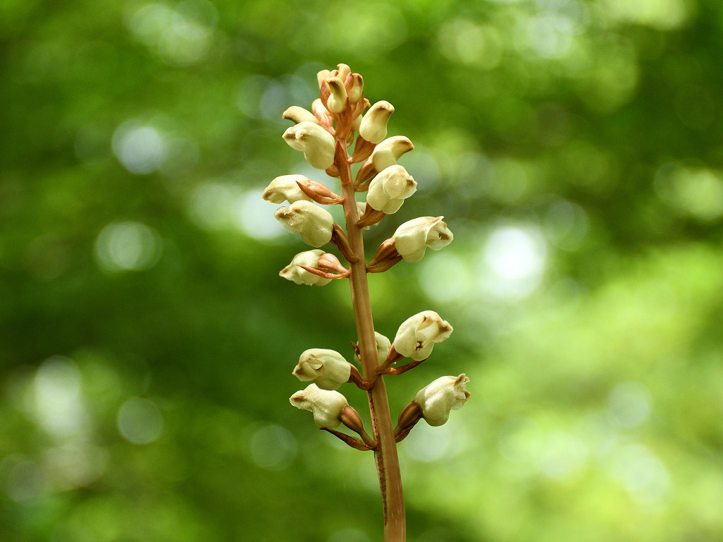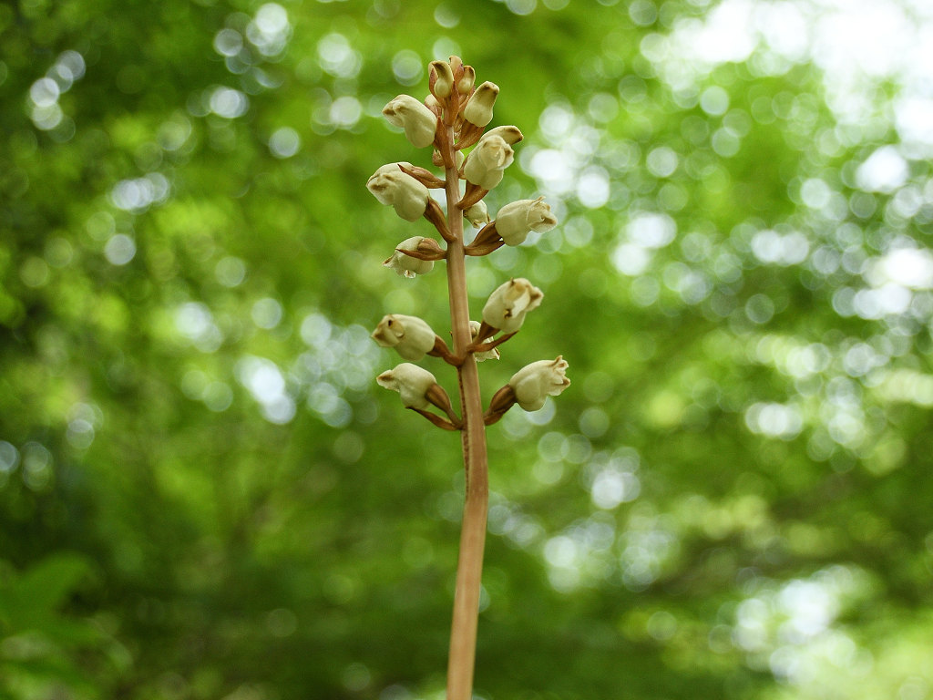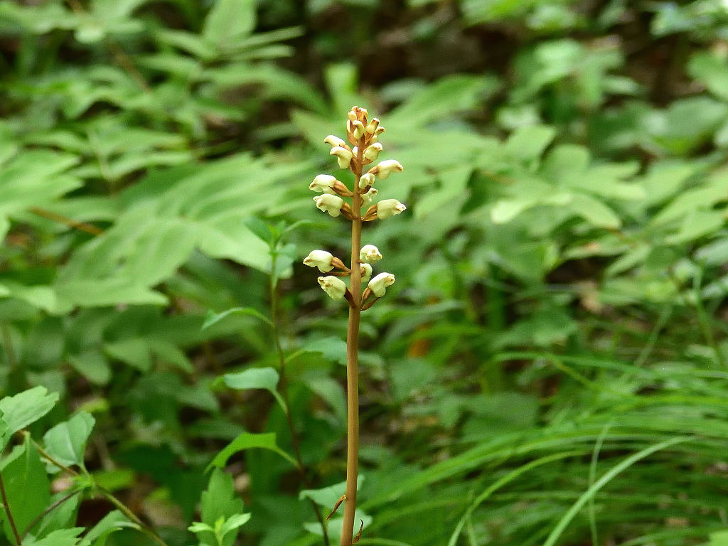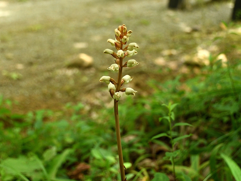 オニノヤガラの花が白色ので、花数も20個以下と少なく、茎や子房が淡い褐色です