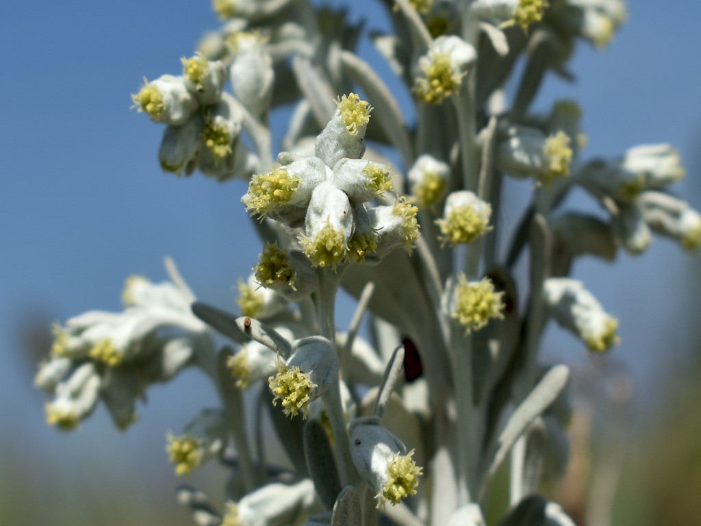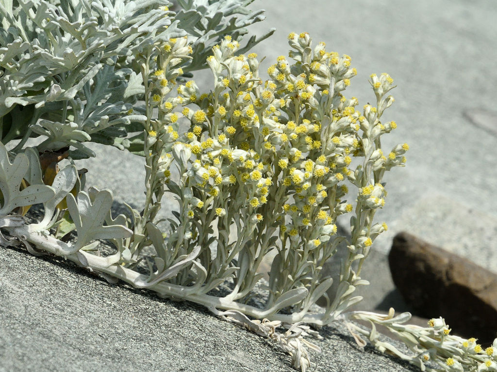 日当たりのよい海岸の砂地に生える多年草 体が綿毛におおわれ、雪のよう白い 葉は羽状に中裂し、厚みがある。裂片は2〜3対あり、先はとがらない 黄色の頭花を多数つける。頭花はすべて筒状花で舌状花はない