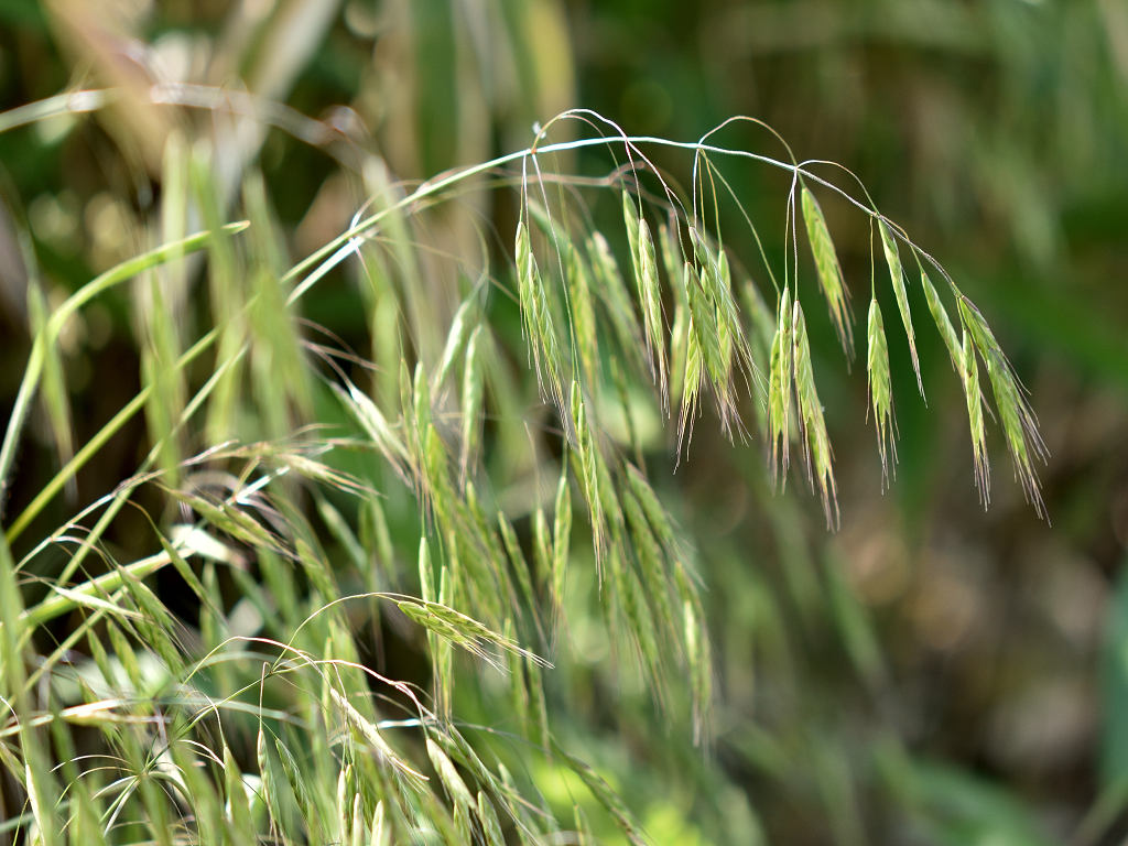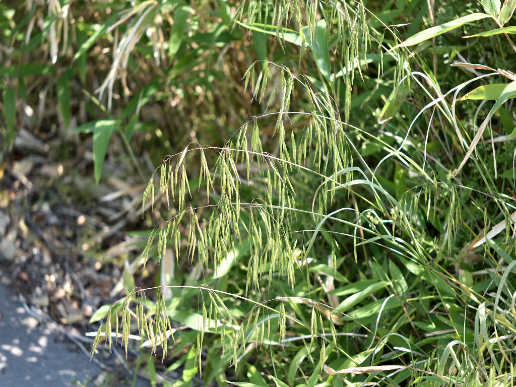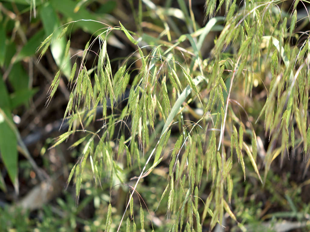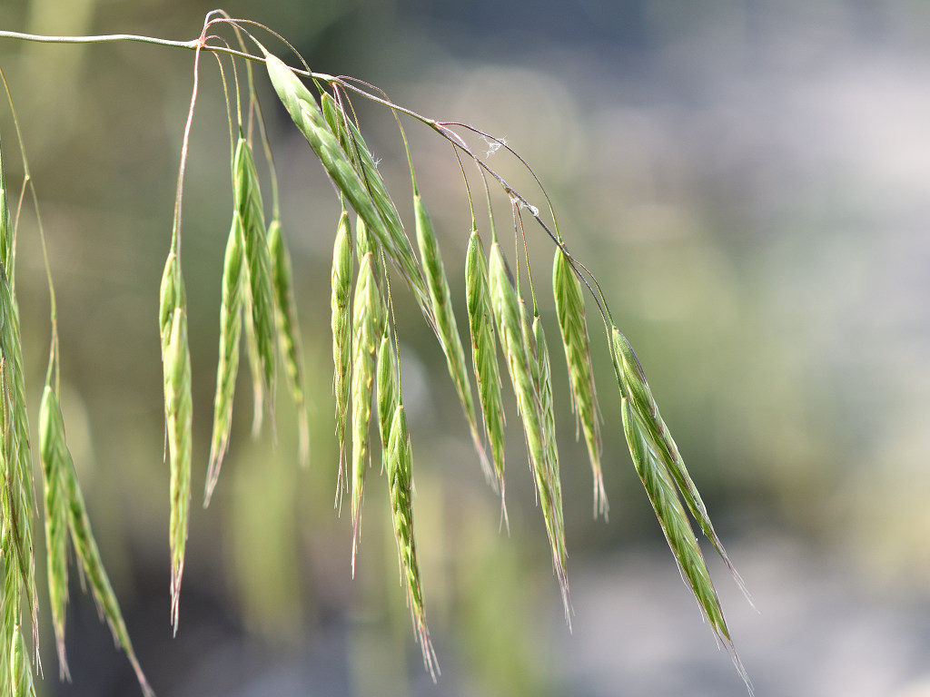 花序枝が長く、先はたれさがる。 小穂は2〜2.5センチのやや丸みをもつ被針形で、長い柄があって垂れさがり、緑色で、6〜10個の小花がつく。 外花穎には長さ0.8〜1.2センチの芒がある。