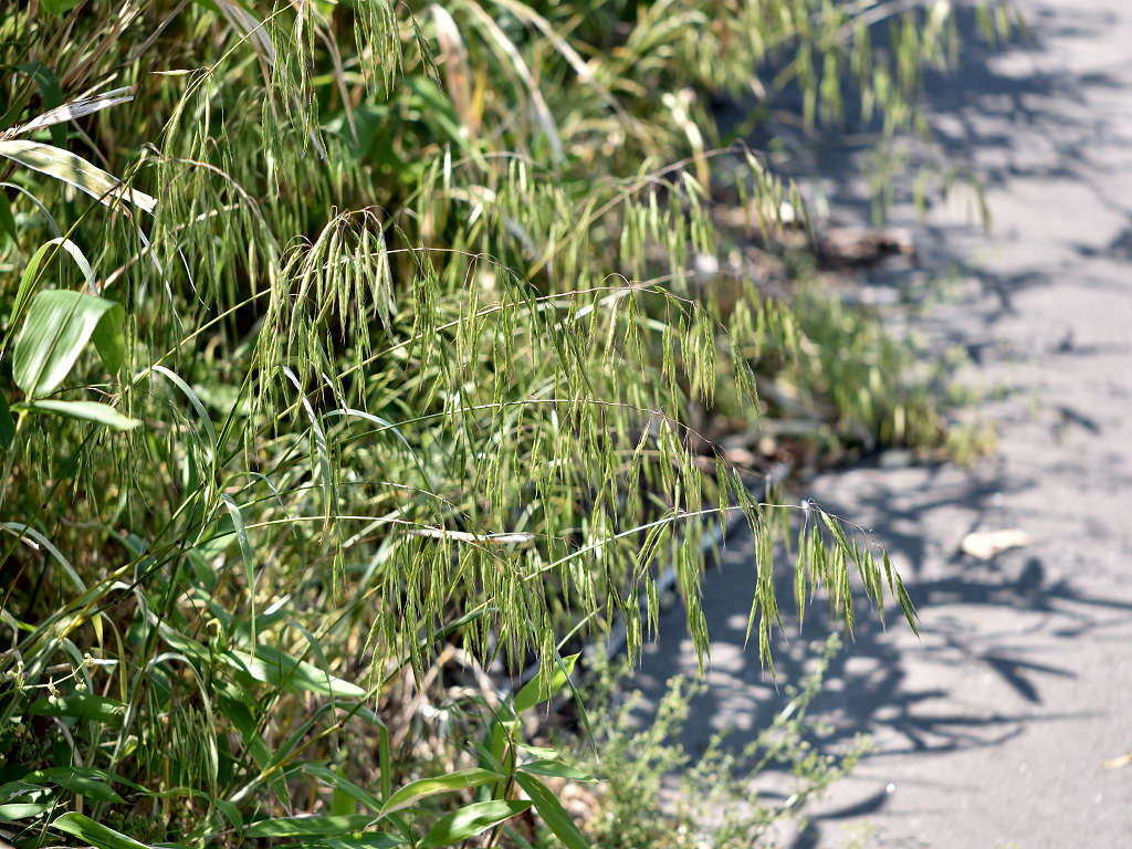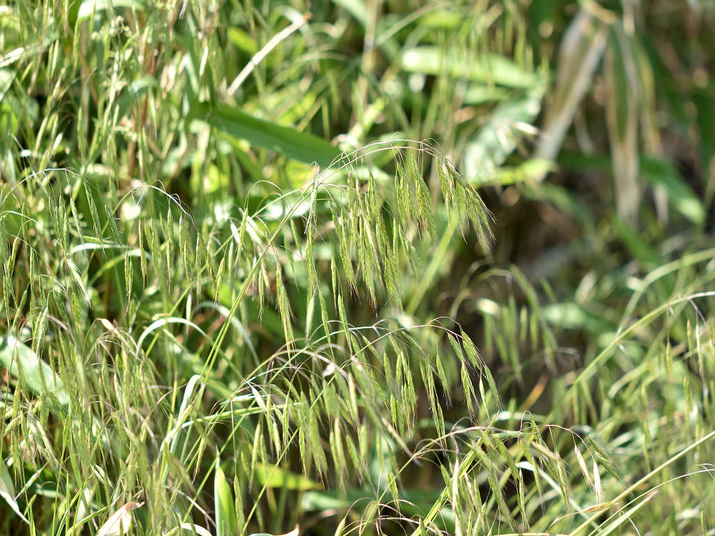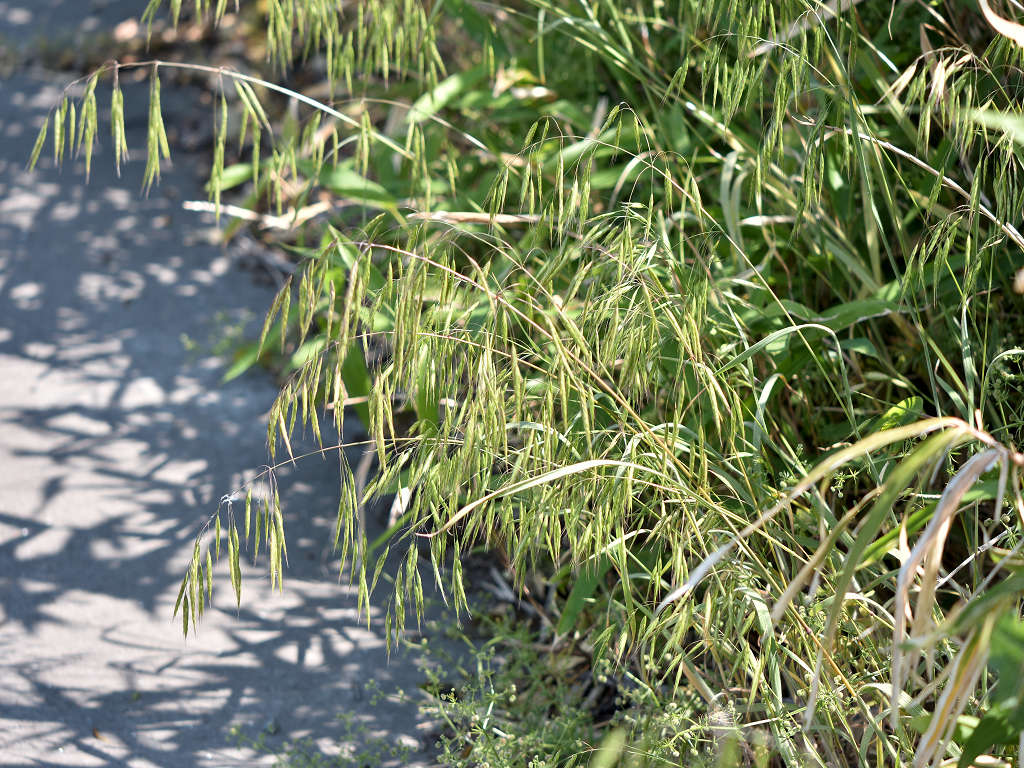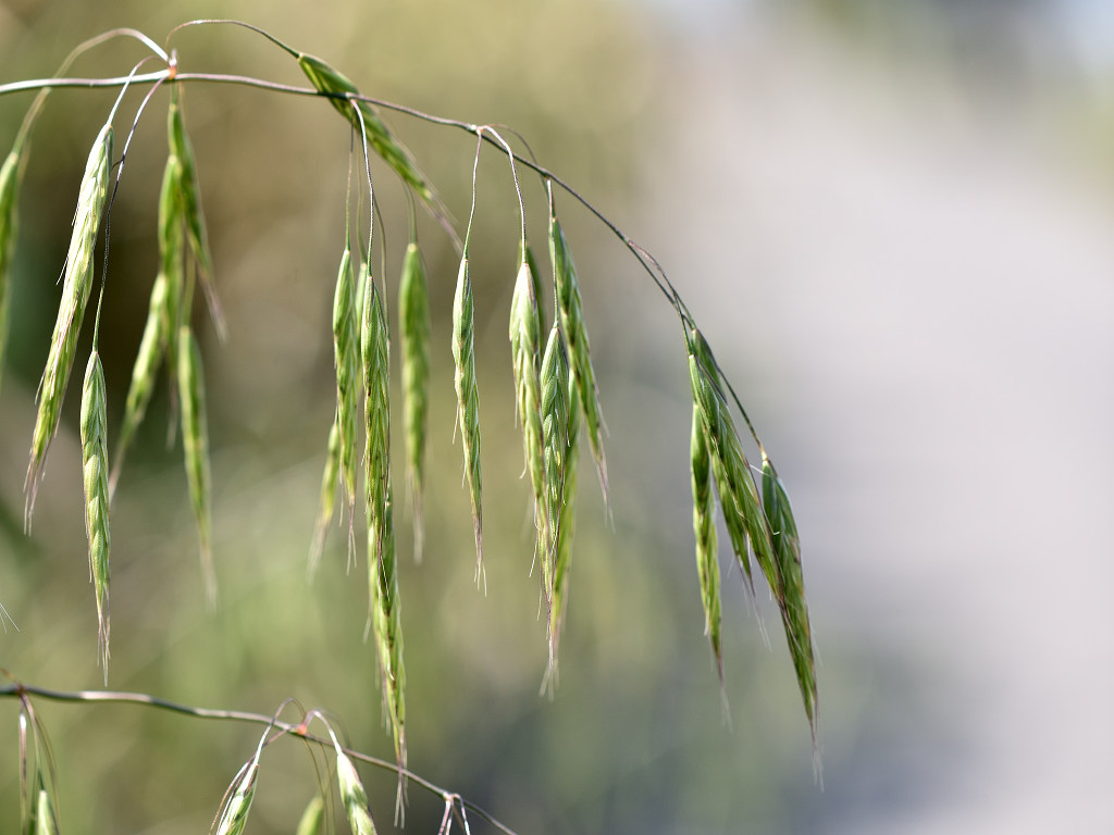 花序枝が長く、先はたれさがる。 小穂は2〜2.5センチのやや丸みをもつ被針形で、長い柄があって垂れさがり、緑色で、6〜10個の小花がつく。 外花穎には長さ0.8〜1.2センチの芒がある。