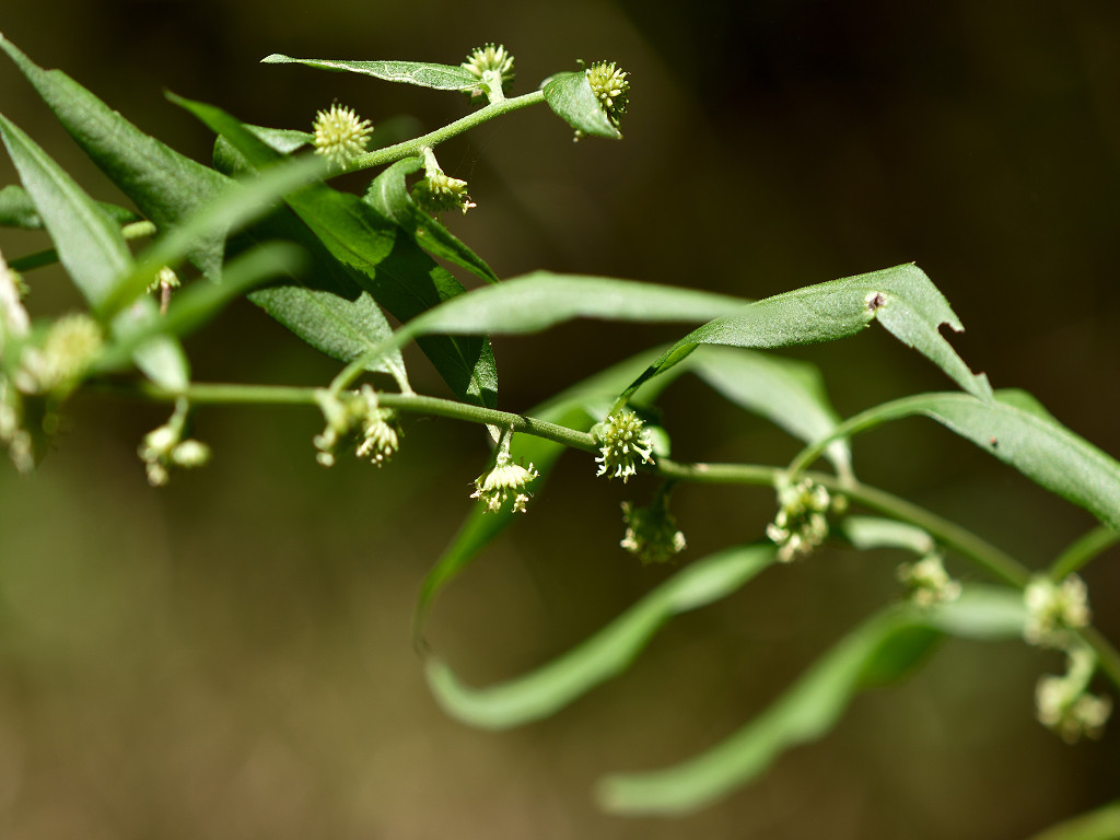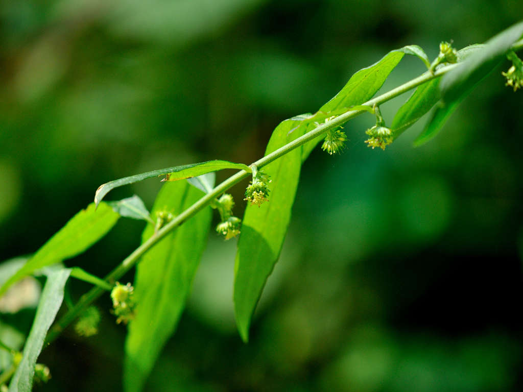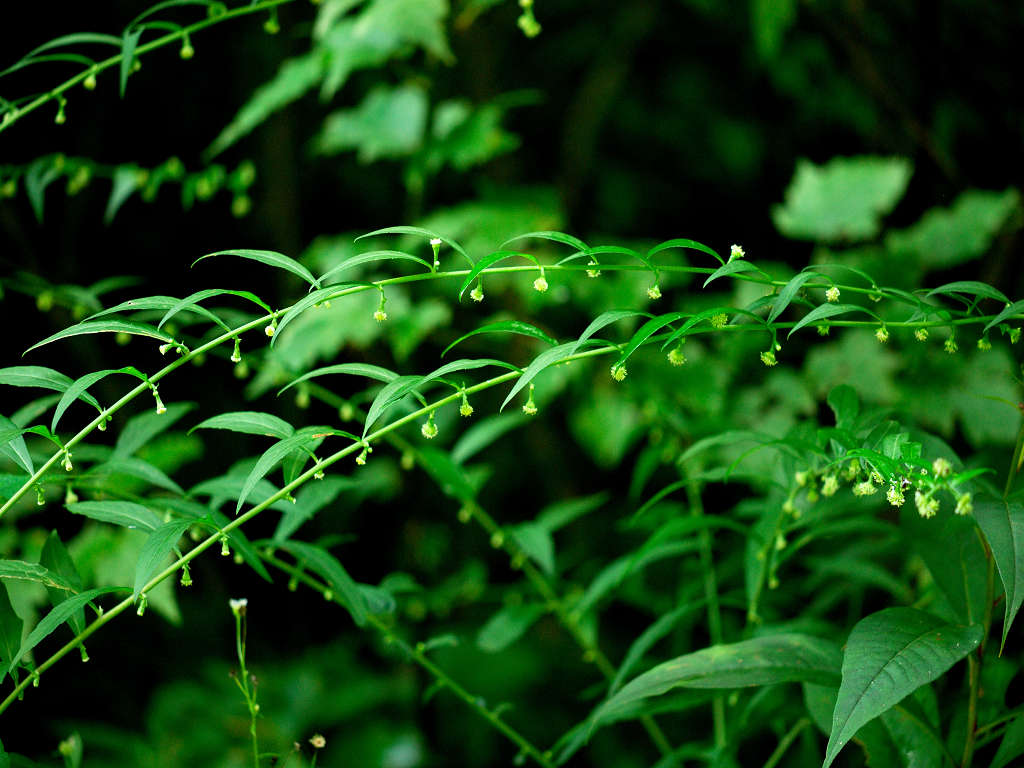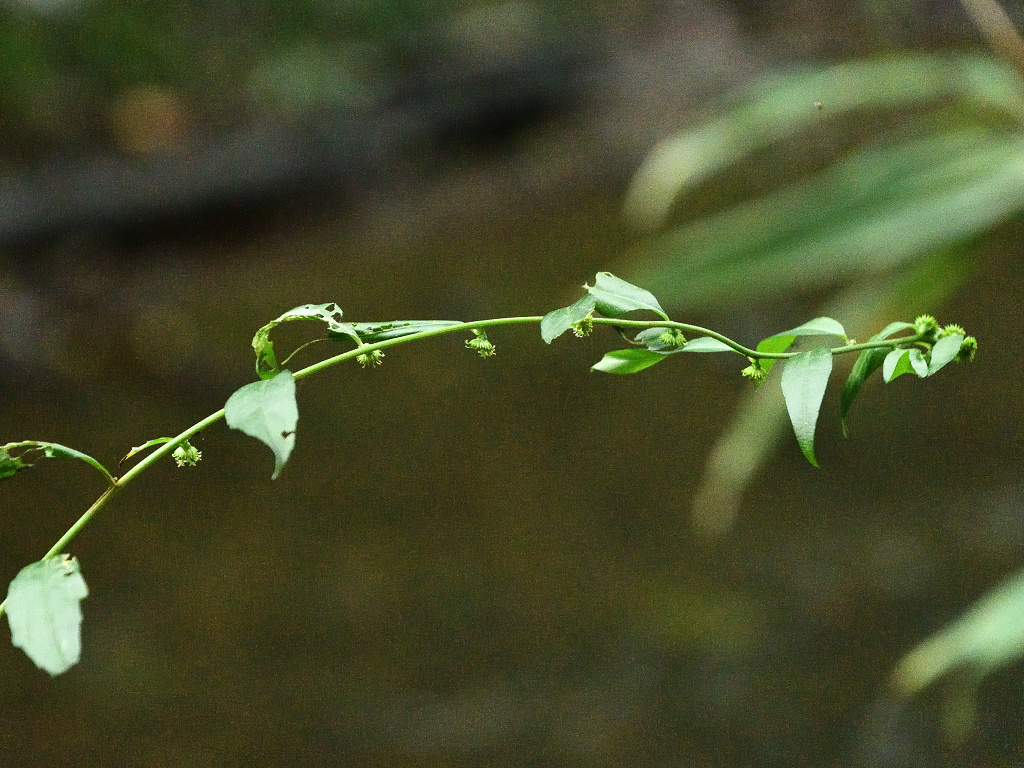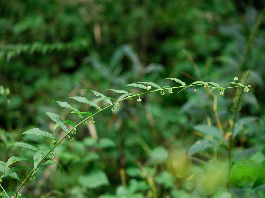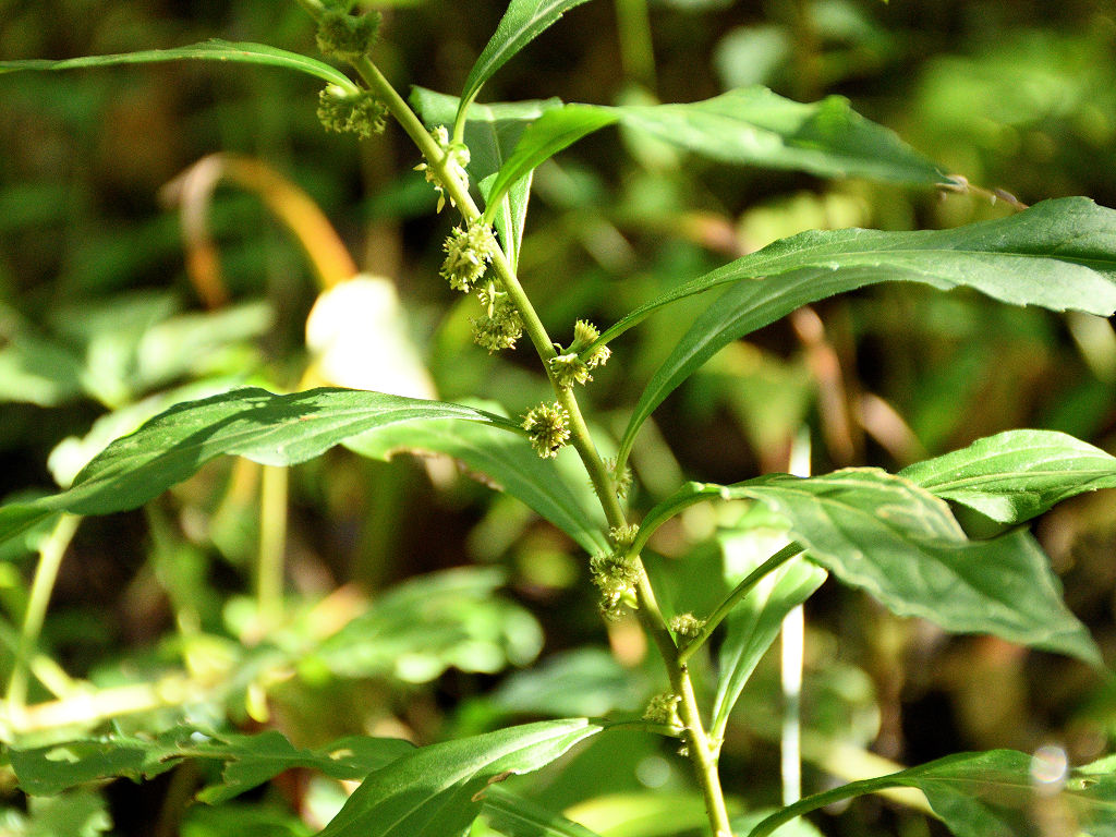 茎は直立し、上部で分枝し、長い枝を開出する 葉腋から出た柄に小さな花をつける