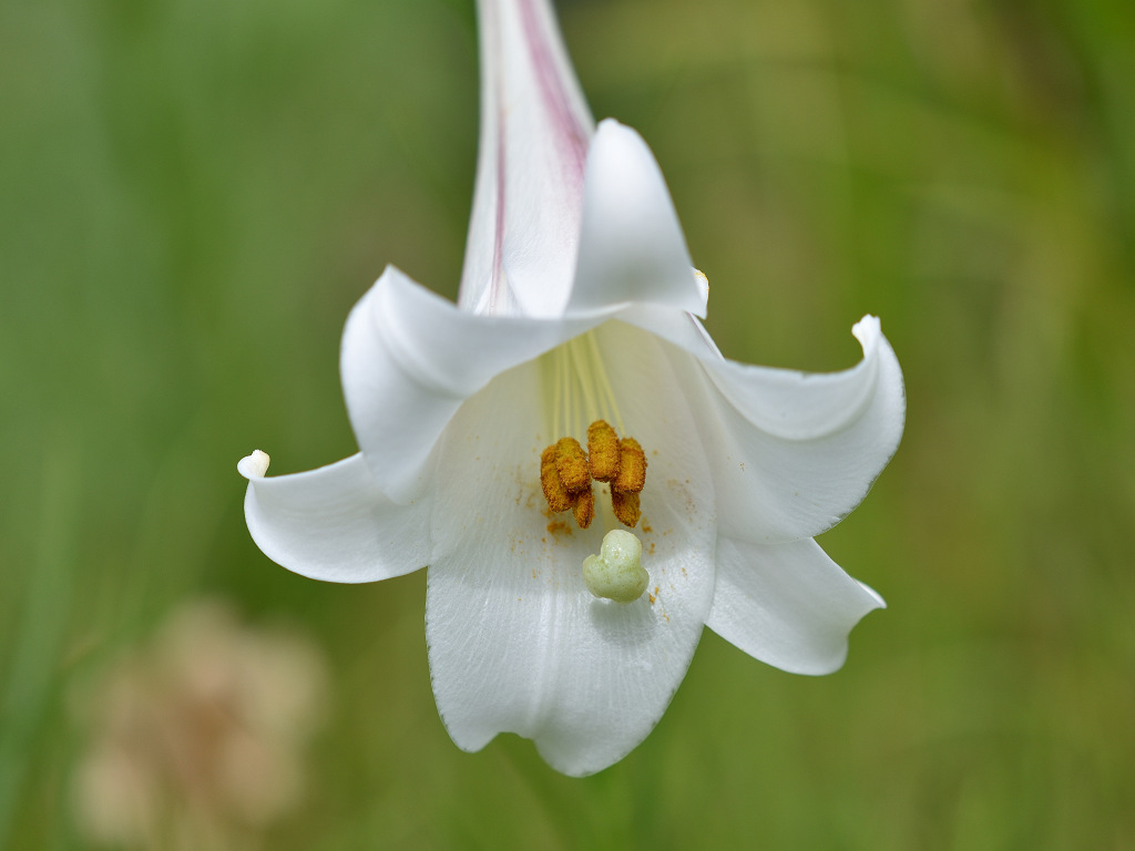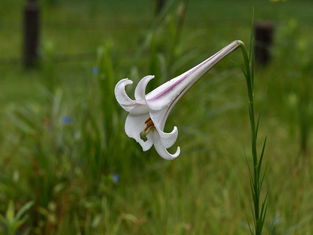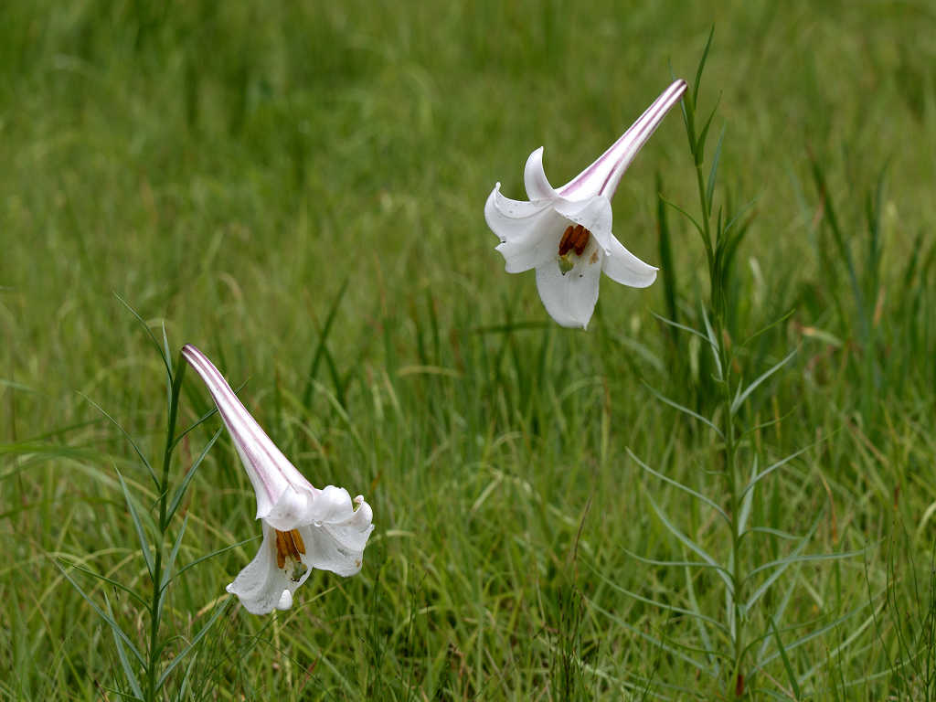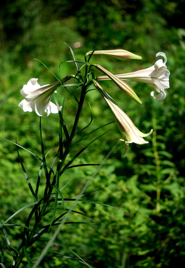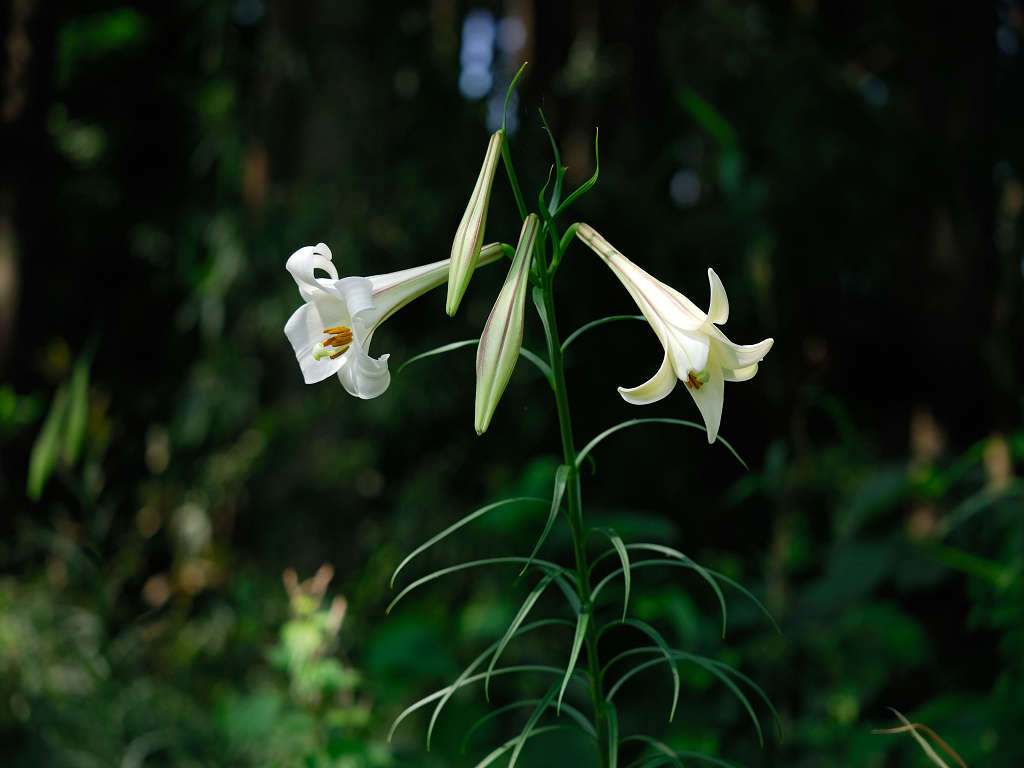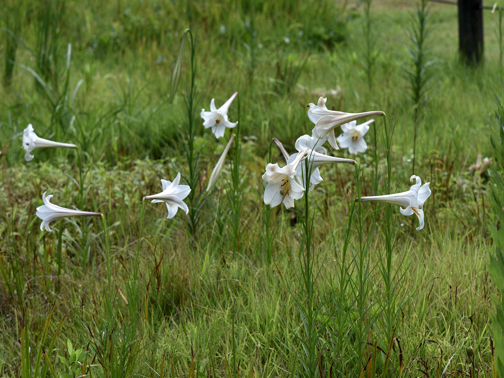 台湾に自生していたユリが大正時代に日本に入り、各地に野生化したもの テッポウユリに似ているが、本種は花弁に淡紫の斑が入る