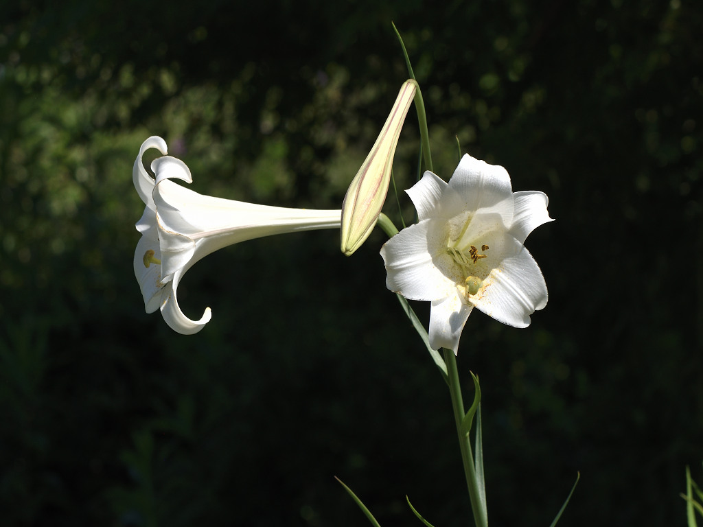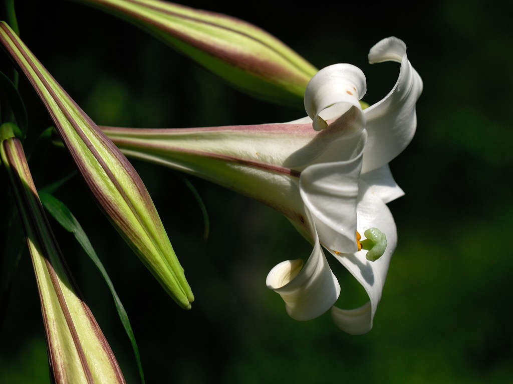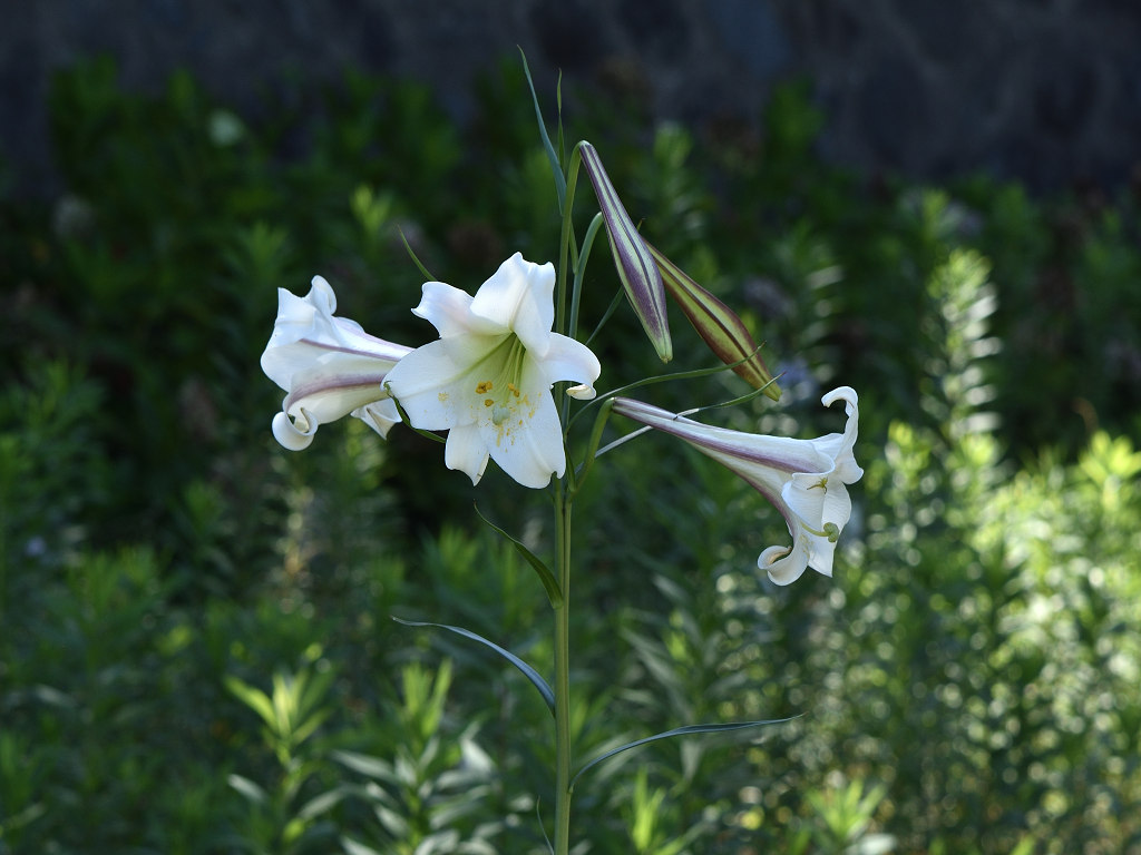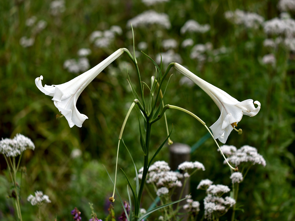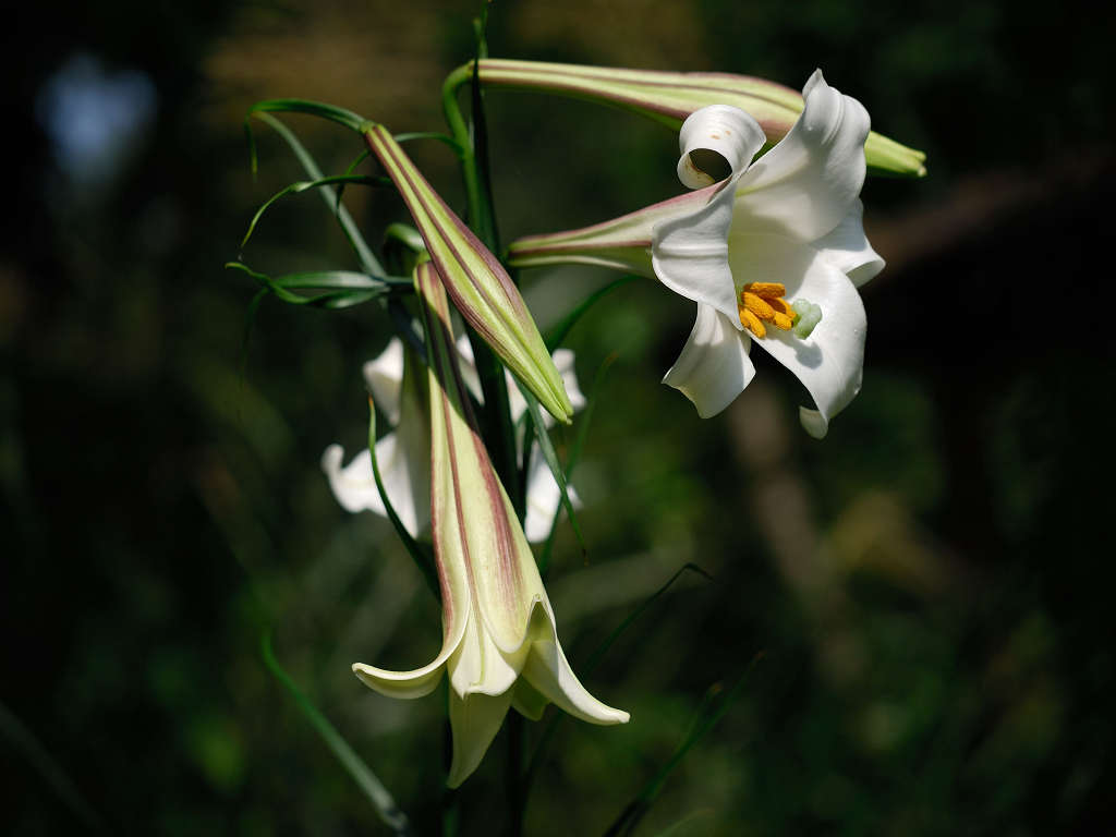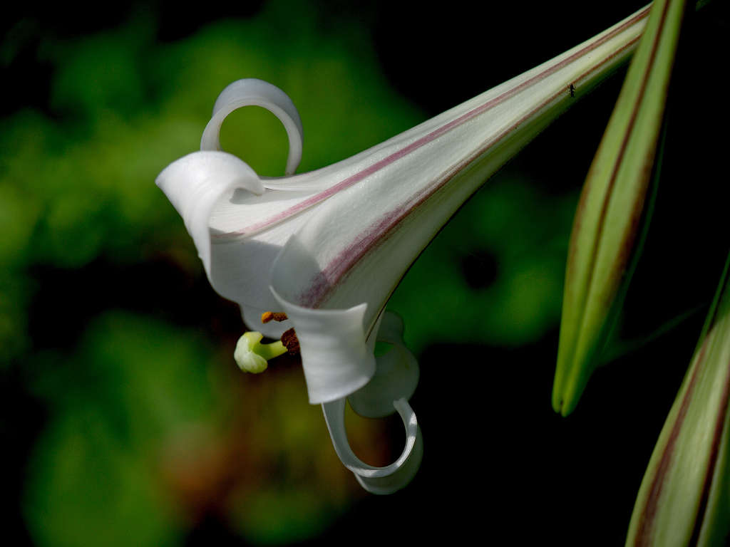 台湾に自生していたユリが大正時代に日本に入り、各地に野生化したもの テッポウユリに似ているが、本種は花弁に淡紫の斑が入る