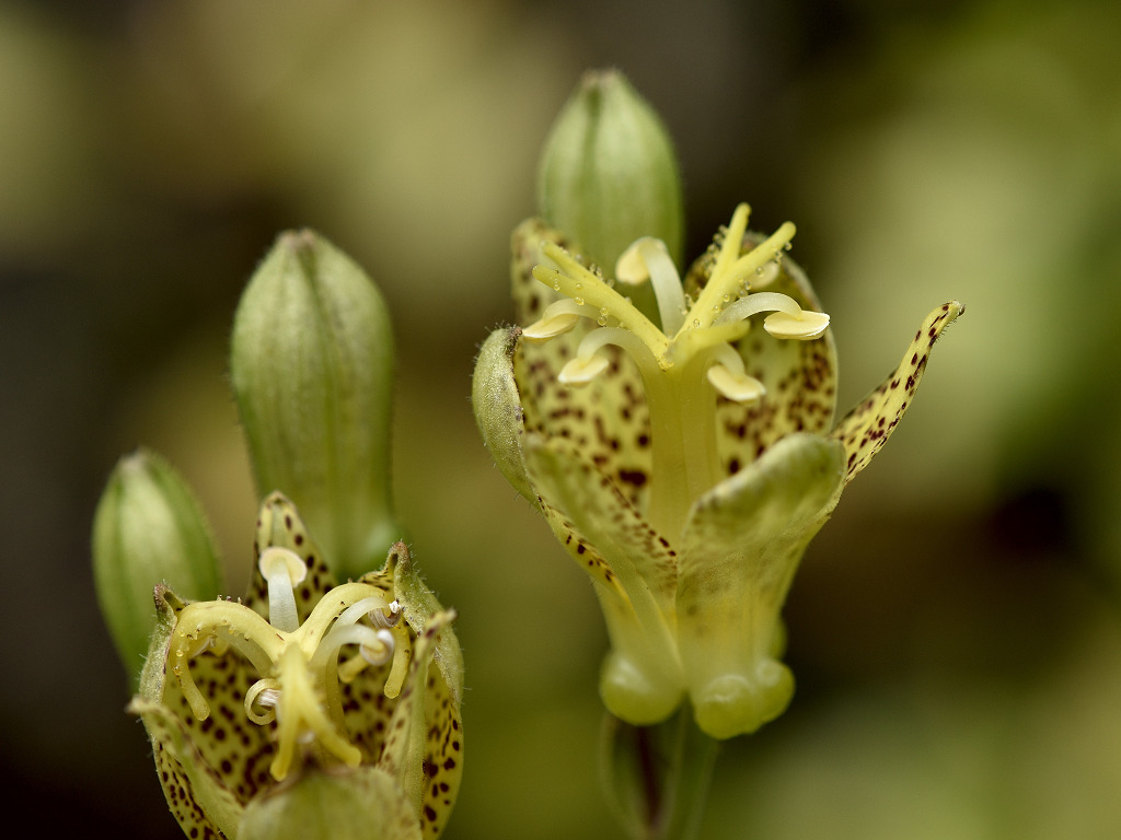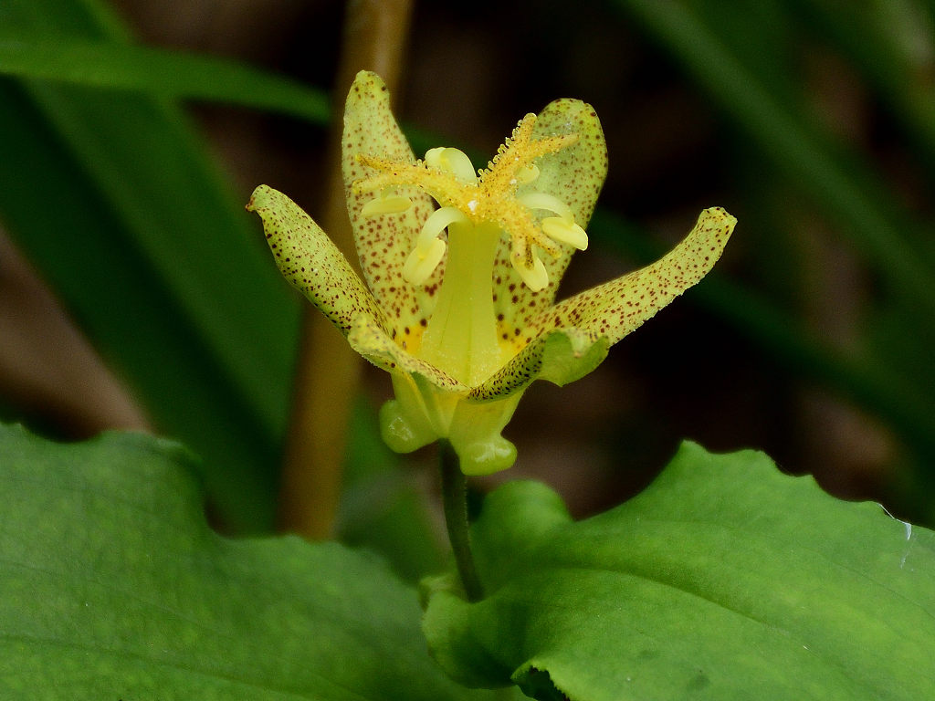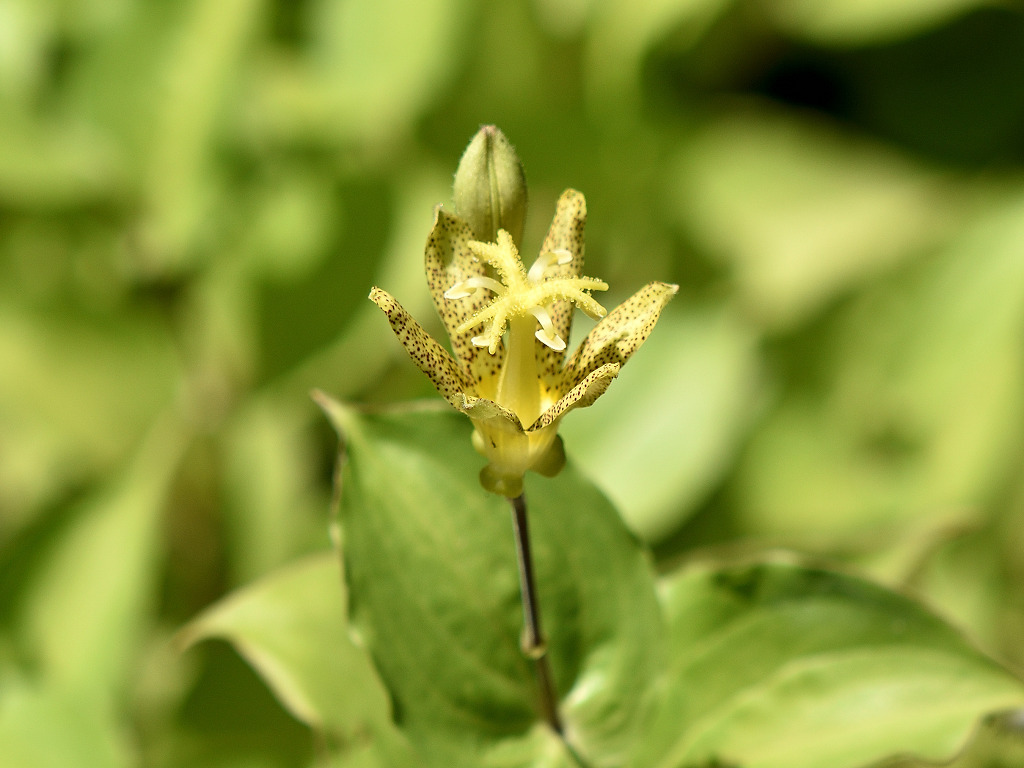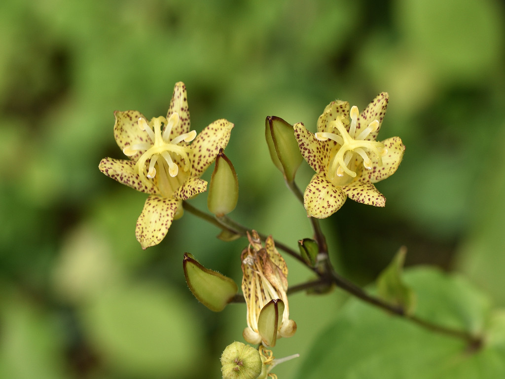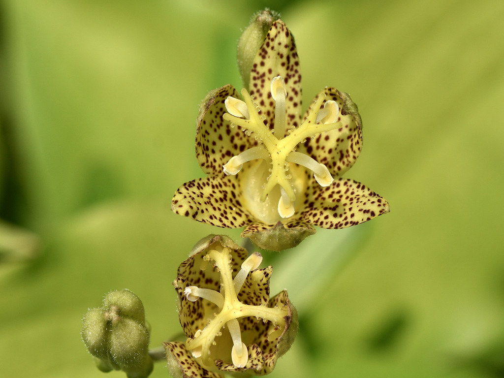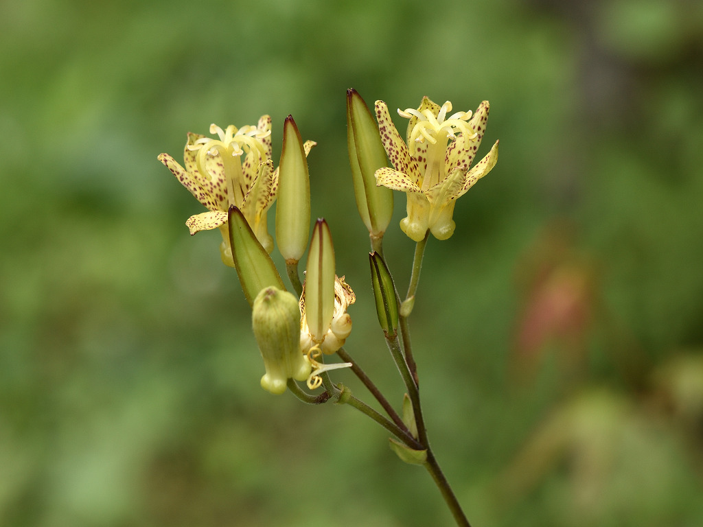 ホトトギスは秋に咲くが本種は夏に咲く 花糸や葯にに斑点がない