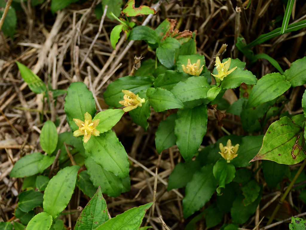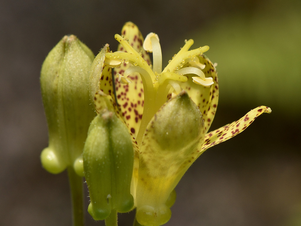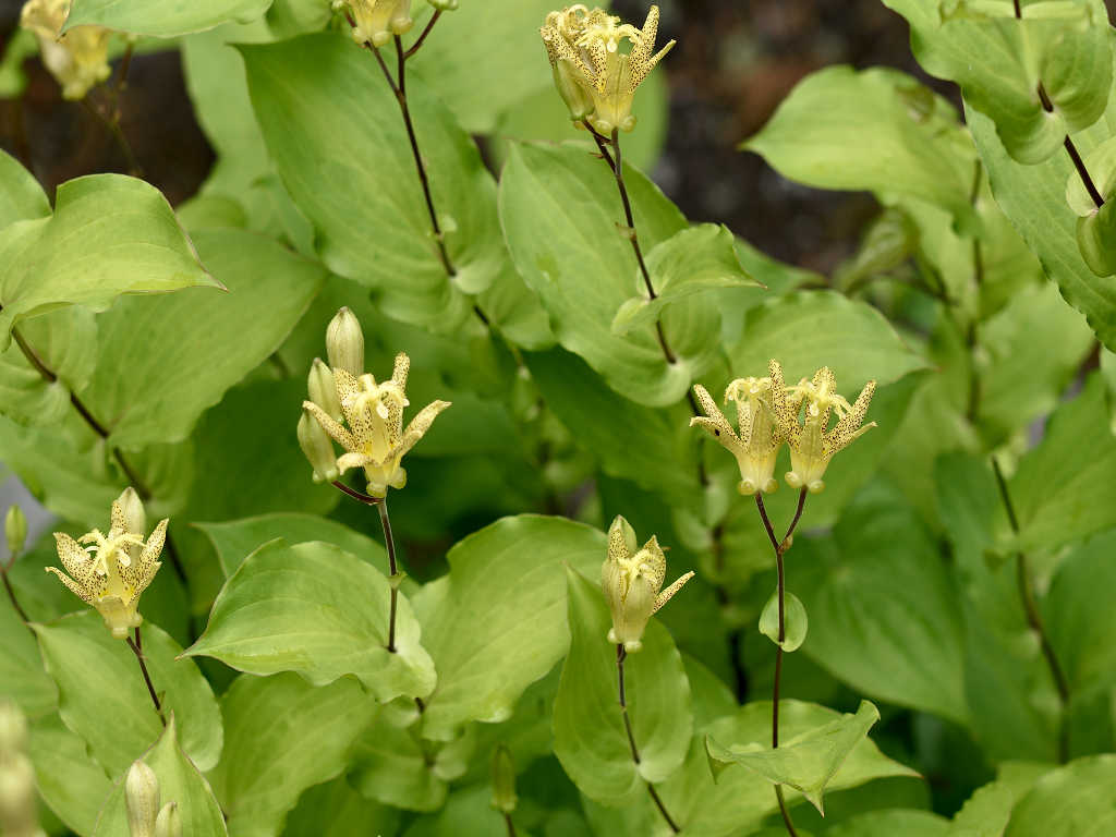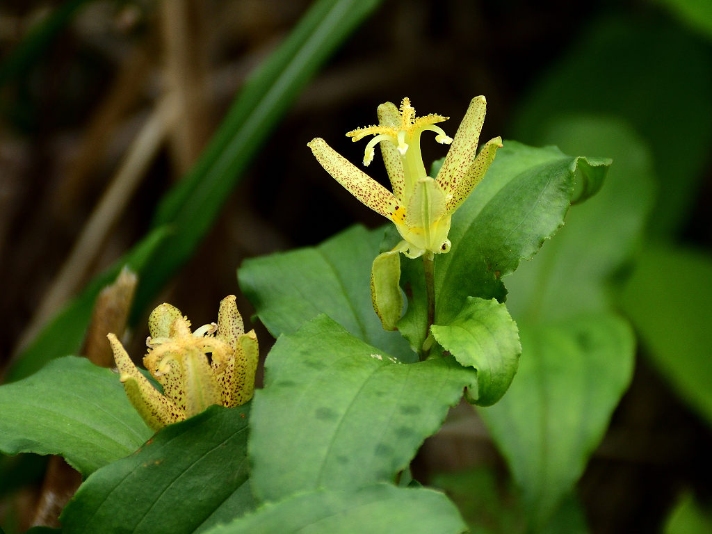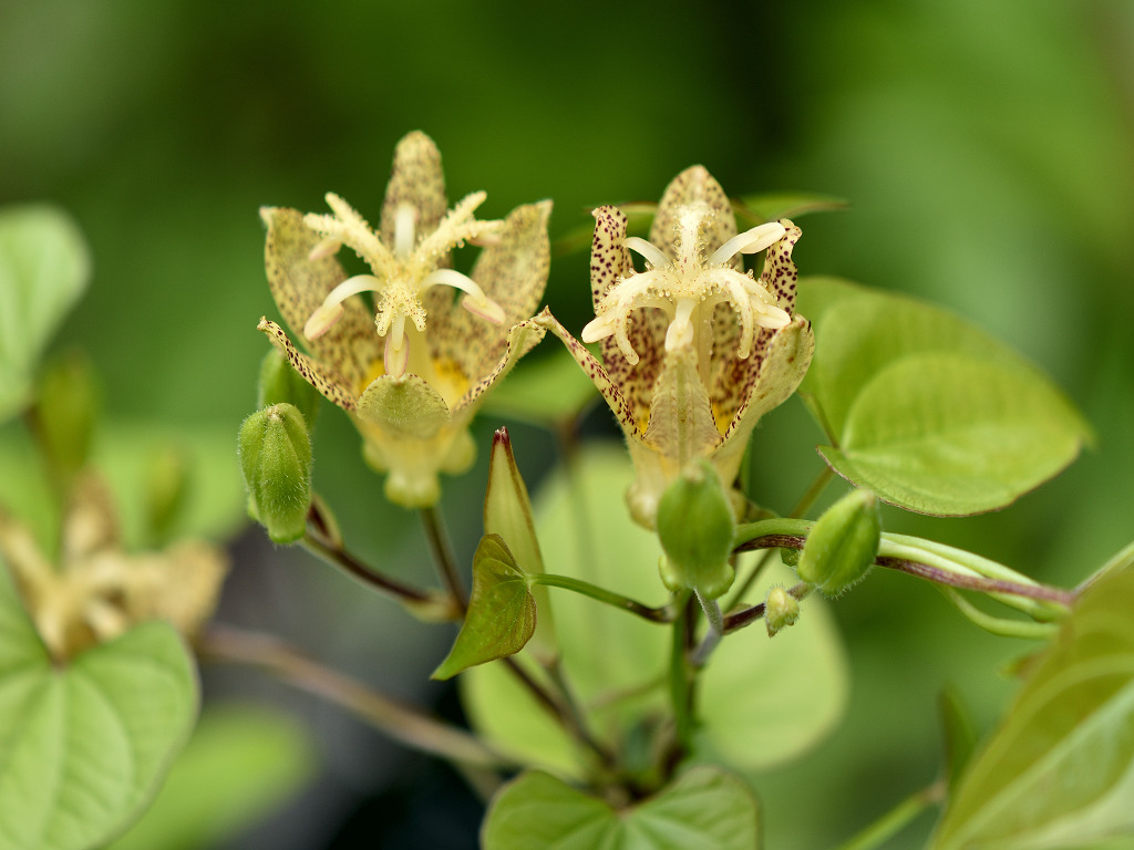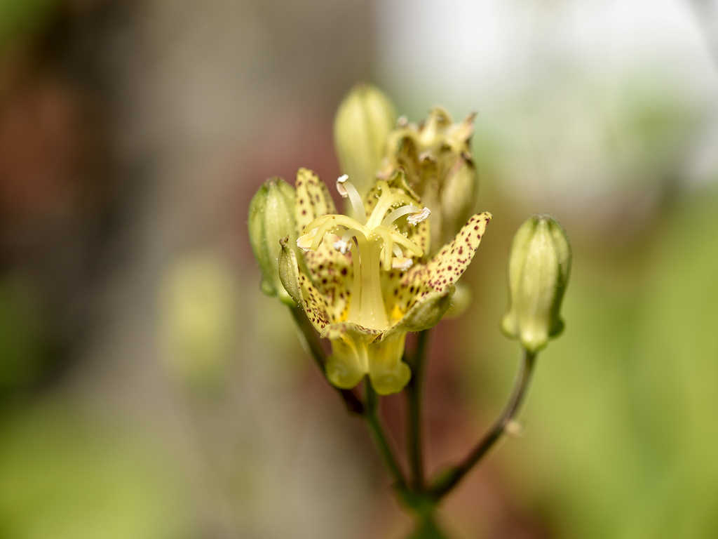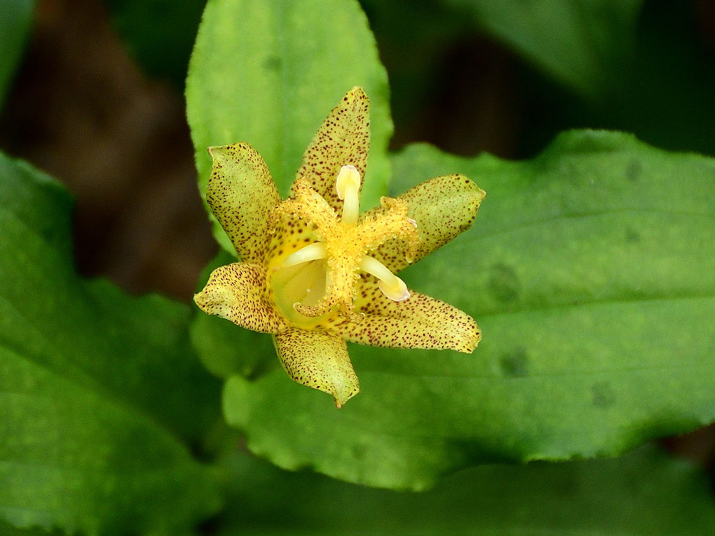 ホトトギスは秋に咲くが本種は夏に咲く 花糸や葯にに斑点がない