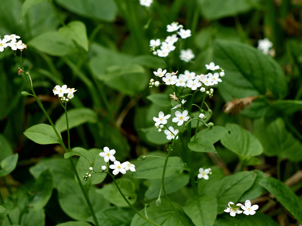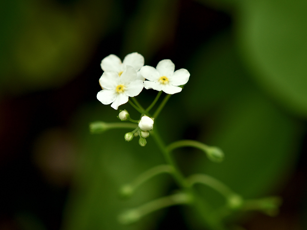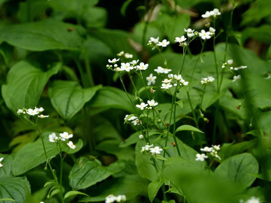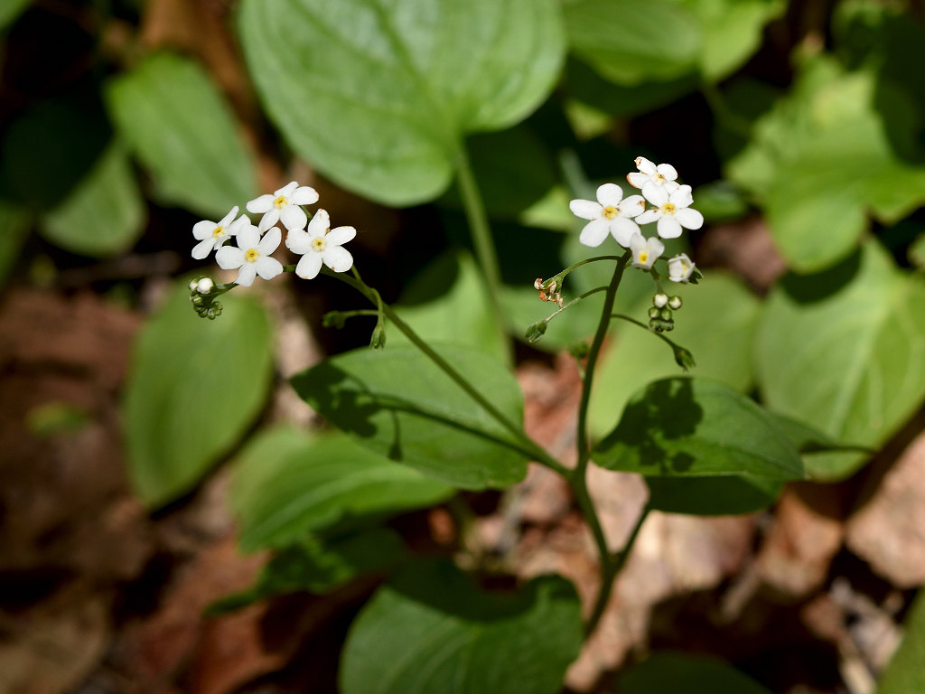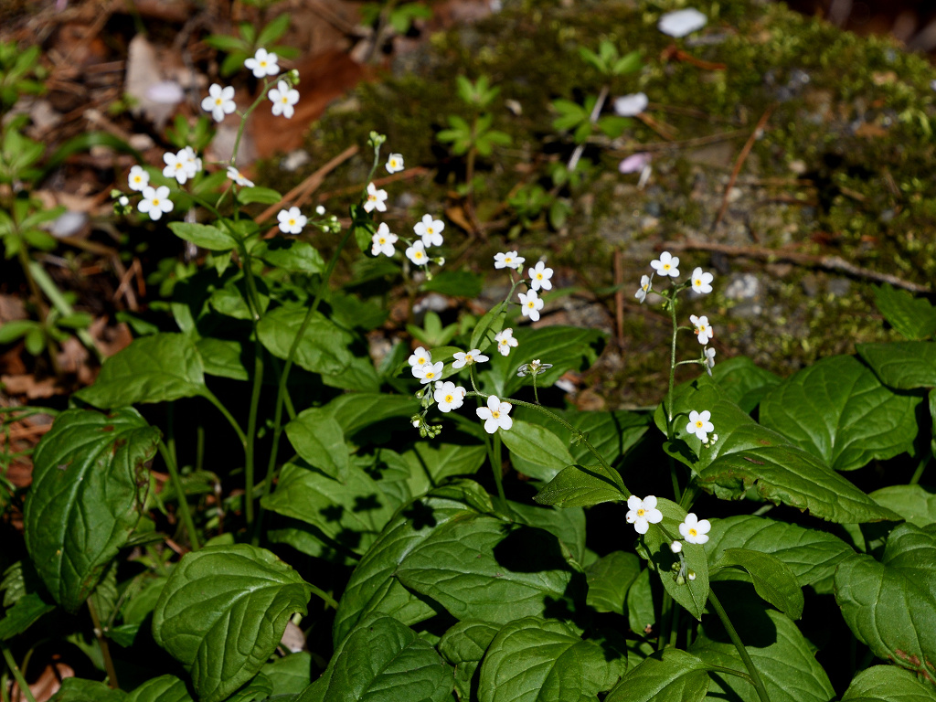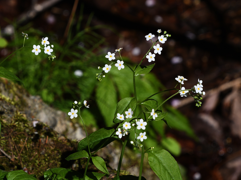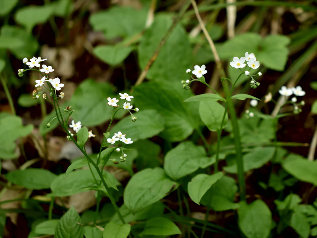 茎の先の総状花序に白色〜淡青紫色の花をまばらに8-15個つける キュウリグサなどに似た花