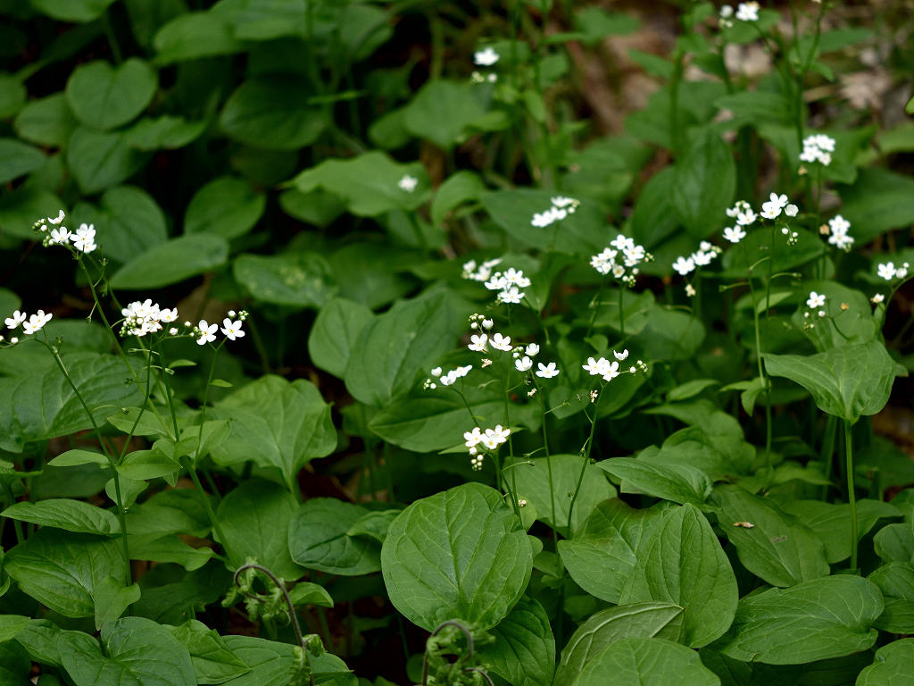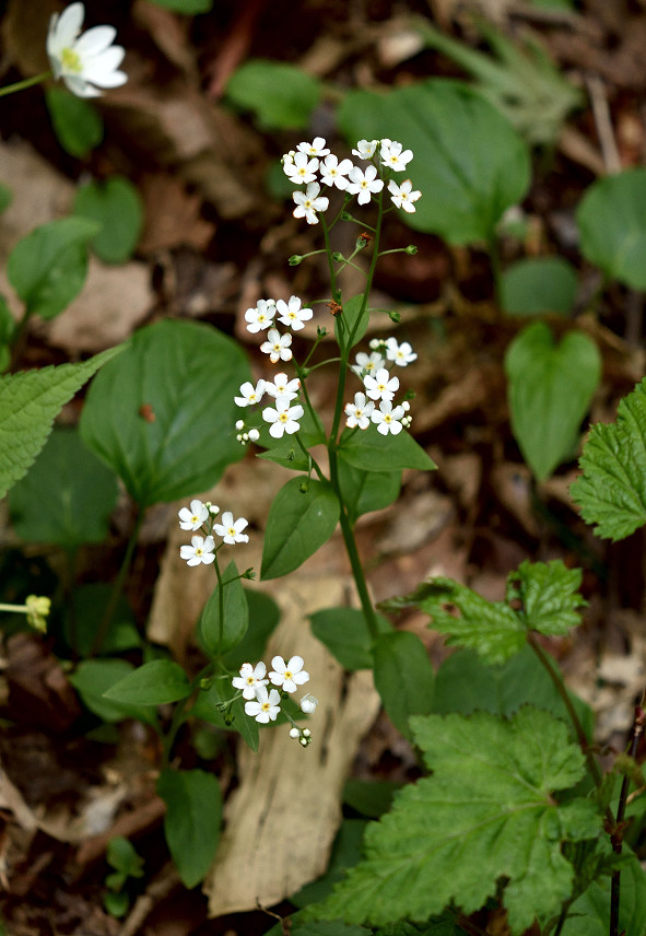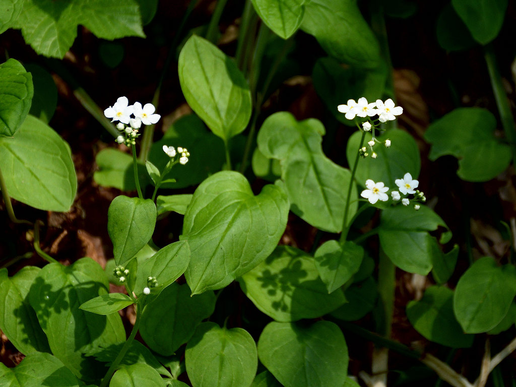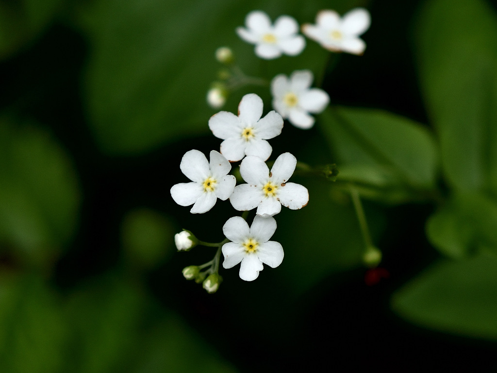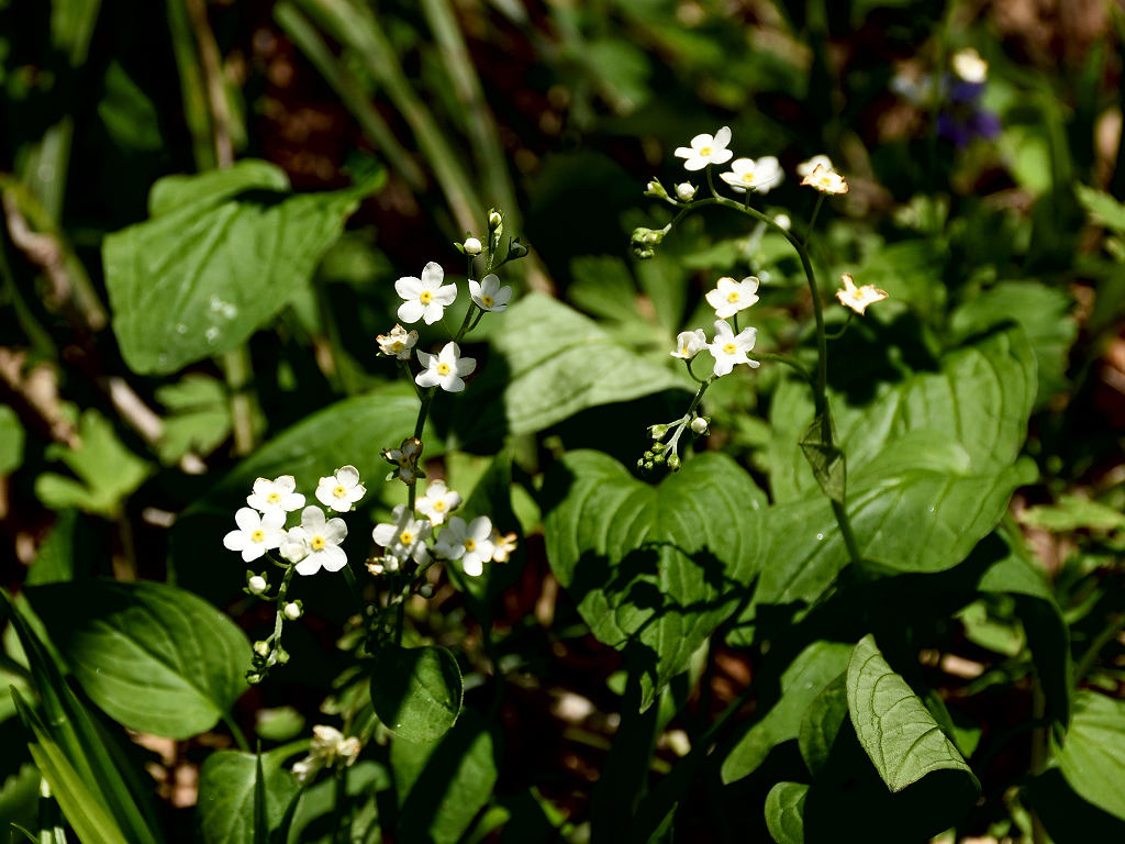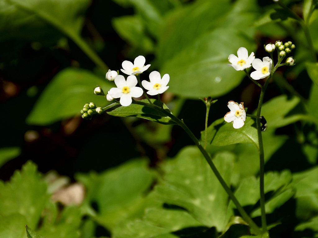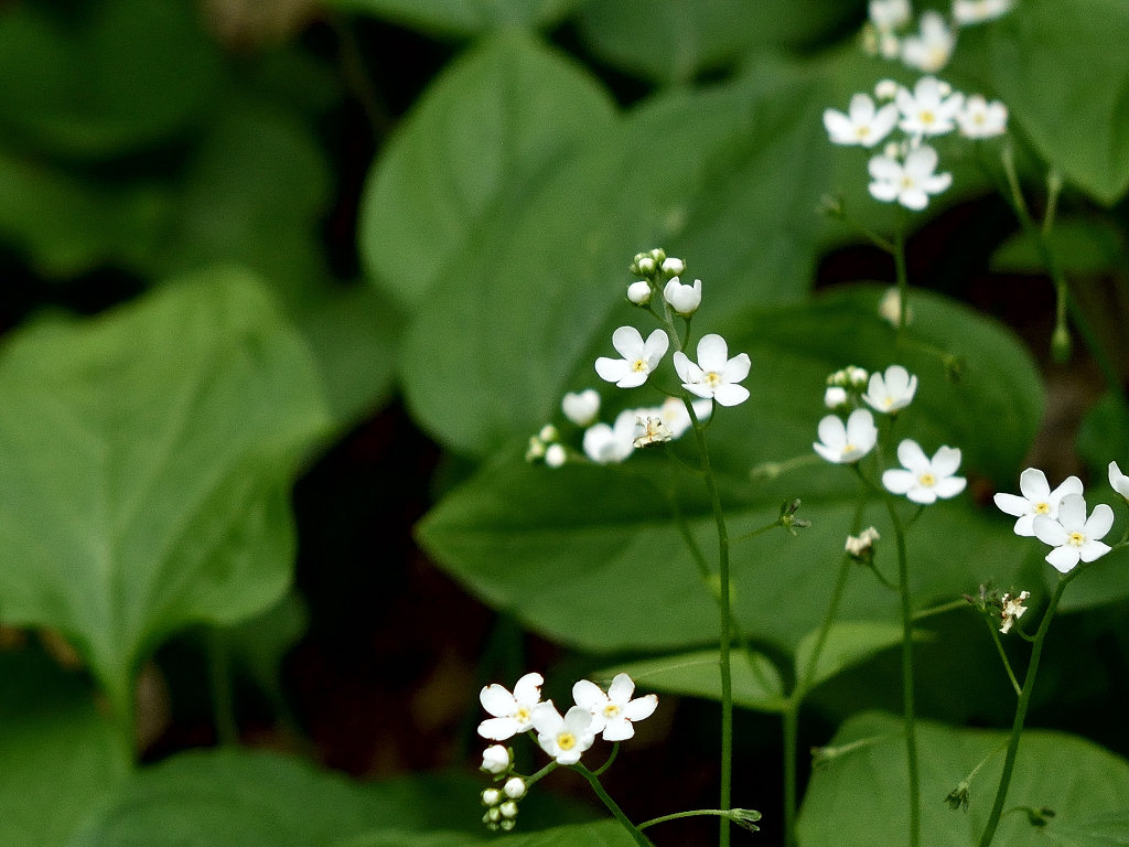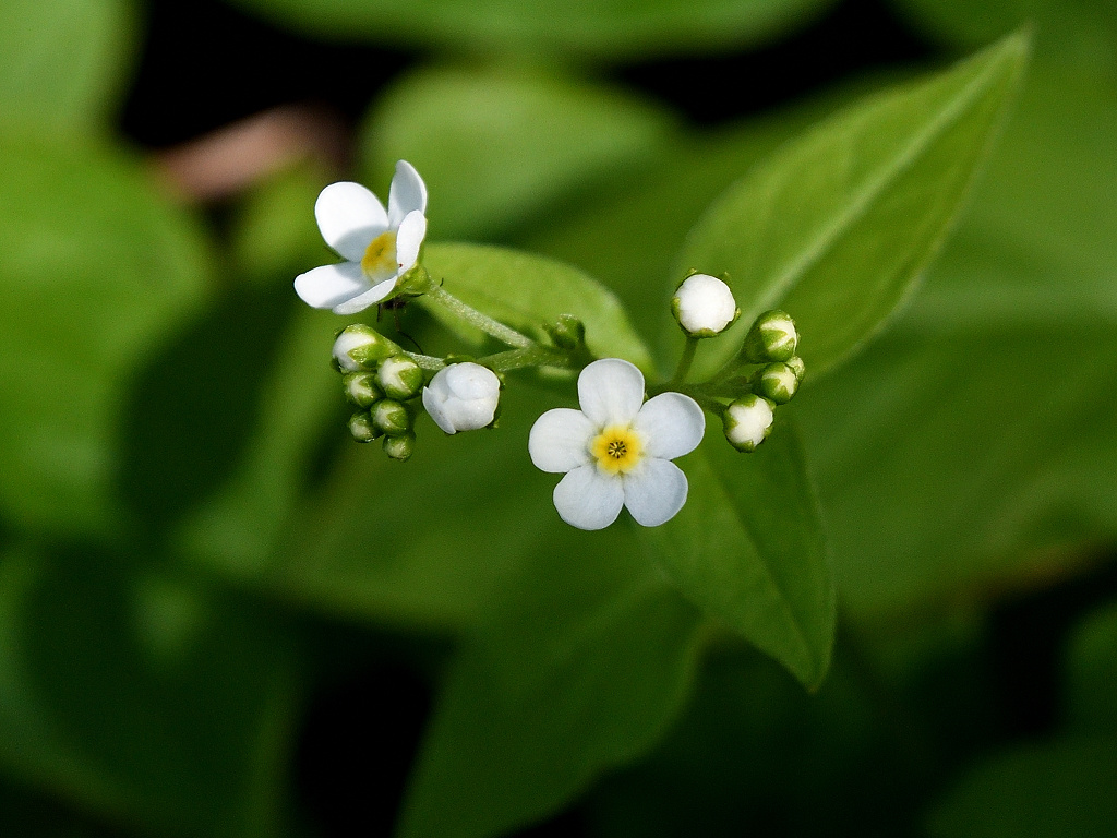 茎の先の総状花序に白色〜淡青紫色の花をまばらに8-15個つける キュウリグサなどに似た花