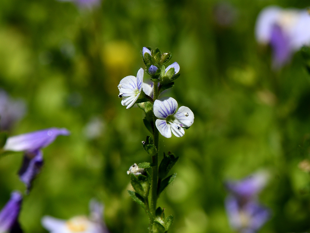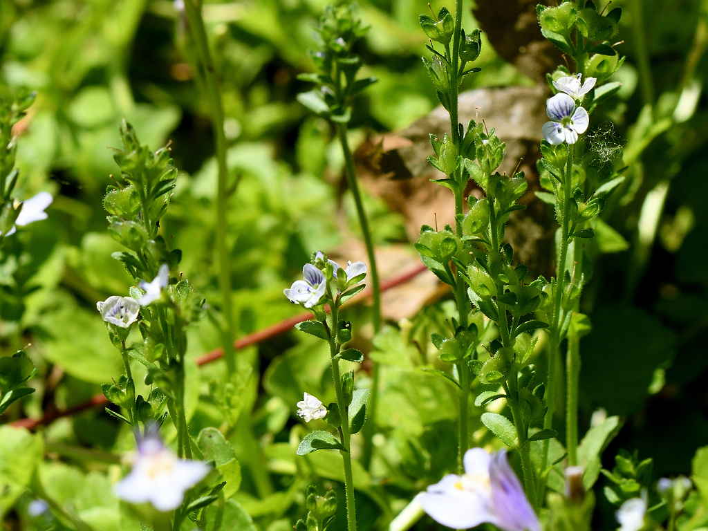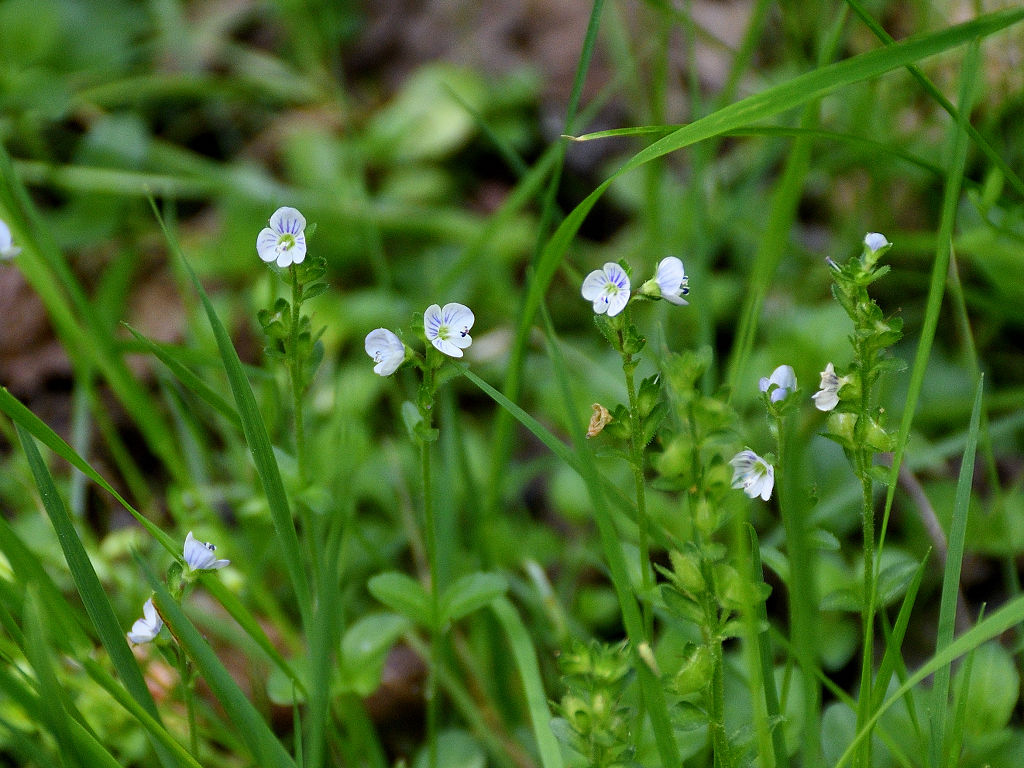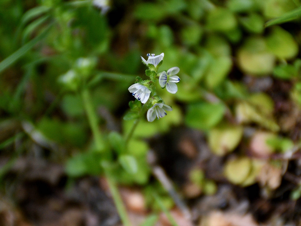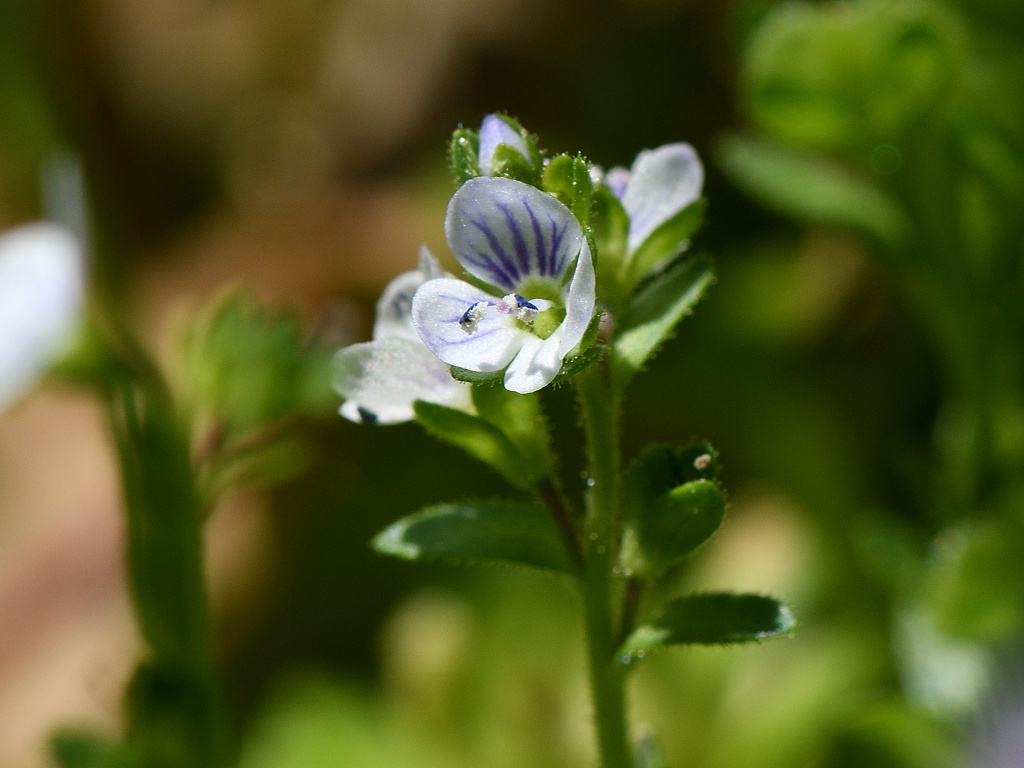 淡い青紫色の花弁に青い筋が入る オオイヌノフグリを小さくしたような花 花柄 花軸に短毛と腺毛が生える