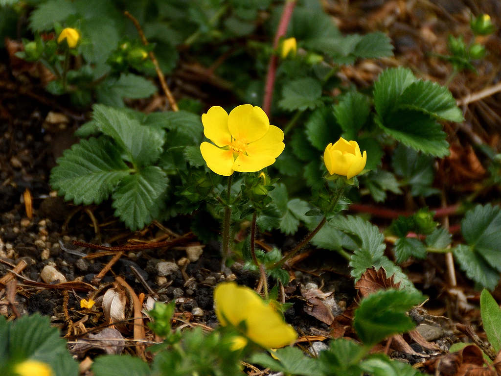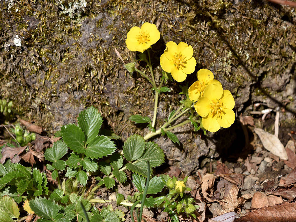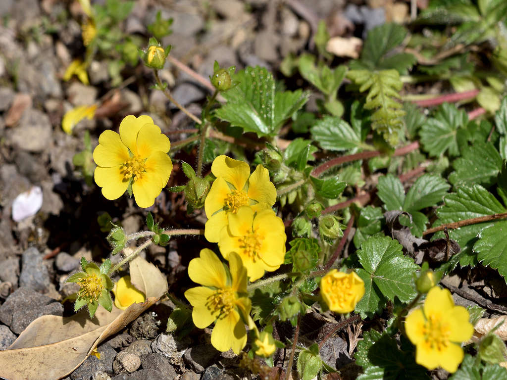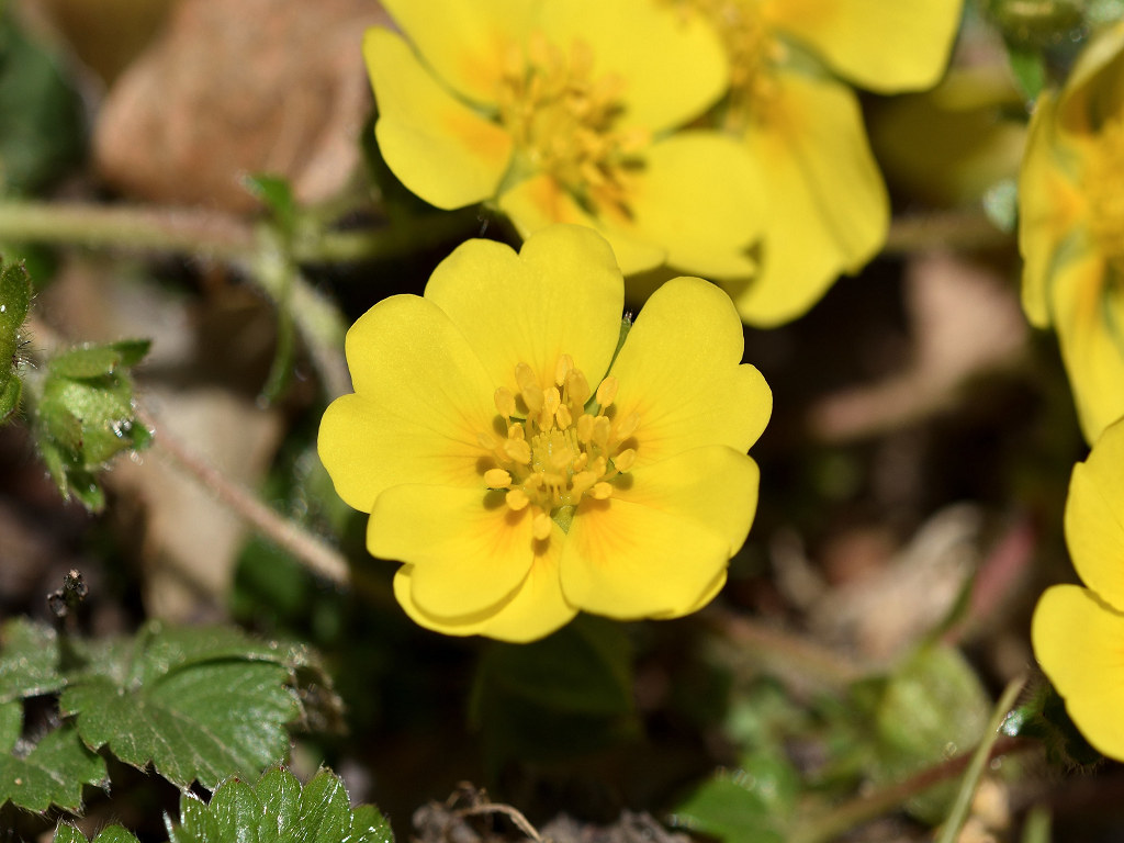 花は黄色い5弁花で、萼片と副萼片も各5枚 葉は、3出複葉で鋸歯があり