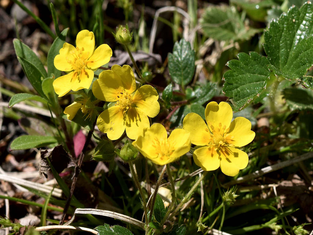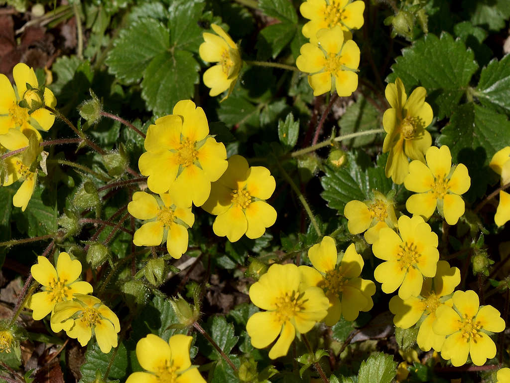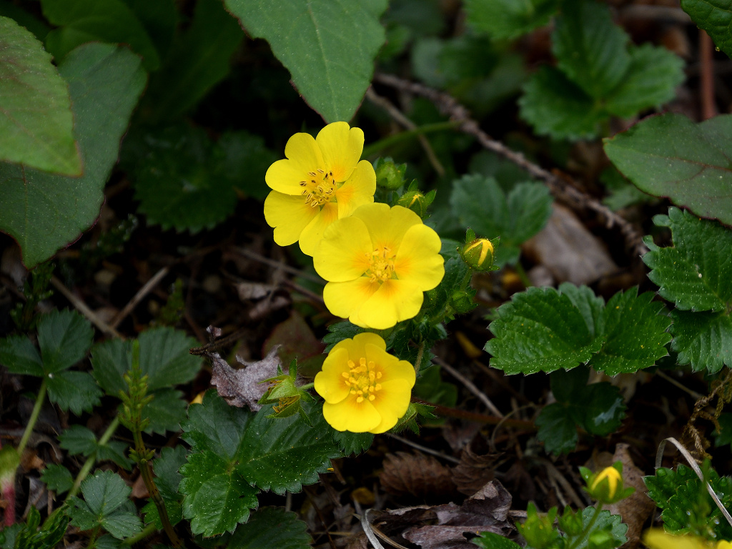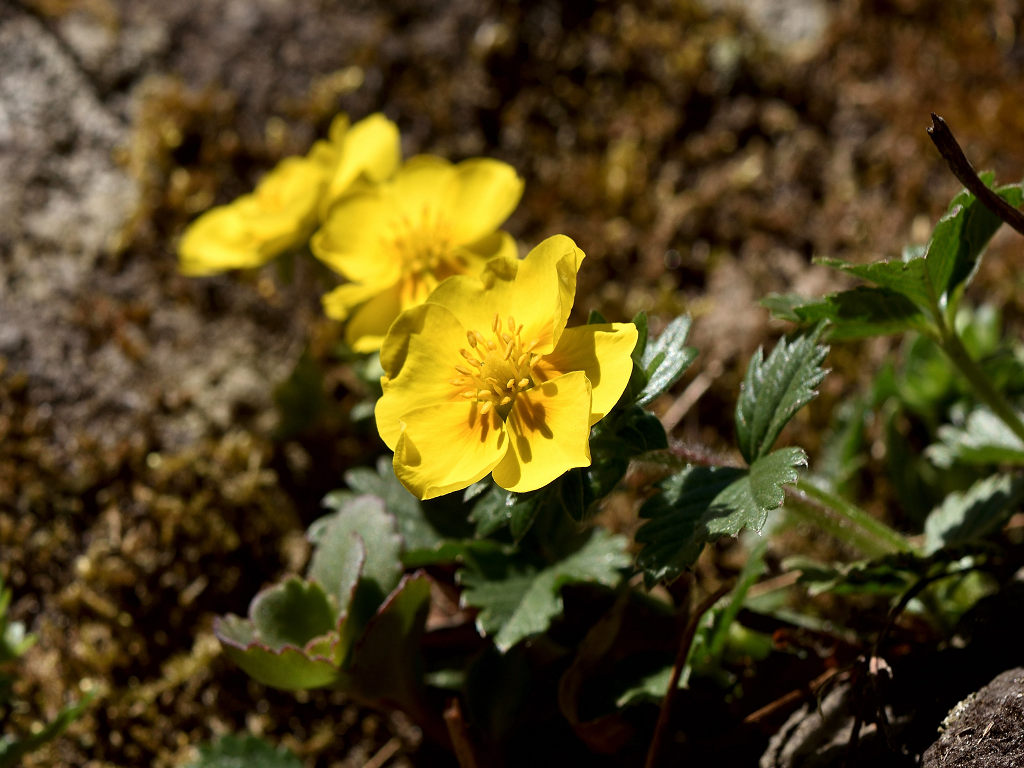 花は黄色い5弁花で、萼片と副萼片も各5枚 葉は、3出複葉で鋸歯があり