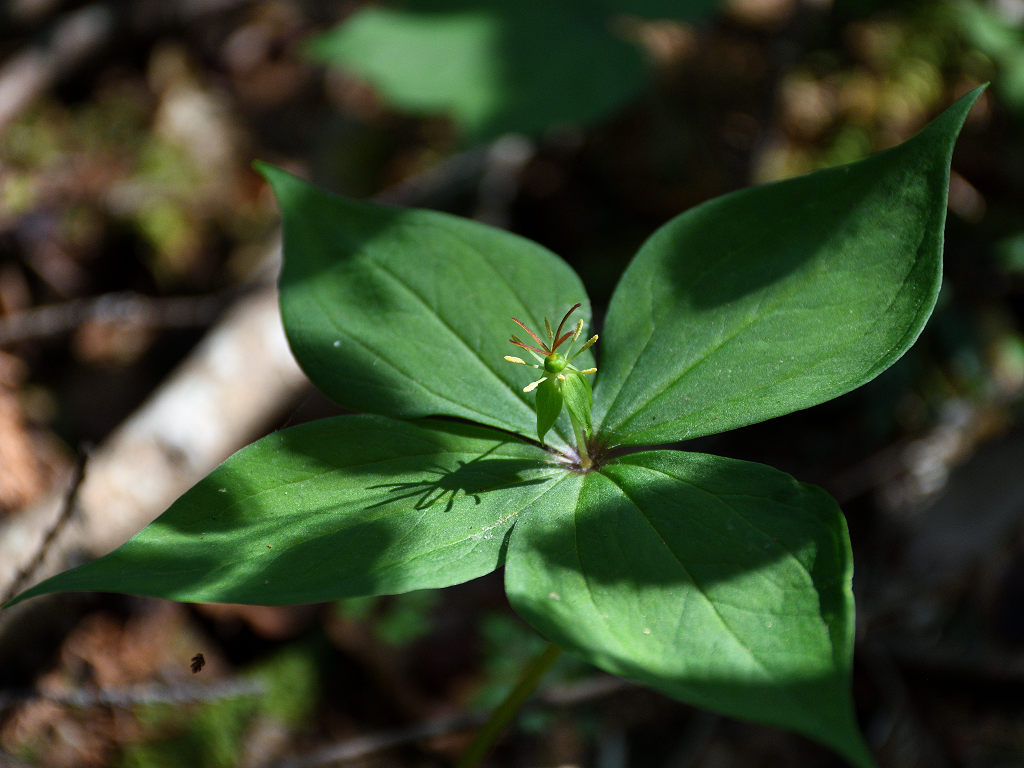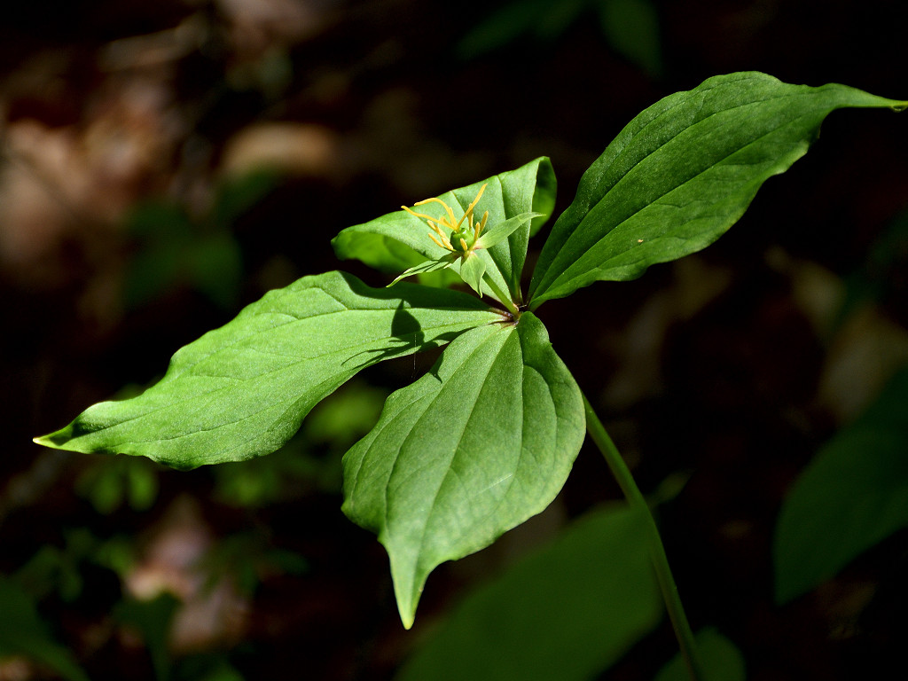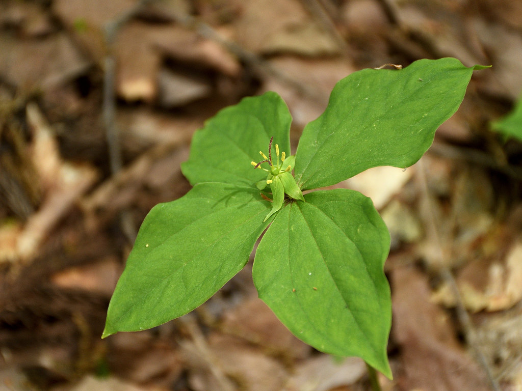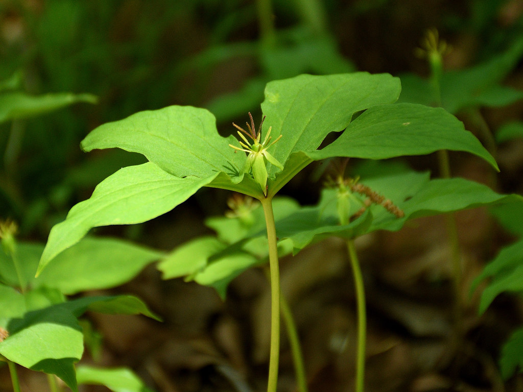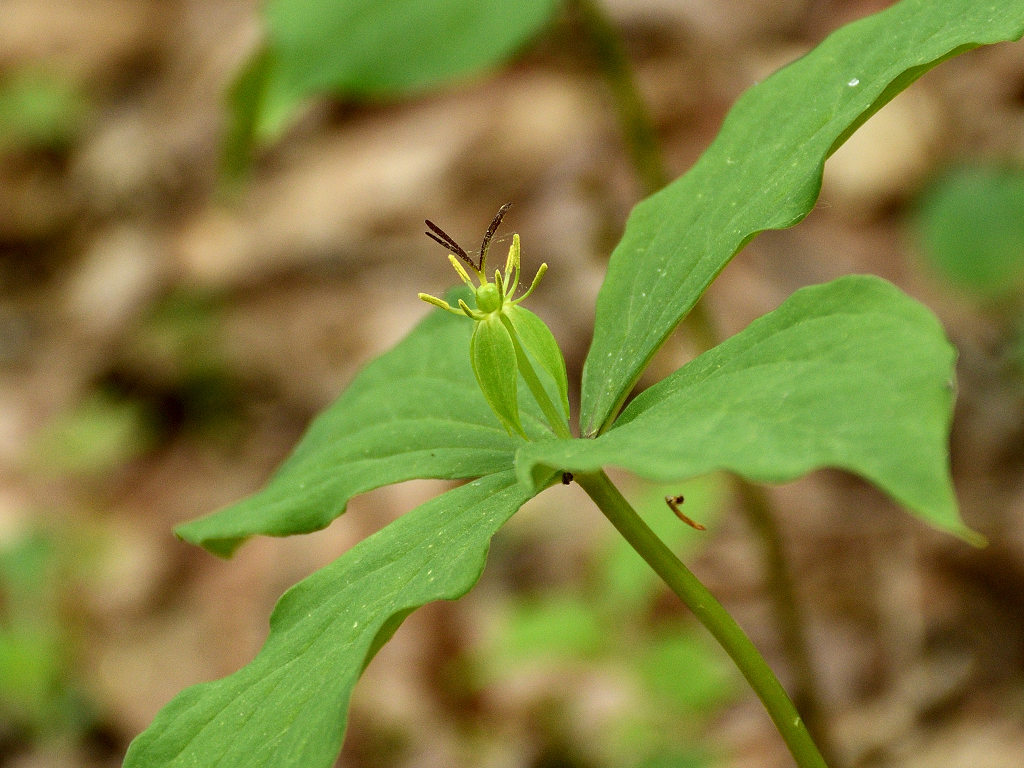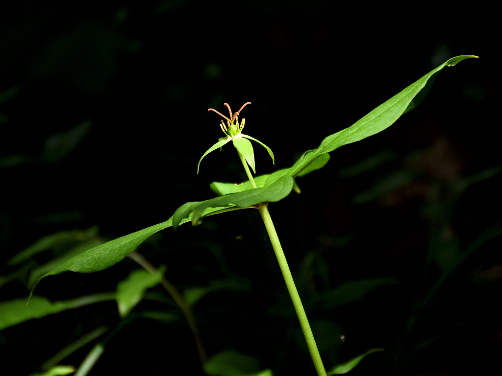 花びら4枚黄色みがかった緑色 雄しべは8本 中央に雌しべがある