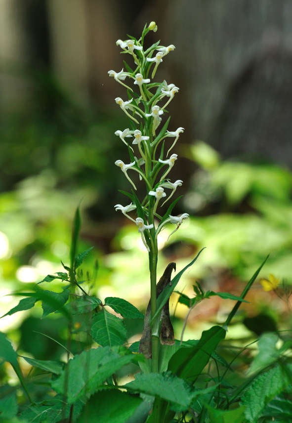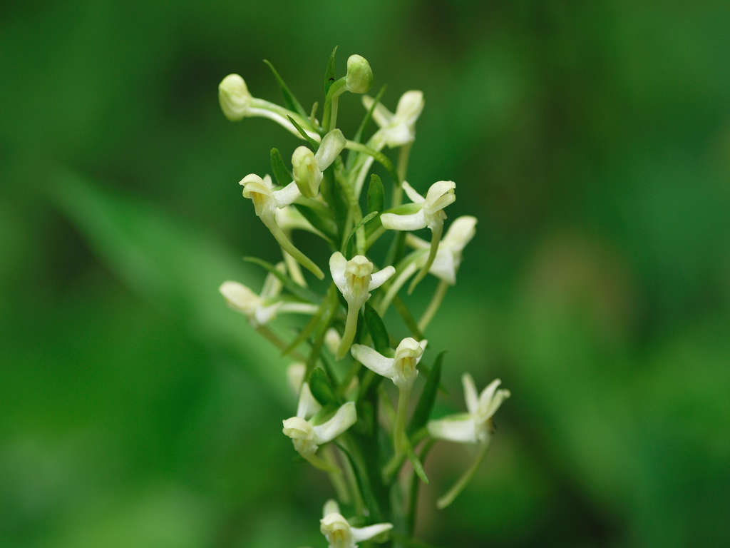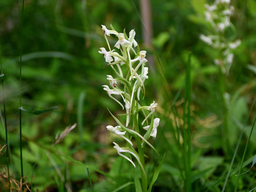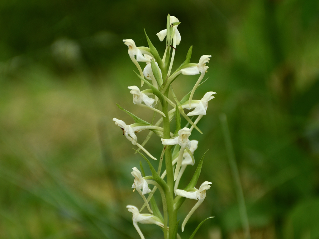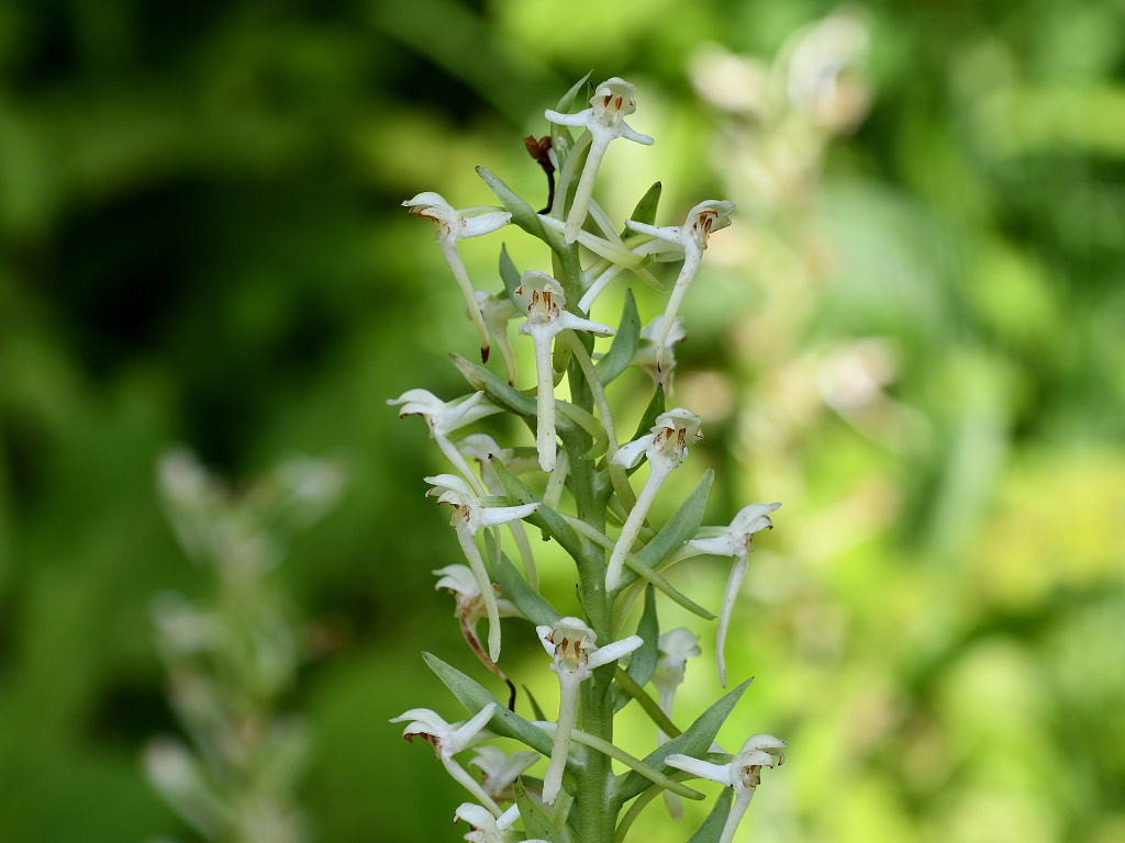 茎上部の穂状花序に白色の花をつける 長い唇弁と距、そして花より長い苞があ る