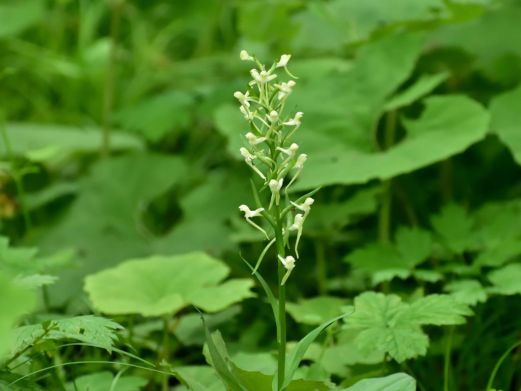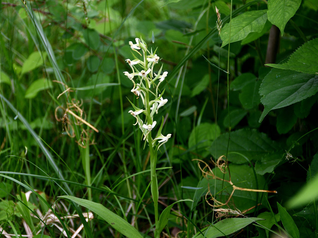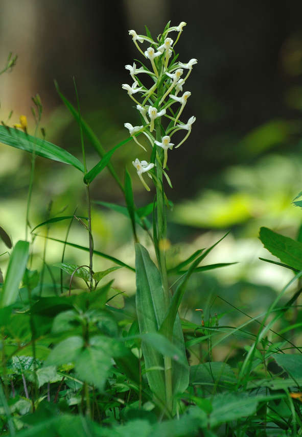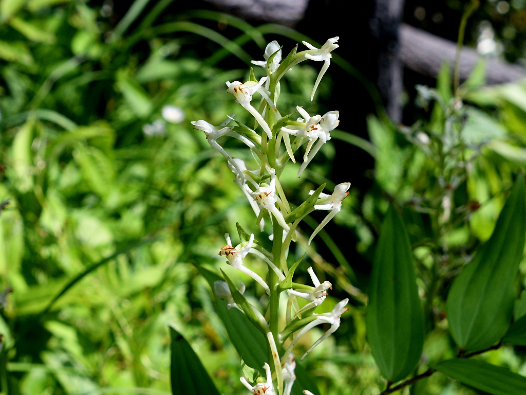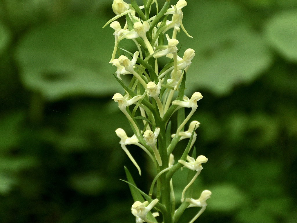 茎上部の穂状花序に白色の花をつける 長い唇弁と距、そして花より長い苞があ る