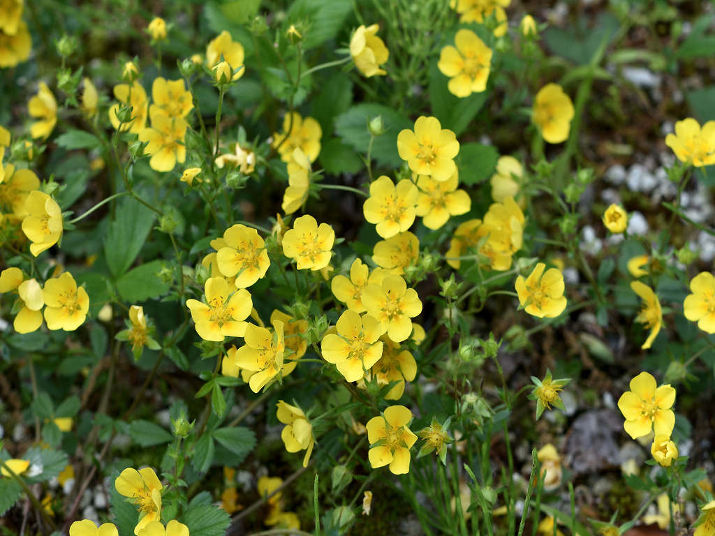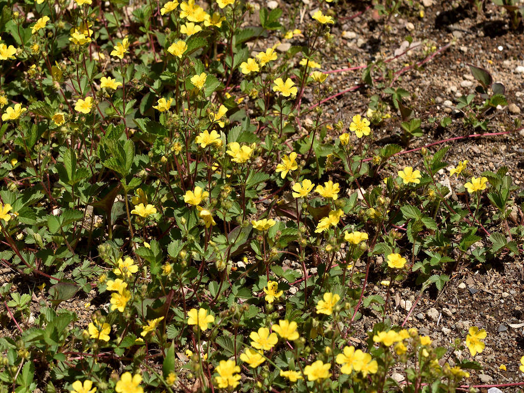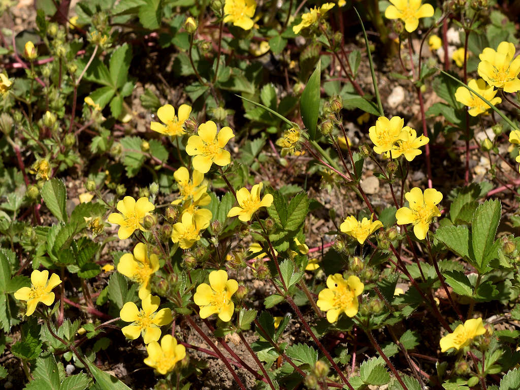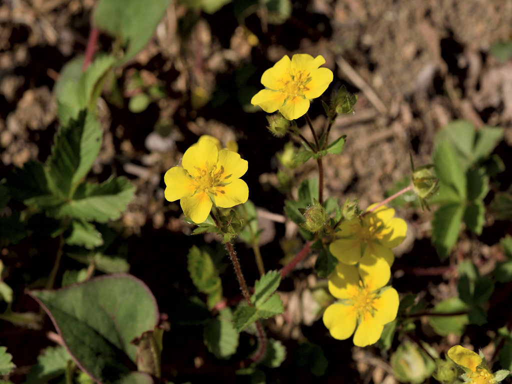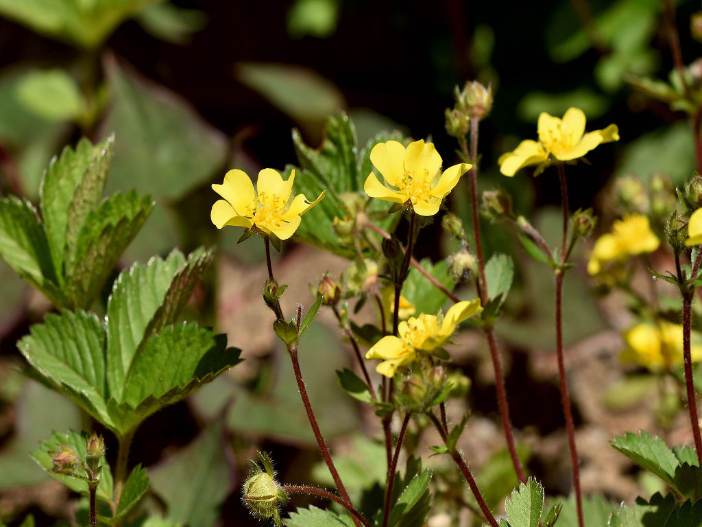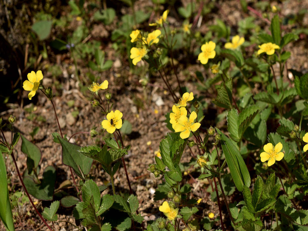 花は黄色 葉が根元から伸び花を付ける 花弁5枚 匐枝を伸ばす
