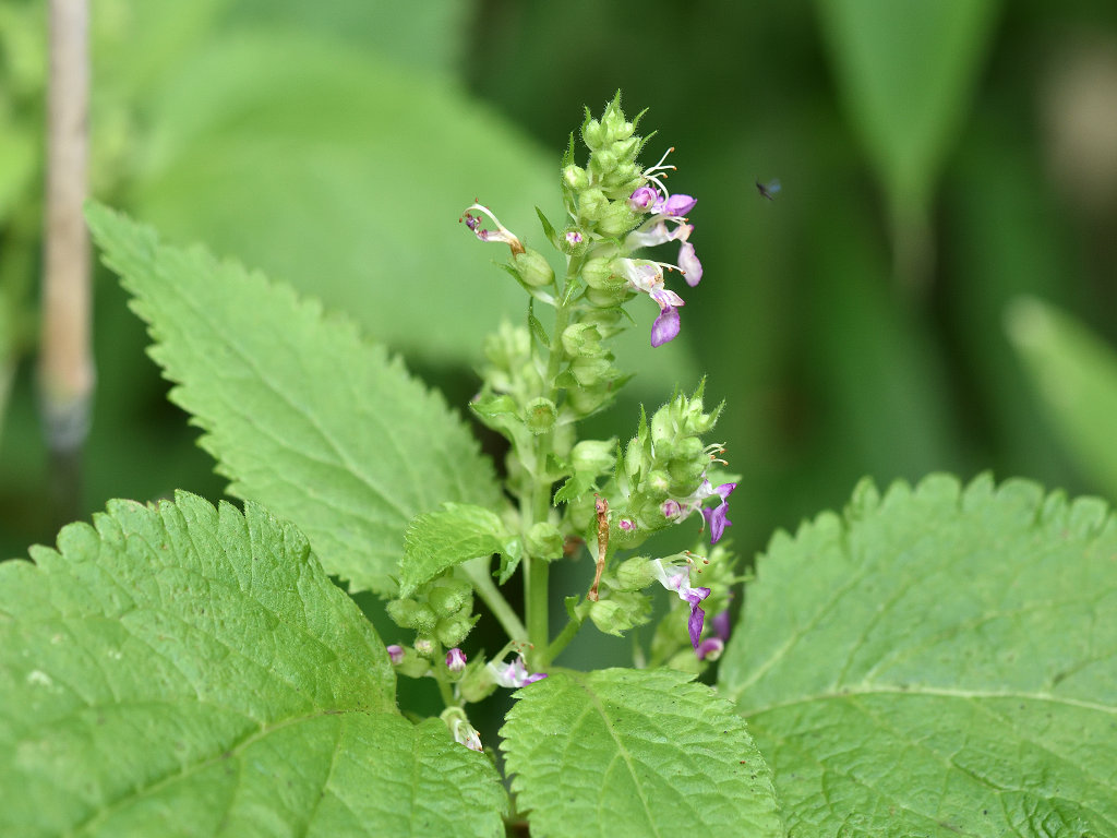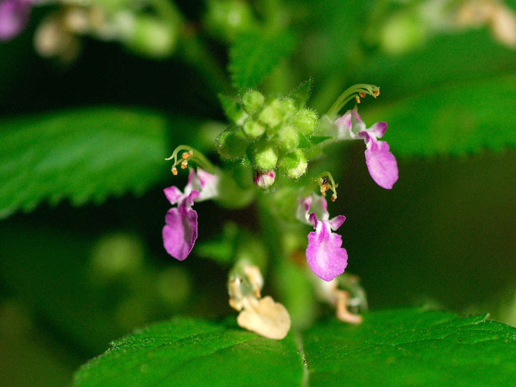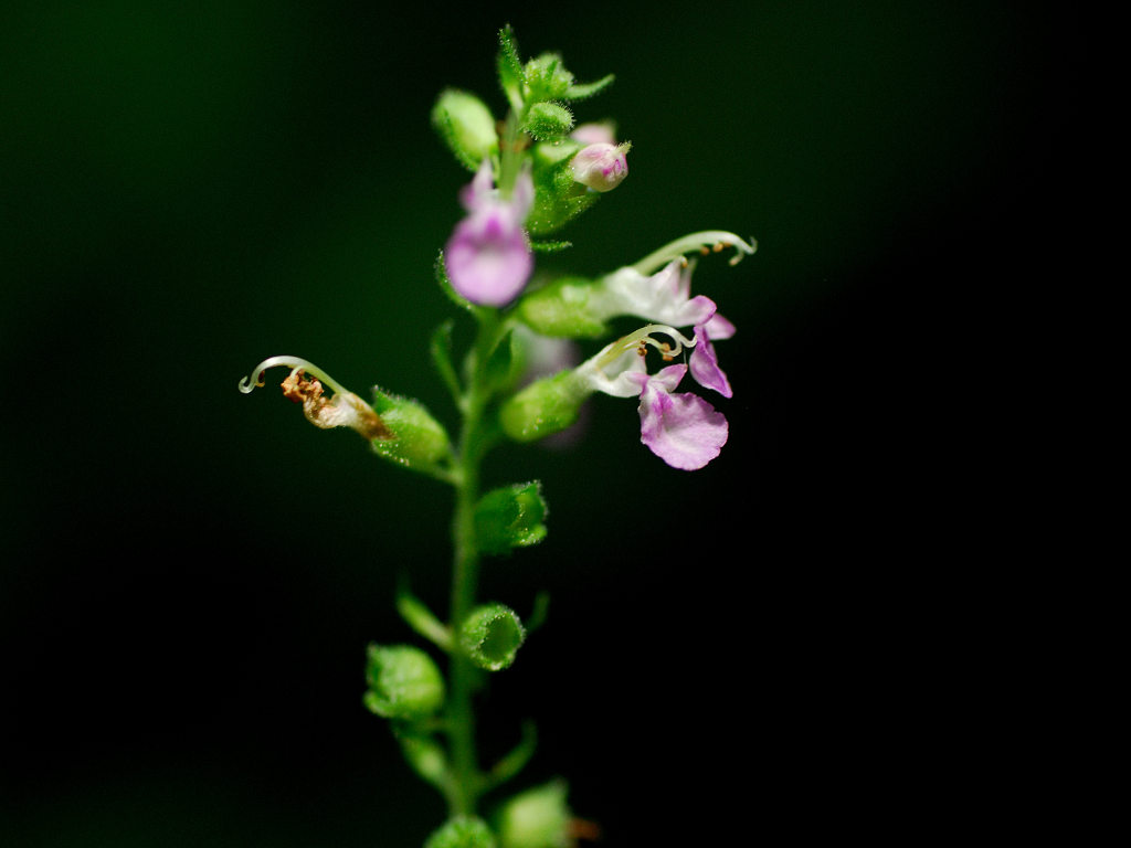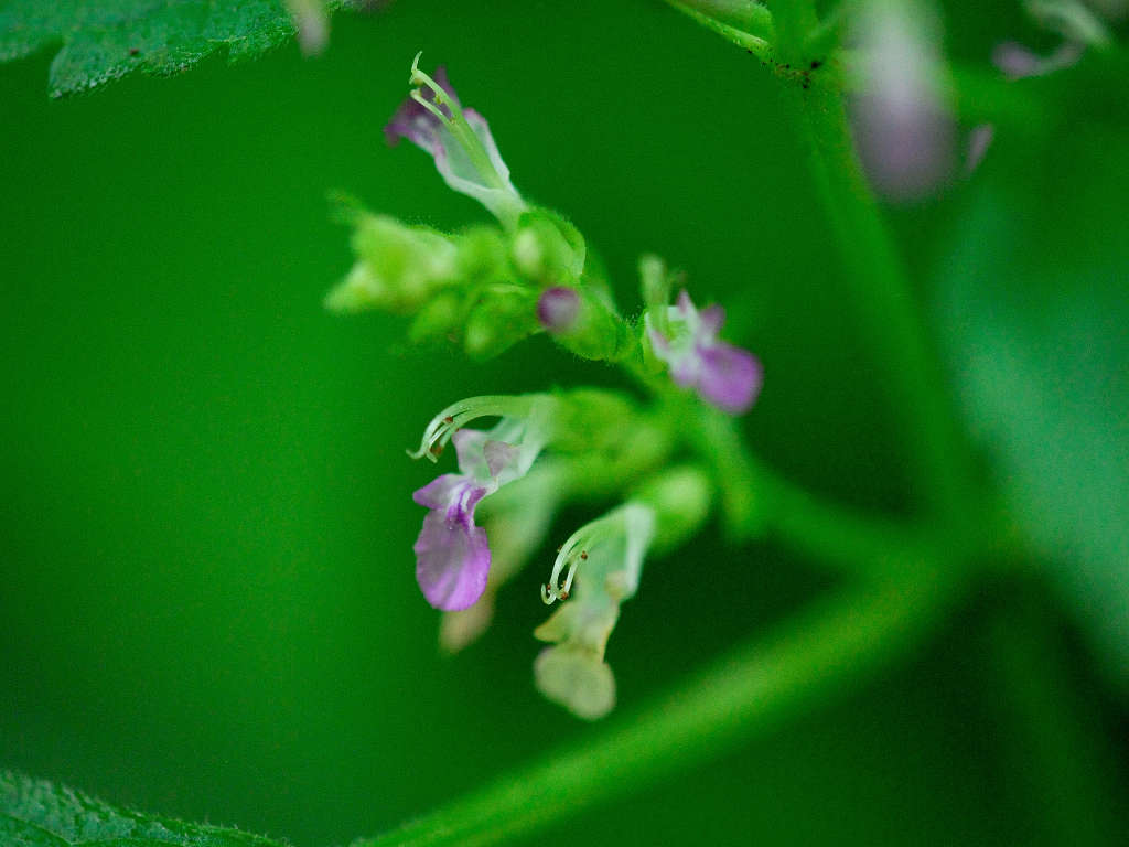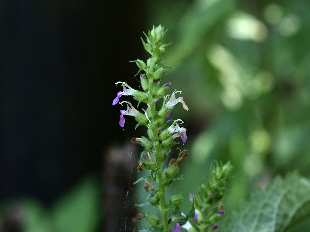 花は唇形ですが、上唇は小さく、下唇が長く突き出ててこれが目立つ このような形のためか、雄しべや雌しべが空中に何の覆いなく飛び出しているように見える 「ニガクサ」に比べ花序や萼には細かな腺毛が多い事で区別できる