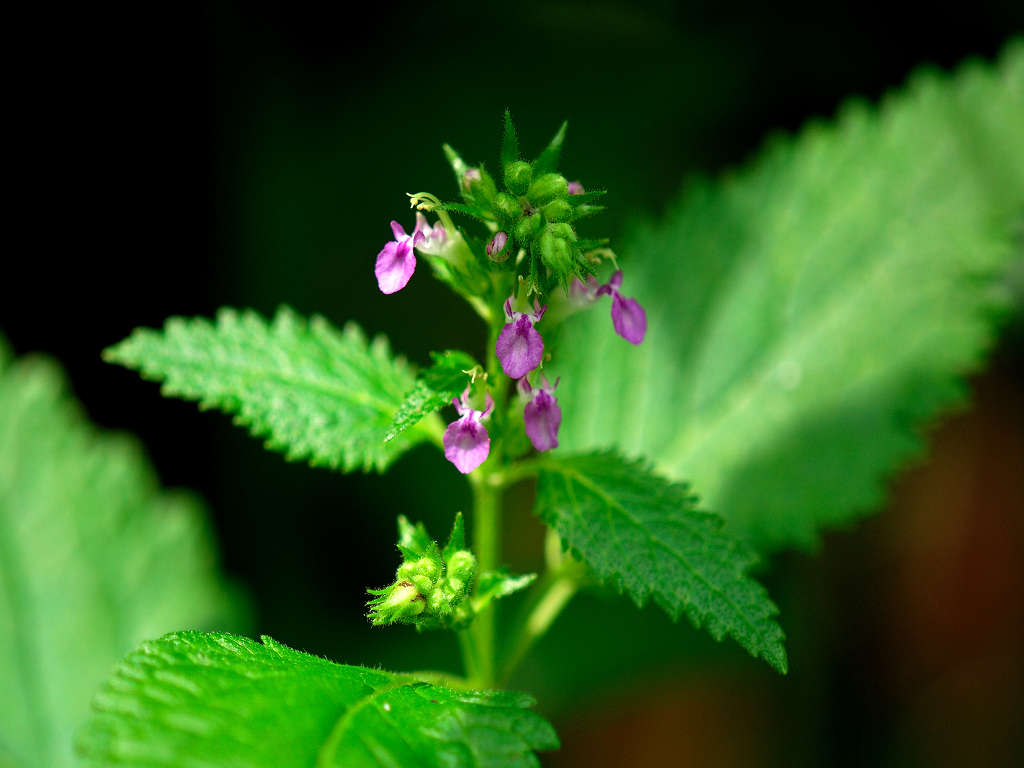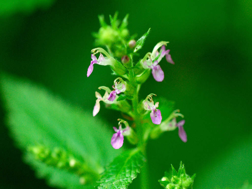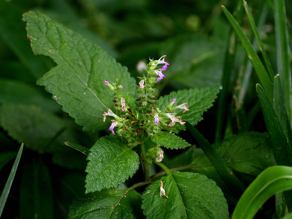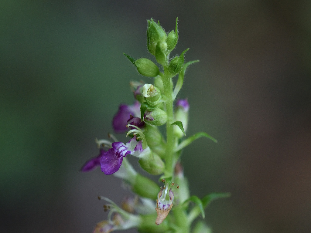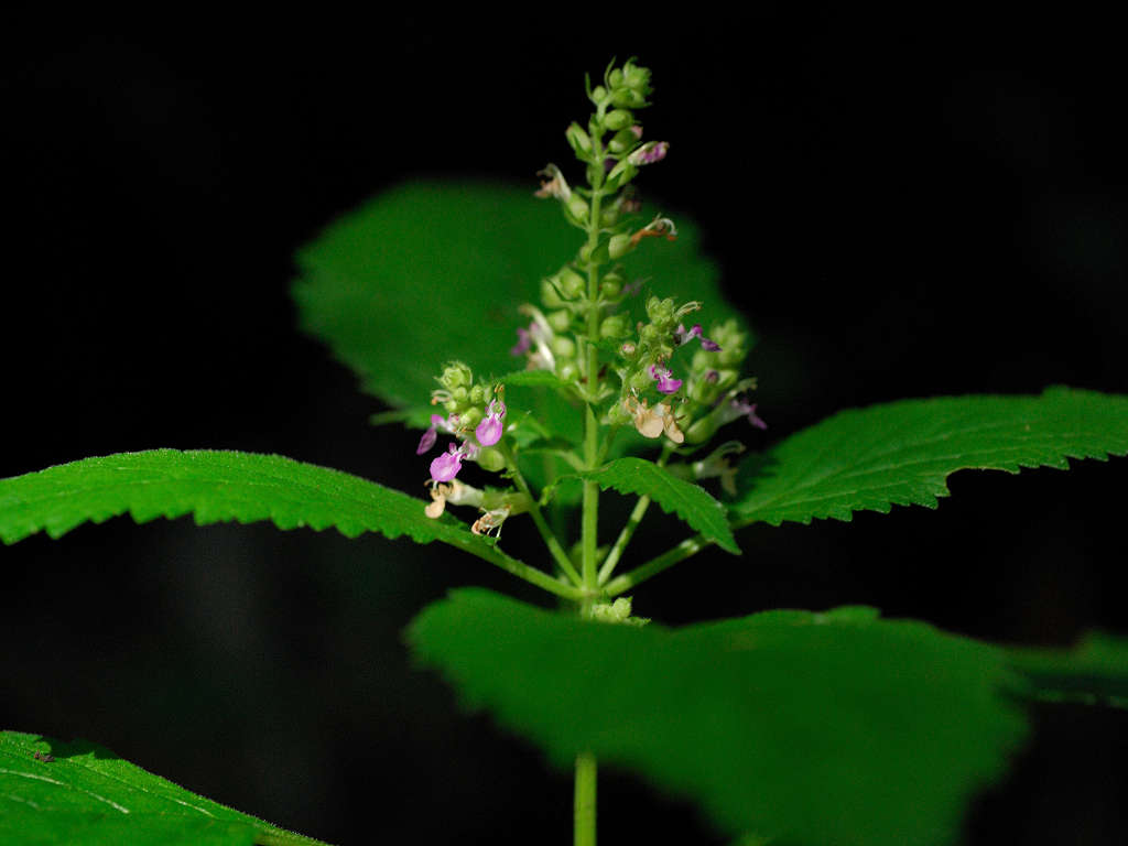 花は唇形ですが、上唇は小さく、下唇が長く突き出ててこれが目立つ このような形のためか、雄しべや雌しべが空中に何の覆いなく飛び出しているように見える 「ニガクサ」に比べ花序や萼には細かな腺毛が多い事で区別できる