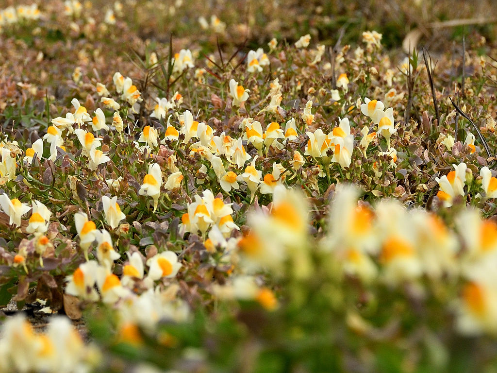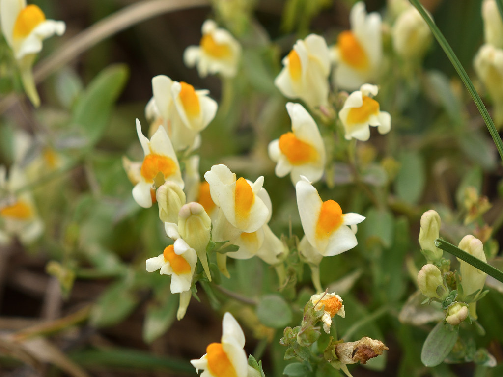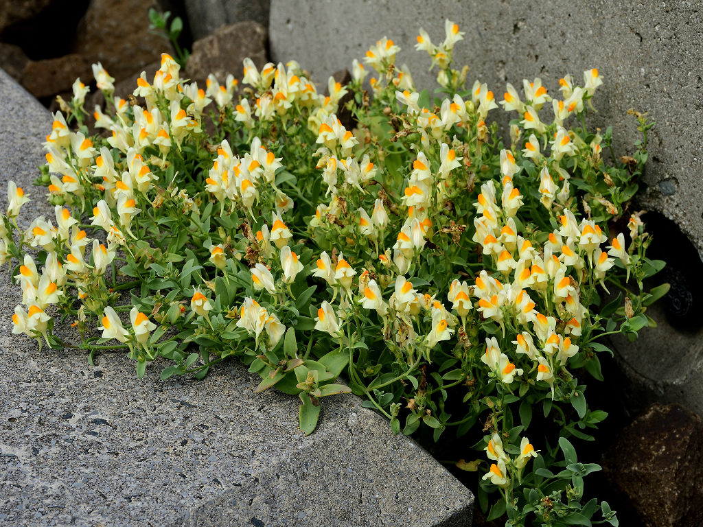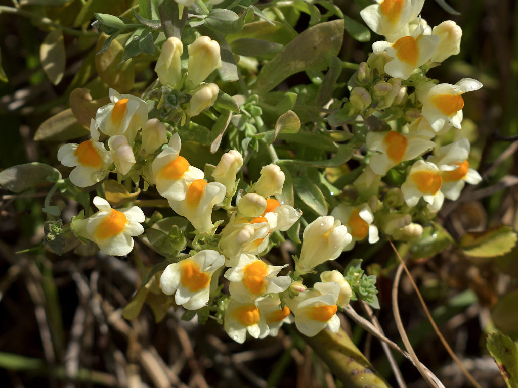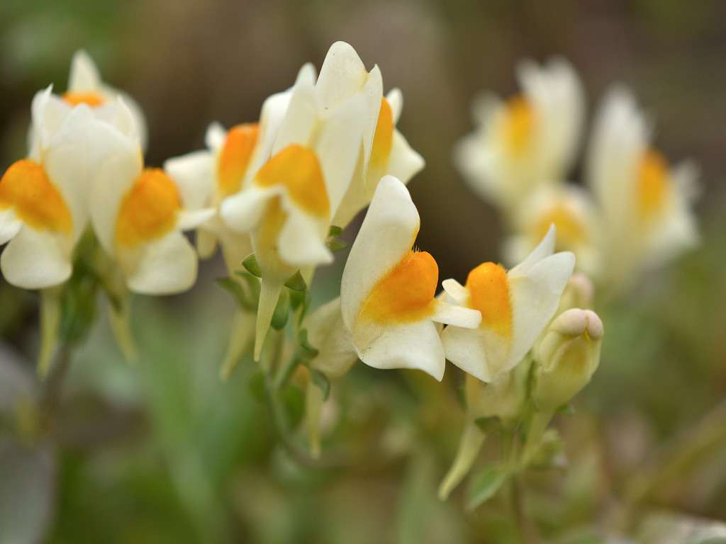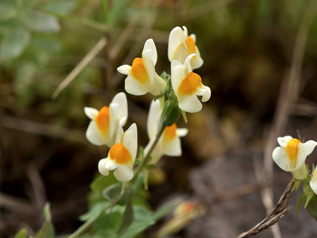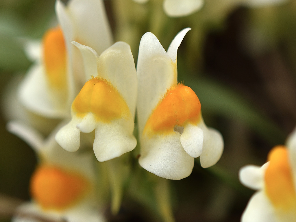 花冠は2個の上唇と、3個の下唇からなり、下唇の基部は橙色で盛り上がる。筒部の基部には細長い距がある