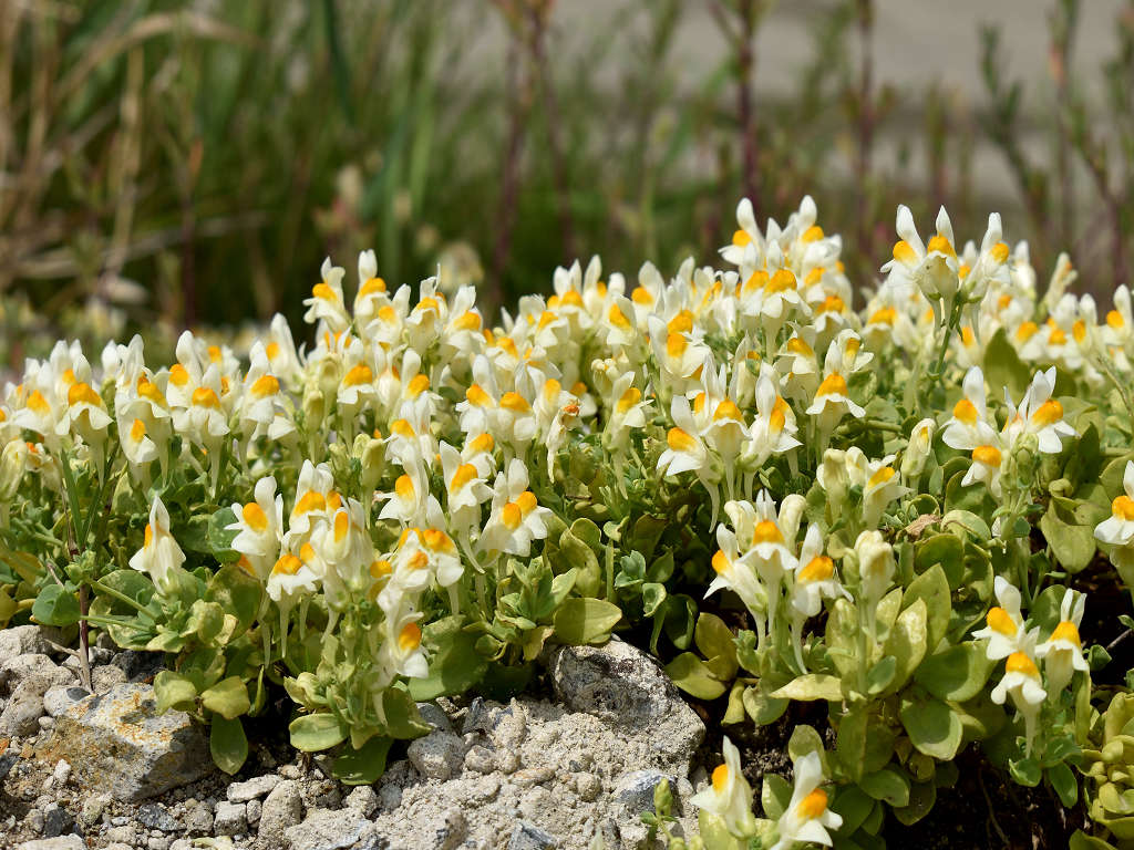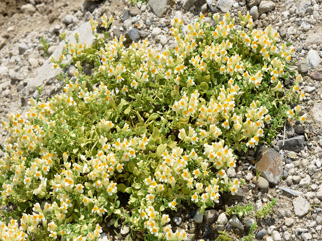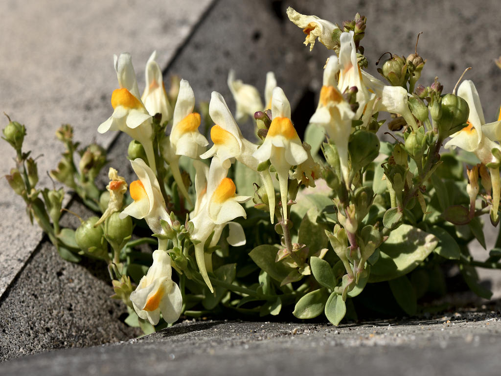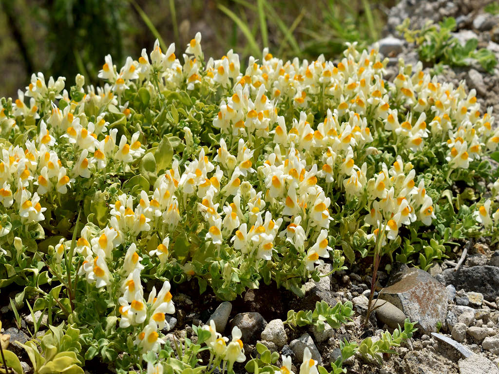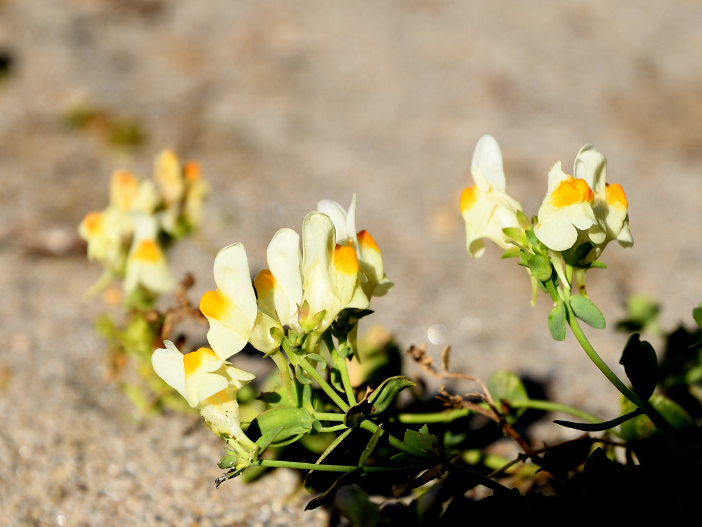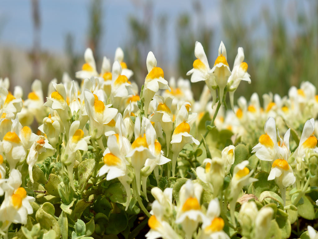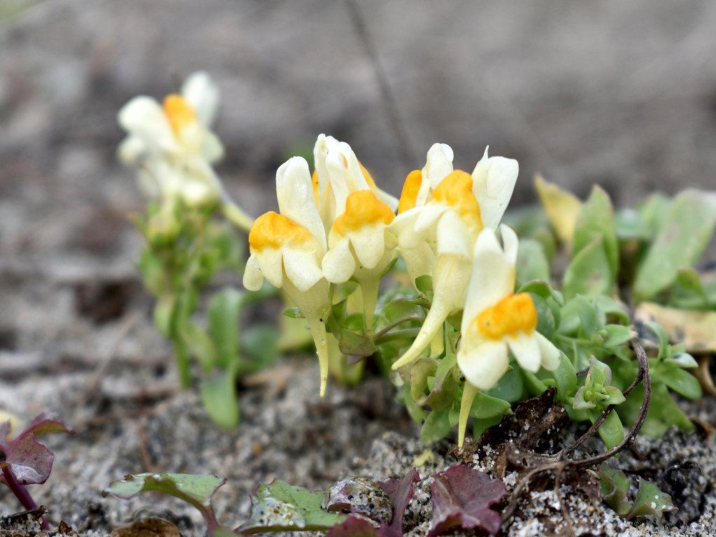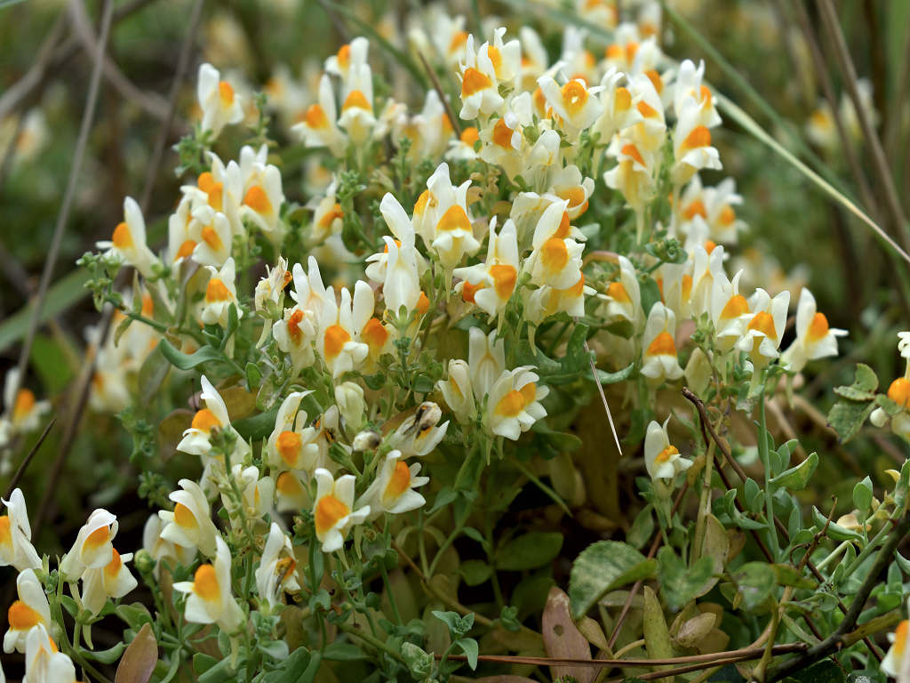 花冠は2個の上唇と、3個の下唇からなり、下唇の基部は橙色で盛り上がる。筒部の基部には細長い距がある