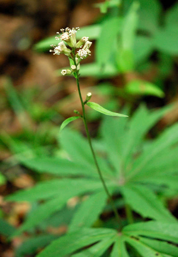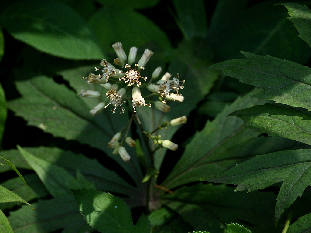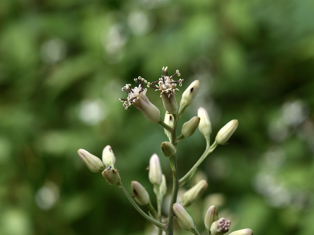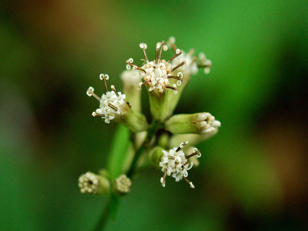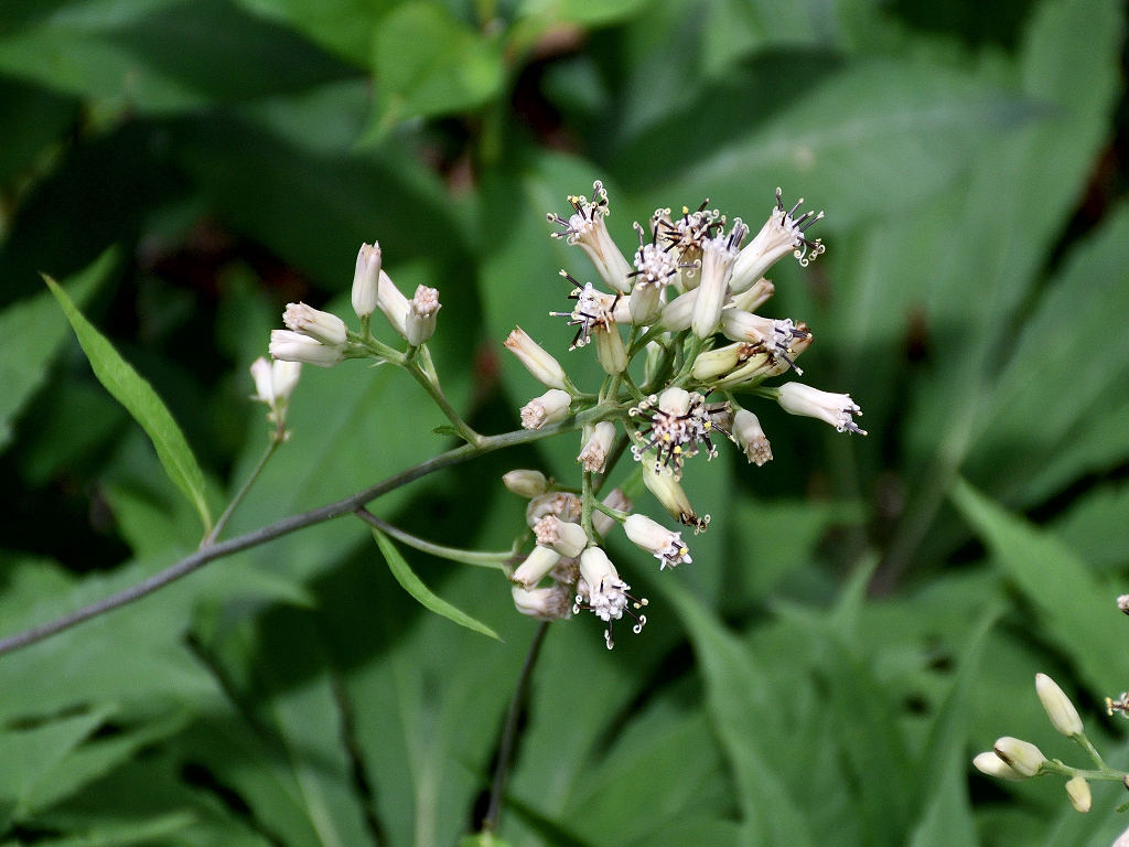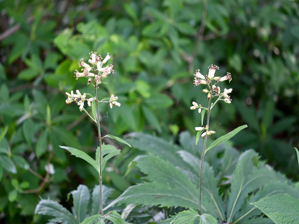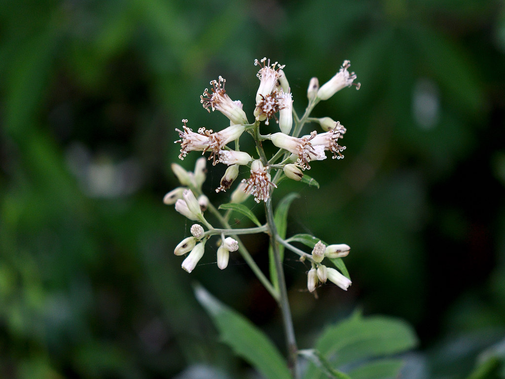 茎先に白ないし淡い紅色の花(頭花)をつける。頭花の花径は1センチくらいで舌状花はなく、先が5つに裂けた10個くらいの筒状花からなる。 花から雄しべが飛び出す