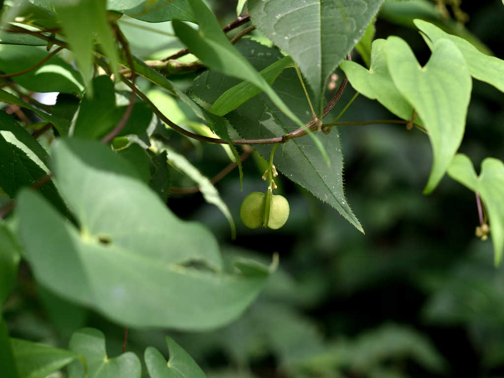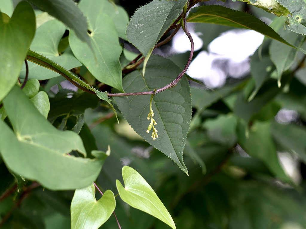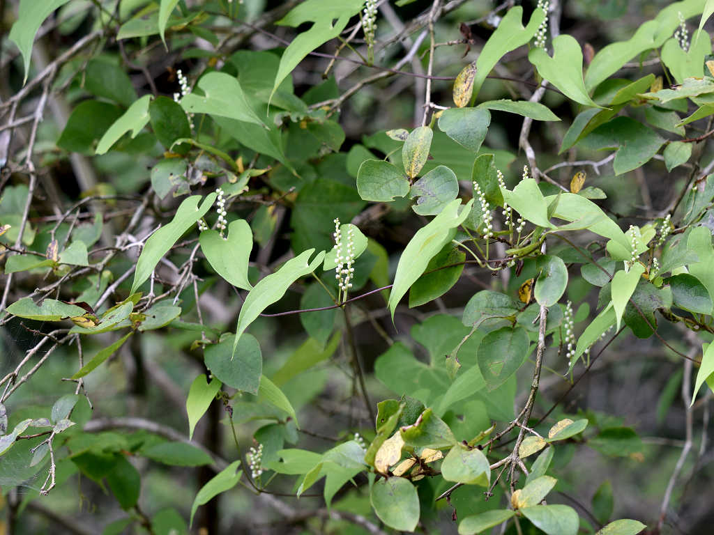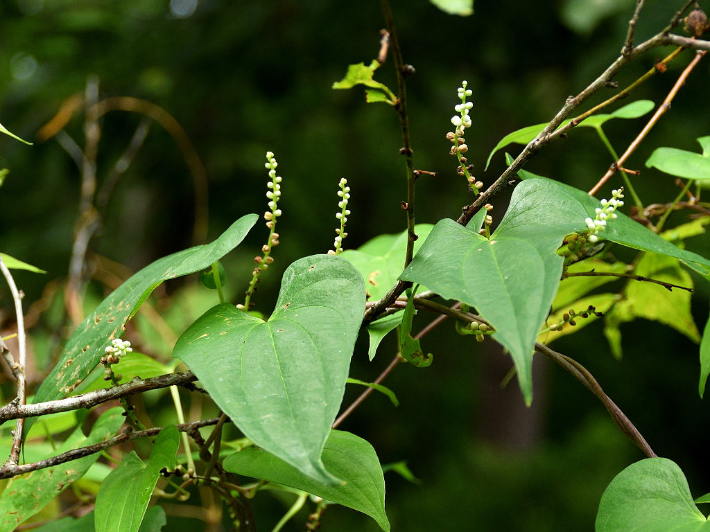 茎は樹木などに巻き付く 花序が立ち上るのは雄花で雄株 垂れ下がって咲くのは雌花で雌株