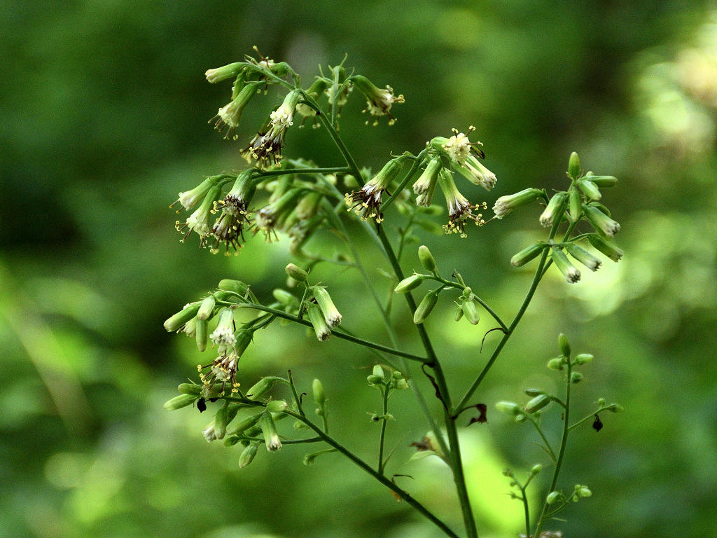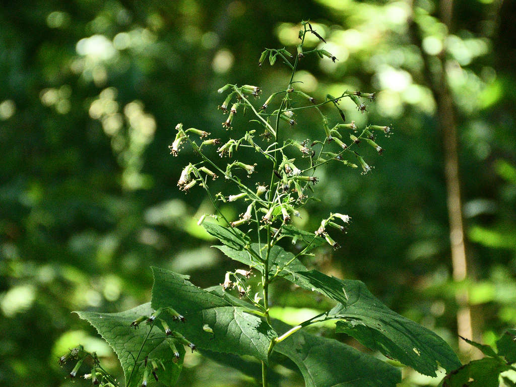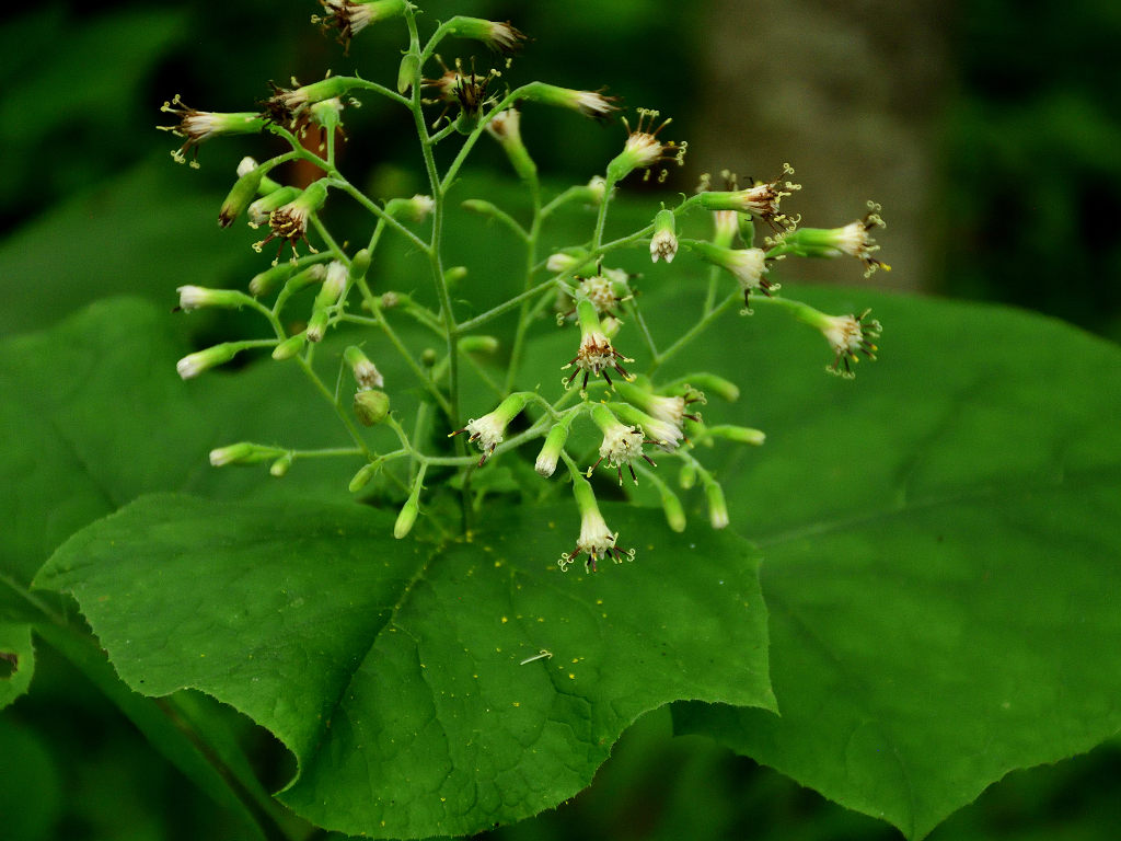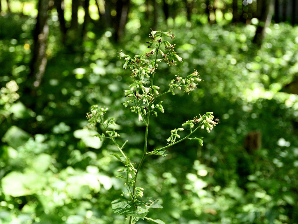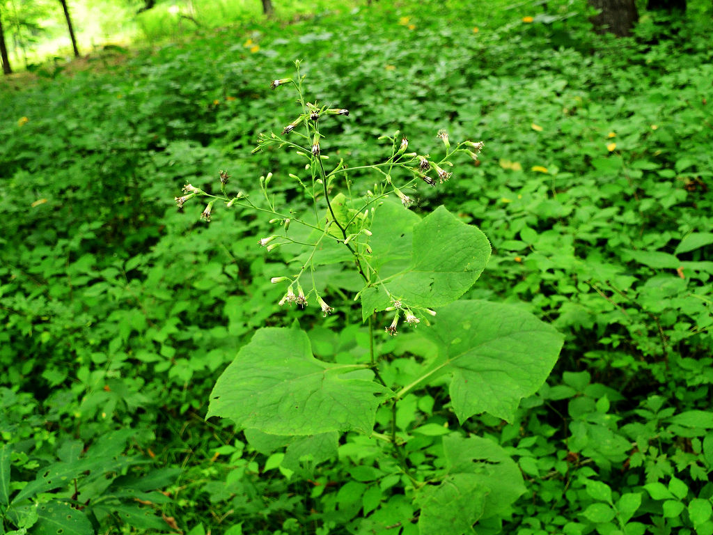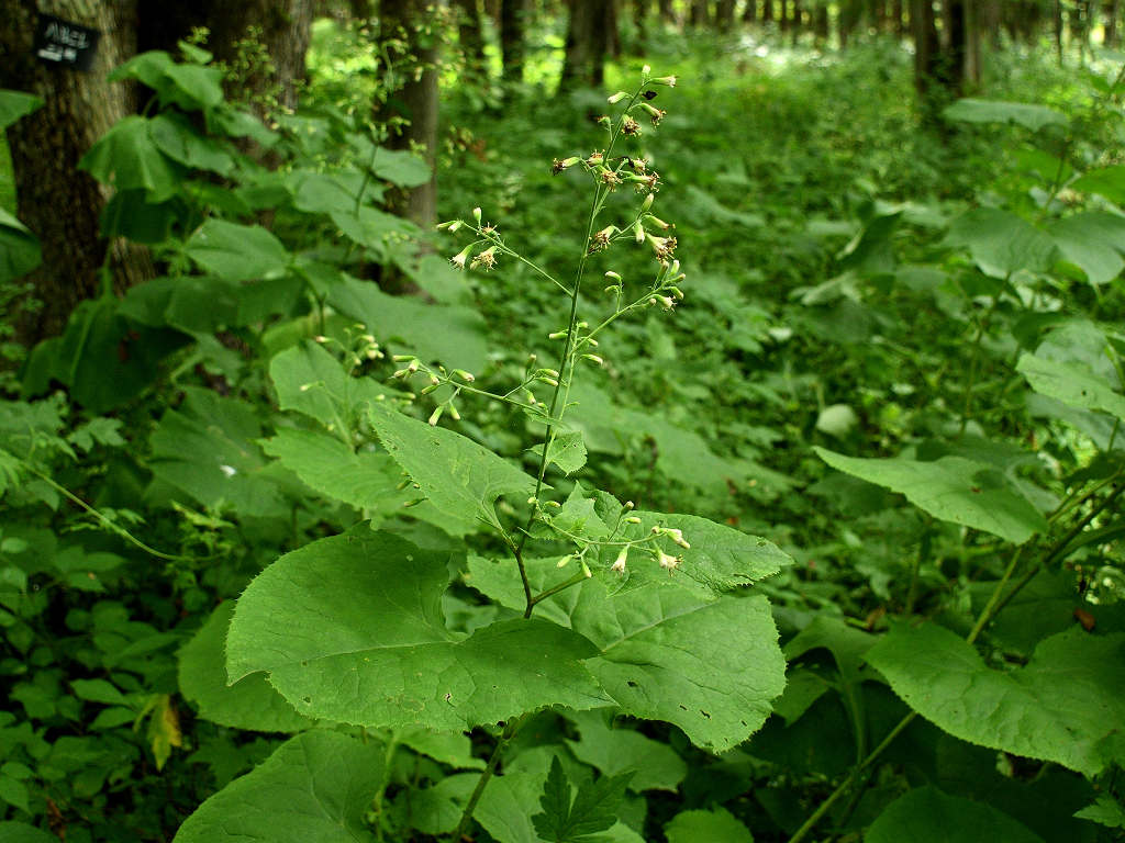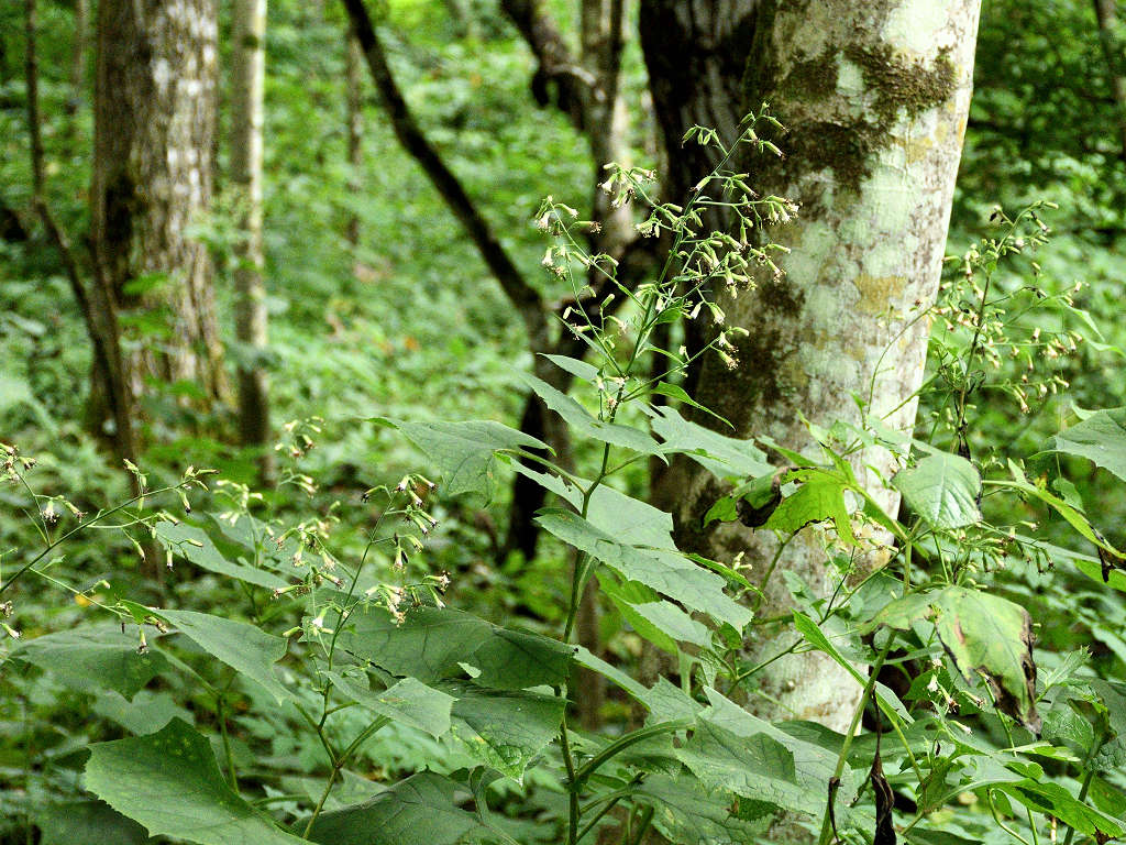 茎は直立し2メートルになることも、葉は三角上で互生 茎頂に円錐状の花序があり多数の花を付ける