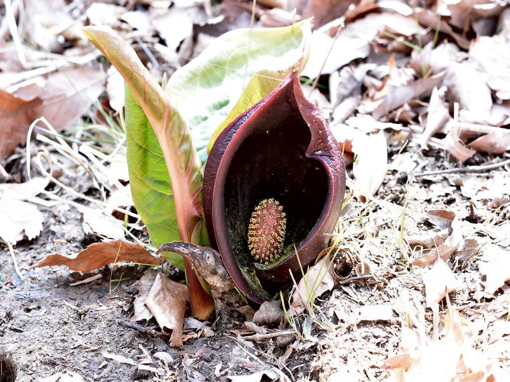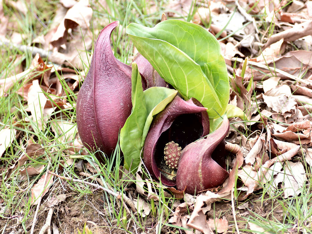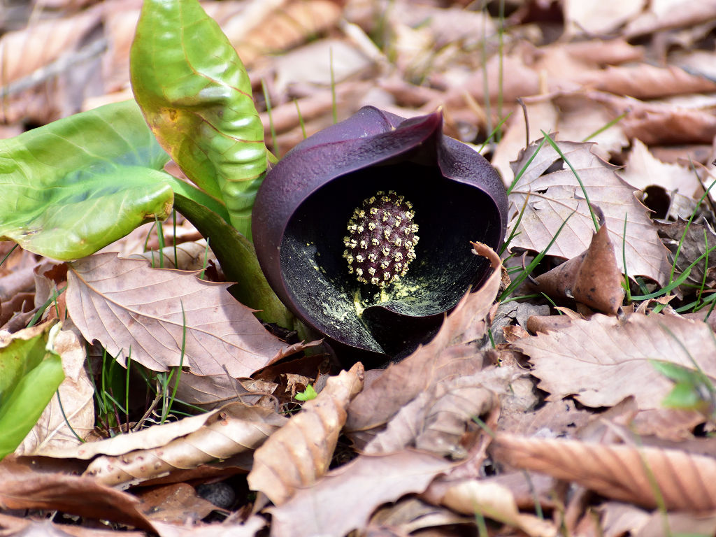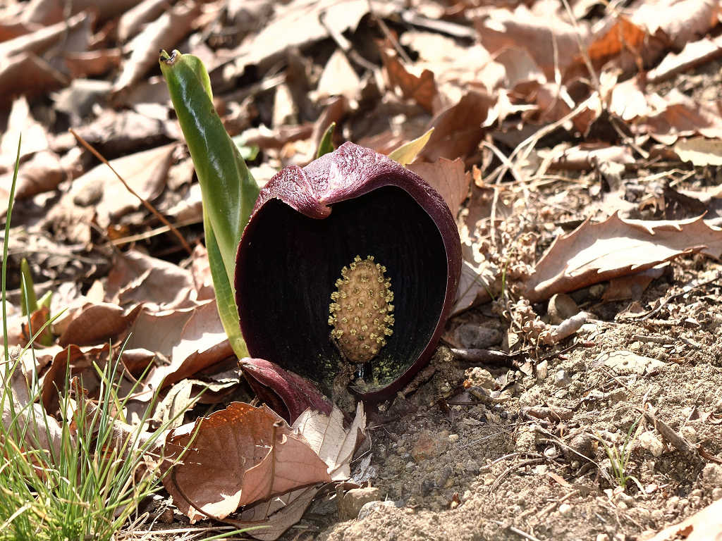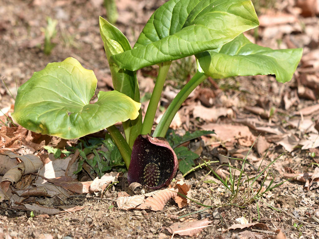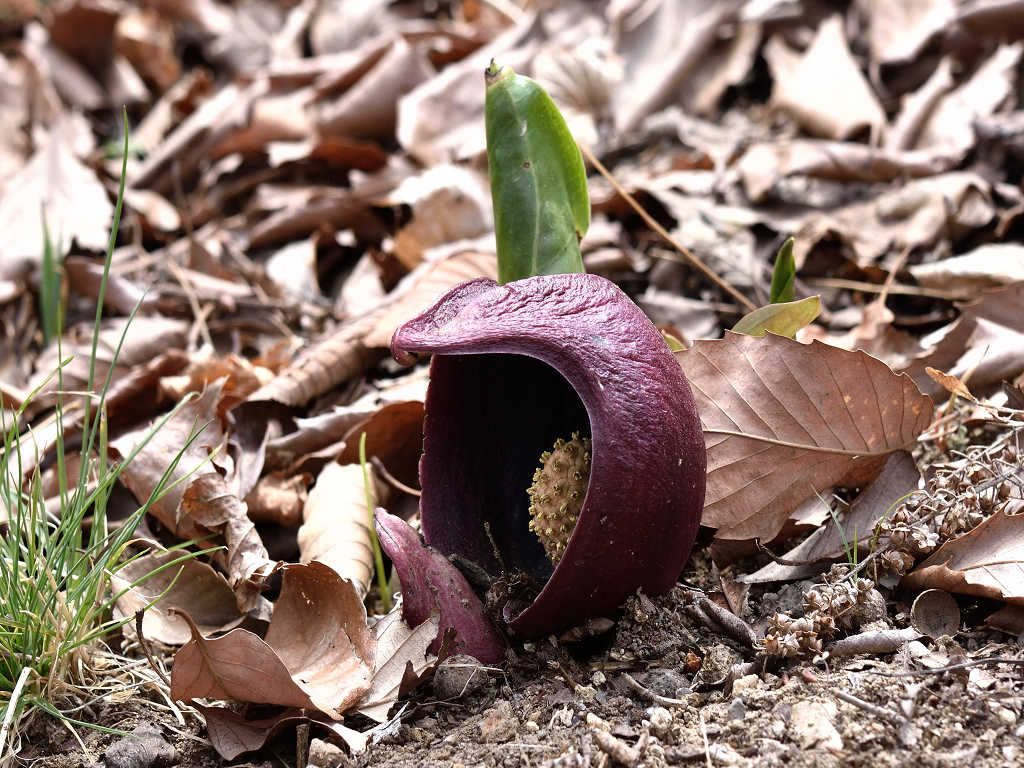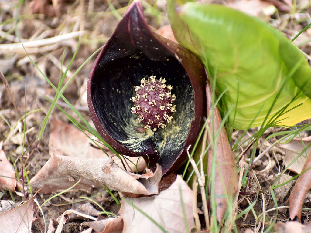 頭巾形の花弁に見えるのが仏炎包 中に花の集団がある